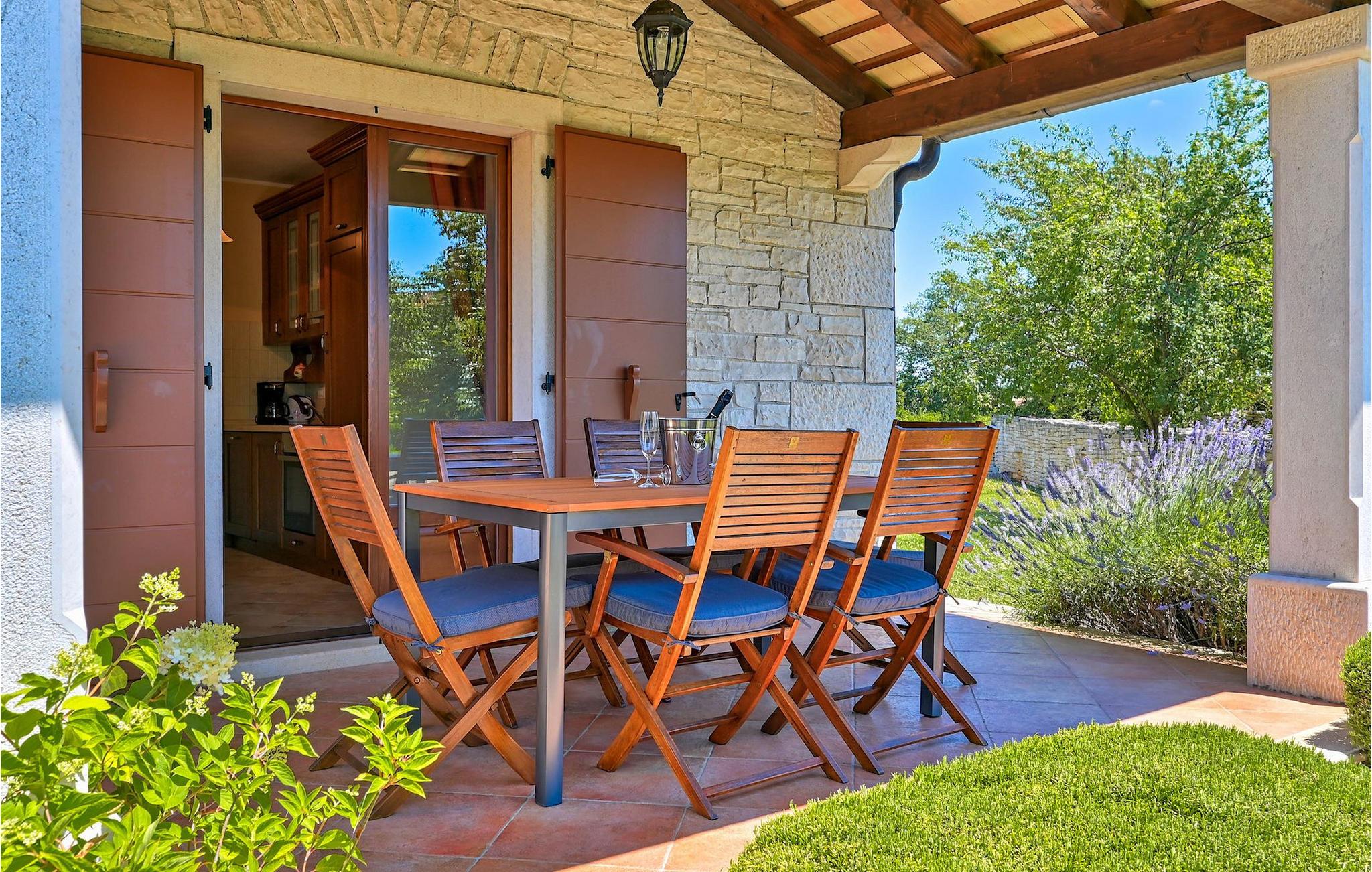 Villan ligger i ett lugnt och privat läge strax utanför och ändå en kort promenad från byn Kringa. Kringa ligger i centrala Istrien, fem kilometer söder om Tinjan. Regionen är känd för sitt kök och sina viner och det finns många bra restauranger i närheten. Det inre av Istrien med bergsbyar och vackra landskap är perfekt för bilkörning, cykling och vandring. Den adriatiska kusten och den berömda turiststaden Porec, Istriens alla stränder, ligger bara en kort bilresa bort.