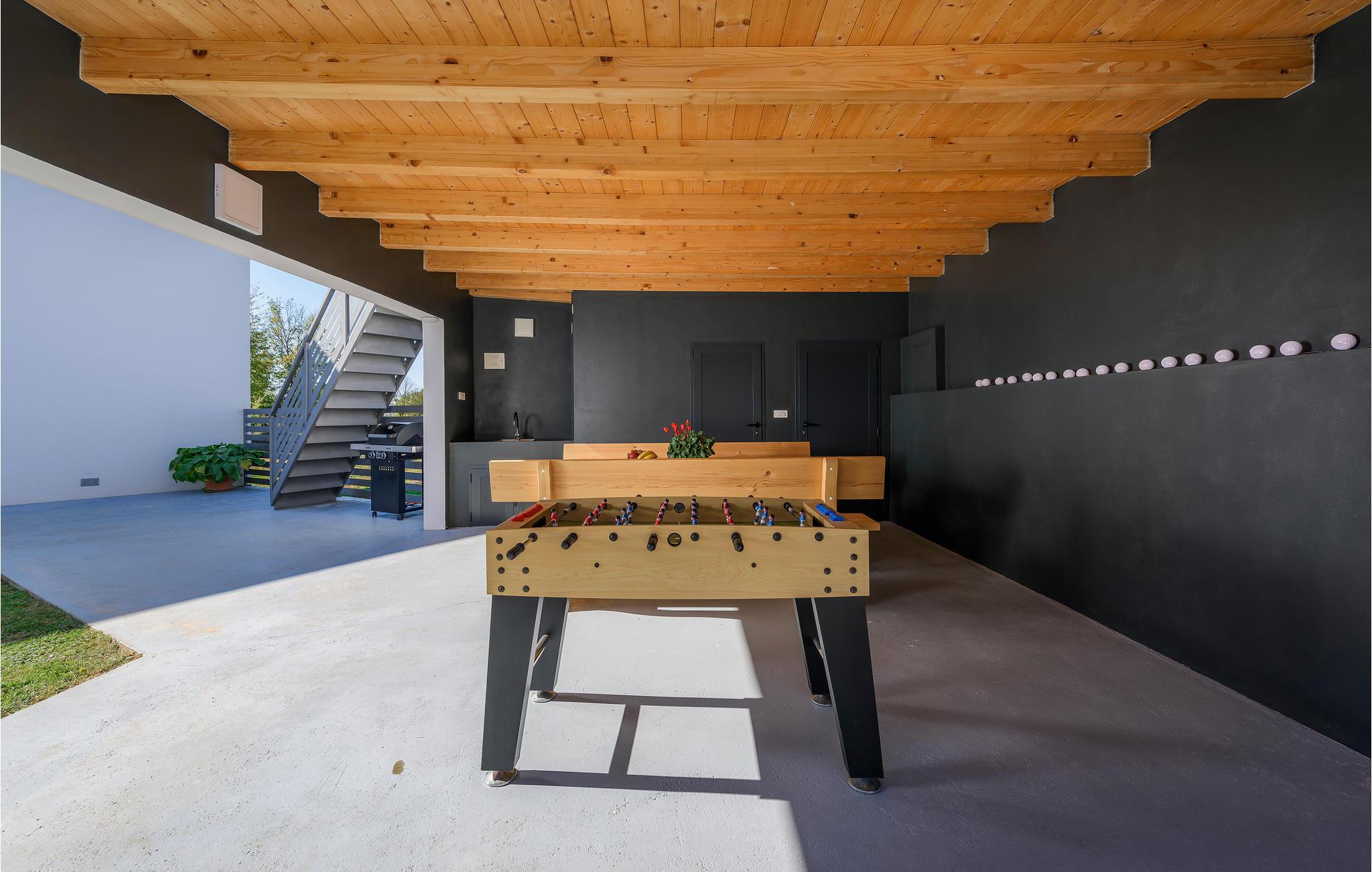 På fastigheten hittar du en smart konstruerad solterrass som ligger på en upphöjd plattform. I skuggan nedanför finns en mysig loungedel med picknickbord och bordfotboll. Alldeles intill skvalpar poolen iväg.