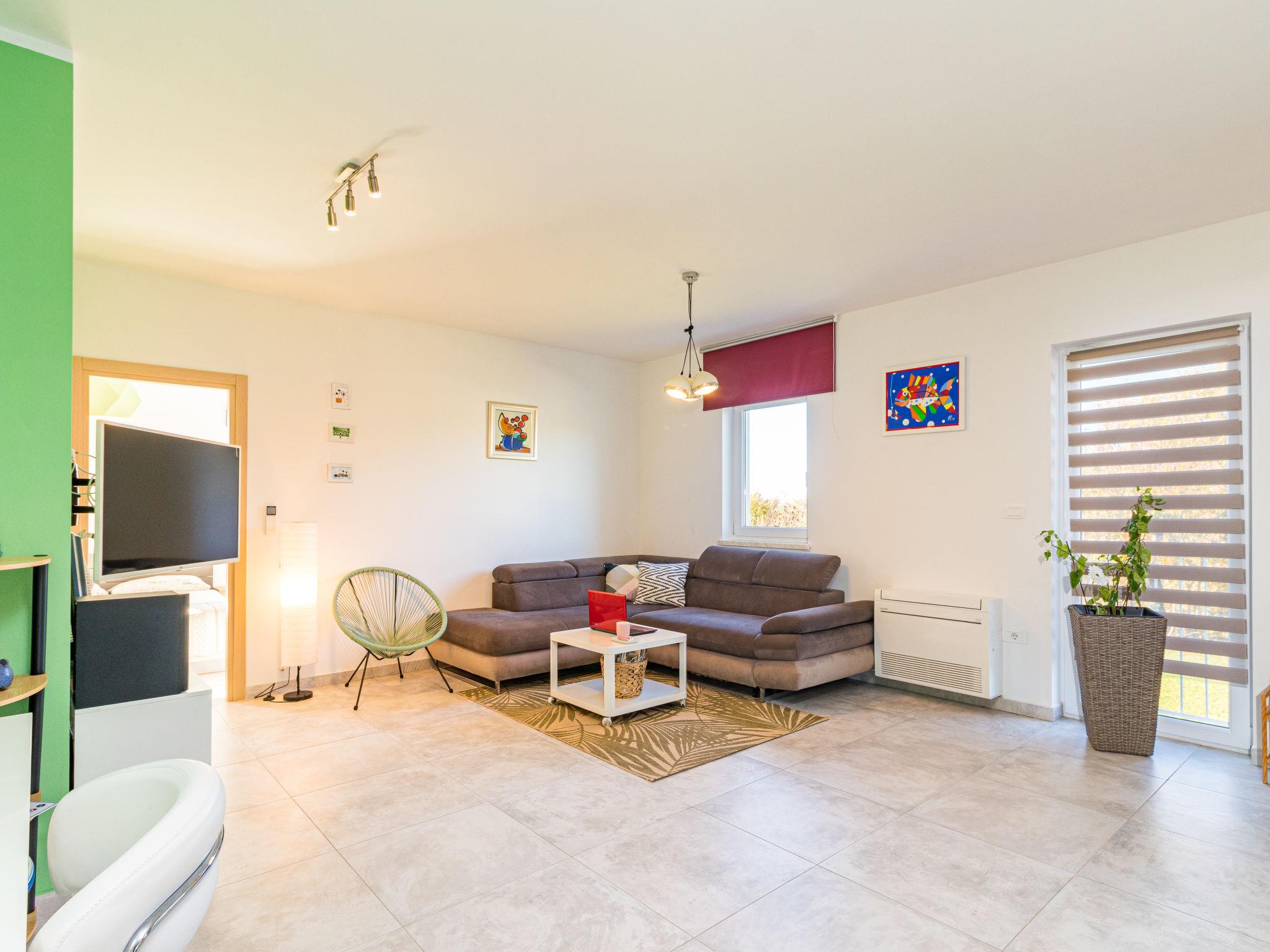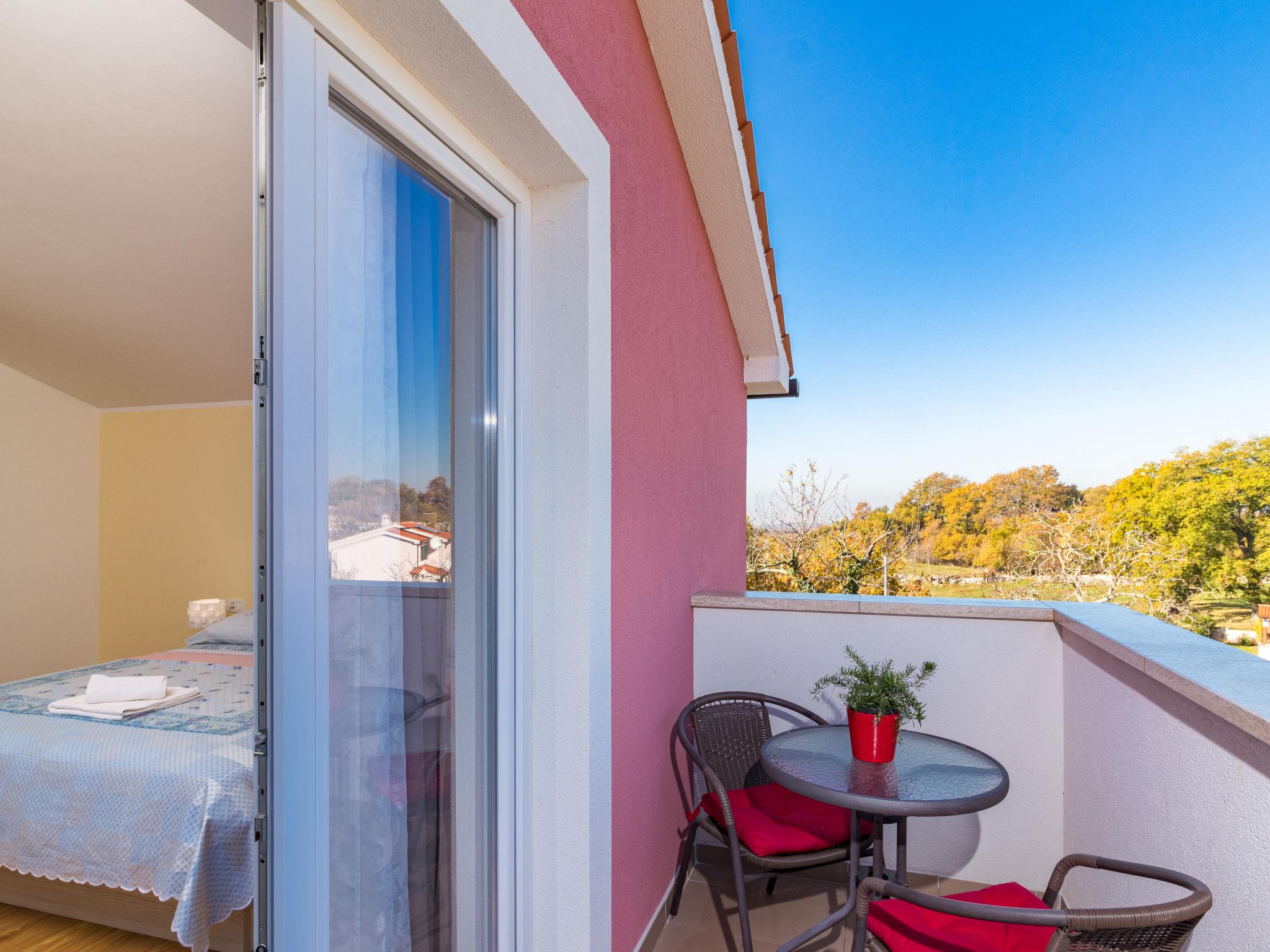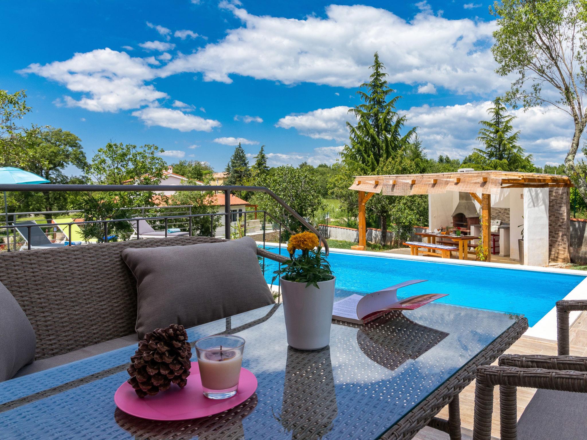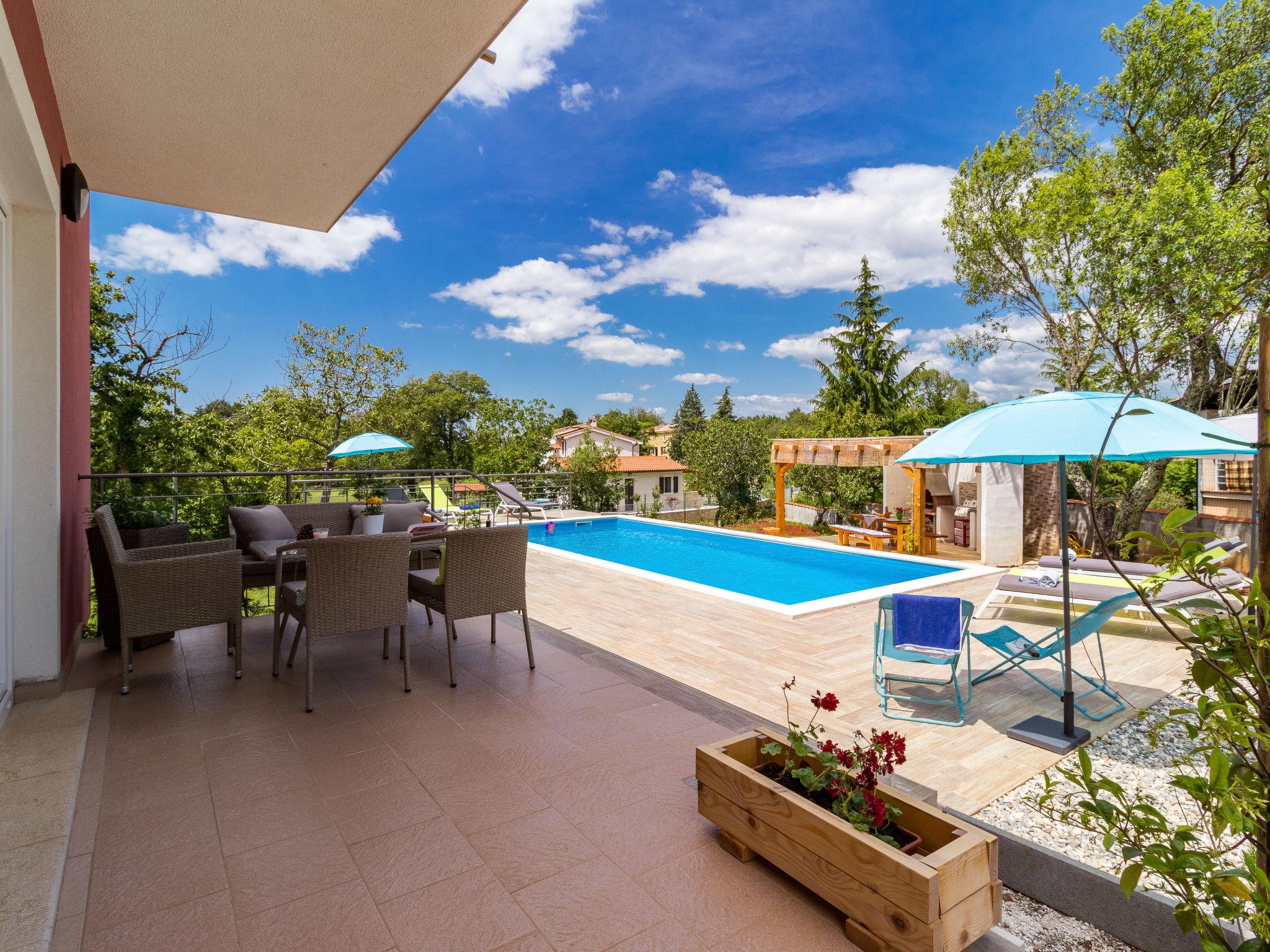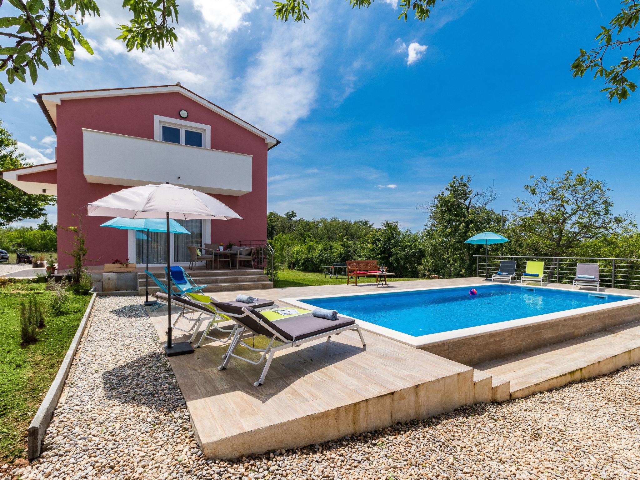 Beautiful single-family house "Villa May", 2 storeys, built in 2018. In the hamlet Cervari 3 km from the centre of Tinjan, 14 km from the centre of Pazin, 16 km from the centre of Porec, in a quiet, sunny position, 16 km from the sea. Private: property 1'900 m2 (fenced), lawn 1'000 m2 trees, swimming pool angular, heated (9 x 4 m, 37 m2, depth 140 cm, seasonal availability: 03.Apr. - 09.Oct.) with internal staircase. Outdoor shower, table tennis, volleyball, terrace (50 m2), garden furniture, barbecue, pool maintenance by the owner/gardener. In the house: internet access, washing machine. Motor access to the house (50 m via unmade road). Parking (for 4 cars) on the premises. Shop 3 km, supermarket 14 km, restaurant 2 km, bus stop 1 km, pebble beach 16 km, concrete beach 16 km. Walking paths from the house 200 m. Nearby attractions: Adventure park 5 km. Groups of teenagers on request only. Please note: airfield 52 km from the property.