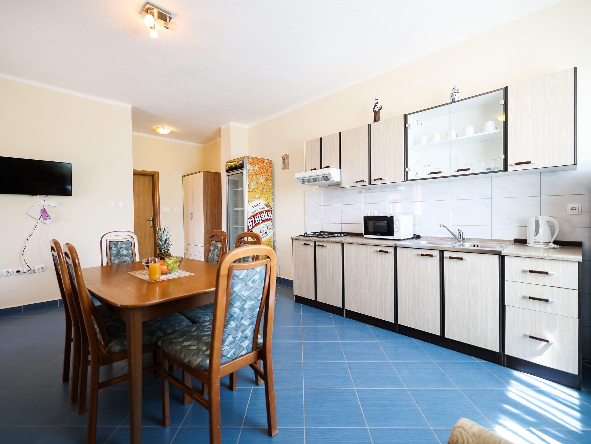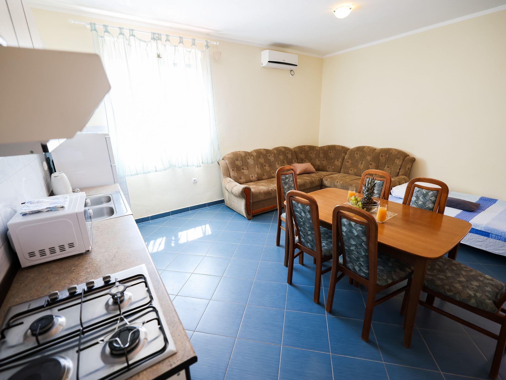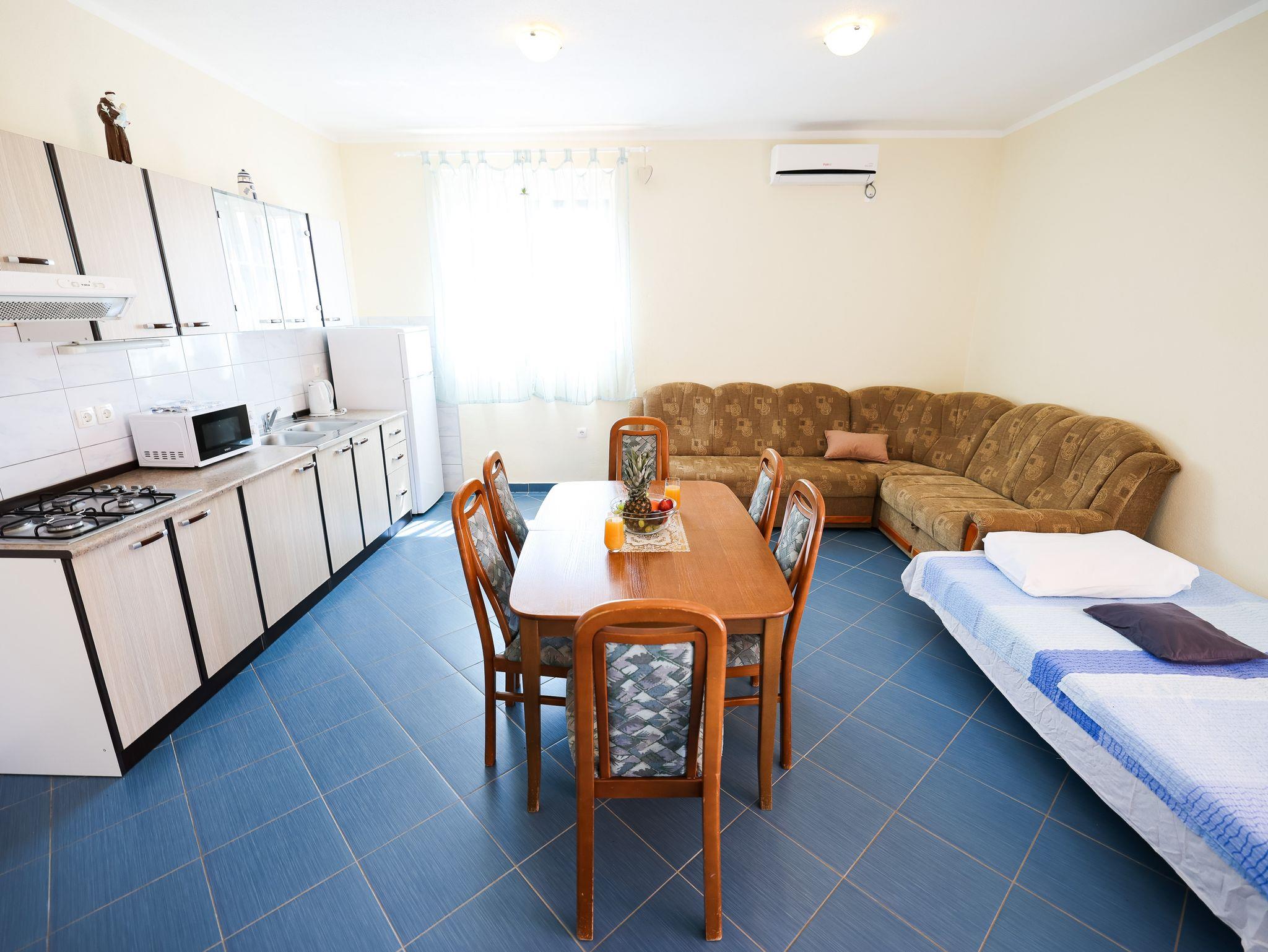 Ferienwohnung bietet Platz für 4 Gäste. Die Betten sind in Schlafzimmern, die es 1 gibt, und in Wohnzimmer, innerhalb einer Gesamtfläche von 58m2, angeordnet. Die Gäste haben eine eigene Terrasse zur Verfügung, auf der sie in warmen Sommernächten genießen können. Das Apartment bietet Meerblick. Für vollen Genuss und Entspannung gibt es einen privaten Grill für Gäste dieser Unterkunft. In der Unterkunftseinheit besteht die Möglichkeit des Mitbringens von Haustieren gegen Aufpreis. IM PREIS INBEGRIFFEN: Kurtaxe, Endreinigung, Klimatisierung, Parkplatz, Internet, Föhn. UNVERBINDLICHE ZUSÄTZLICHE KOSTEN: Wäschewaschen (10,00 € Waschen), Haustiere (8,00 € pro Nacht). Die Verfügbarkeit zusätzlicher Dienstleistungen in Ihrem reservierten Termin und die Preise derselben (falls nicht aufgeführt) müssen im Voraus überprüft werden. Zusätzliche Dienstleistungen die in der Zahlungsaufforderung nicht aufgeführt sind werden direkt beim Vermieter bezahlt, angenommen der Gast nutzt auch diese.