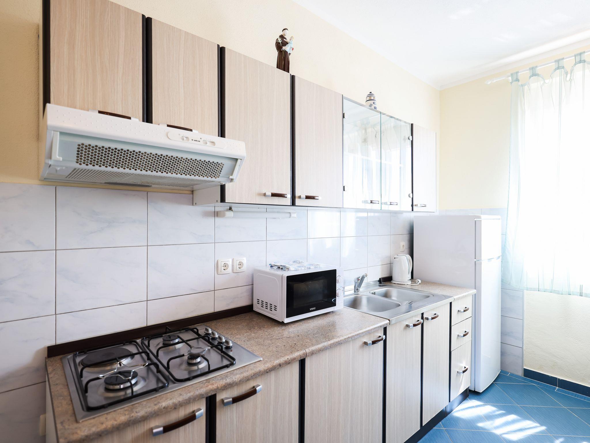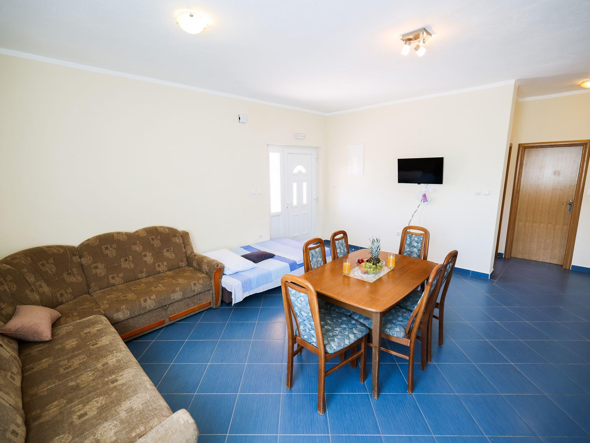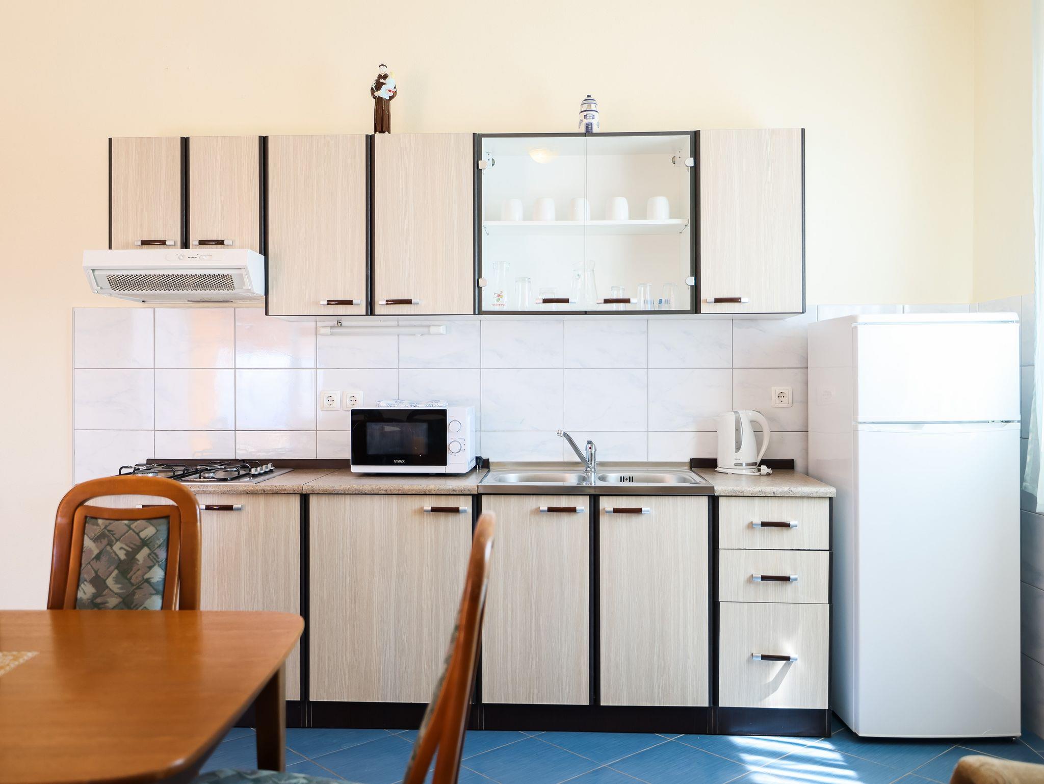 Ferienwohnung bietet Platz für 4 Gäste. Die Betten sind in Schlafzimmern, die es 1 gibt, und in Wohnzimmer, innerhalb einer Gesamtfläche von 58m2, angeordnet. Die Gäste haben eine eigene Terrasse zur Verfügung, auf der sie in warmen Sommernächten genießen können. Das Apartment bietet Meerblick. Für vollen Genuss und Entspannung gibt es einen privaten Grill für Gäste dieser Unterkunft. In der Unterkunftseinheit besteht die Möglichkeit des Mitbringens von Haustieren gegen Aufpreis. IM PREIS INBEGRIFFEN: Kurtaxe, Endreinigung, Klimatisierung, Parkplatz, Internet, Föhn. UNVERBINDLICHE ZUSÄTZLICHE KOSTEN: Wäschewaschen (10,00 € Waschen), Haustiere (8,00 € pro Nacht). Die Verfügbarkeit zusätzlicher Dienstleistungen in Ihrem reservierten Termin und die Preise derselben (falls nicht aufgeführt) müssen im Voraus überprüft werden. Zusätzliche Dienstleistungen die in der Zahlungsaufforderung nicht aufgeführt sind werden direkt beim Vermieter bezahlt, angenommen der Gast nutzt auch diese.