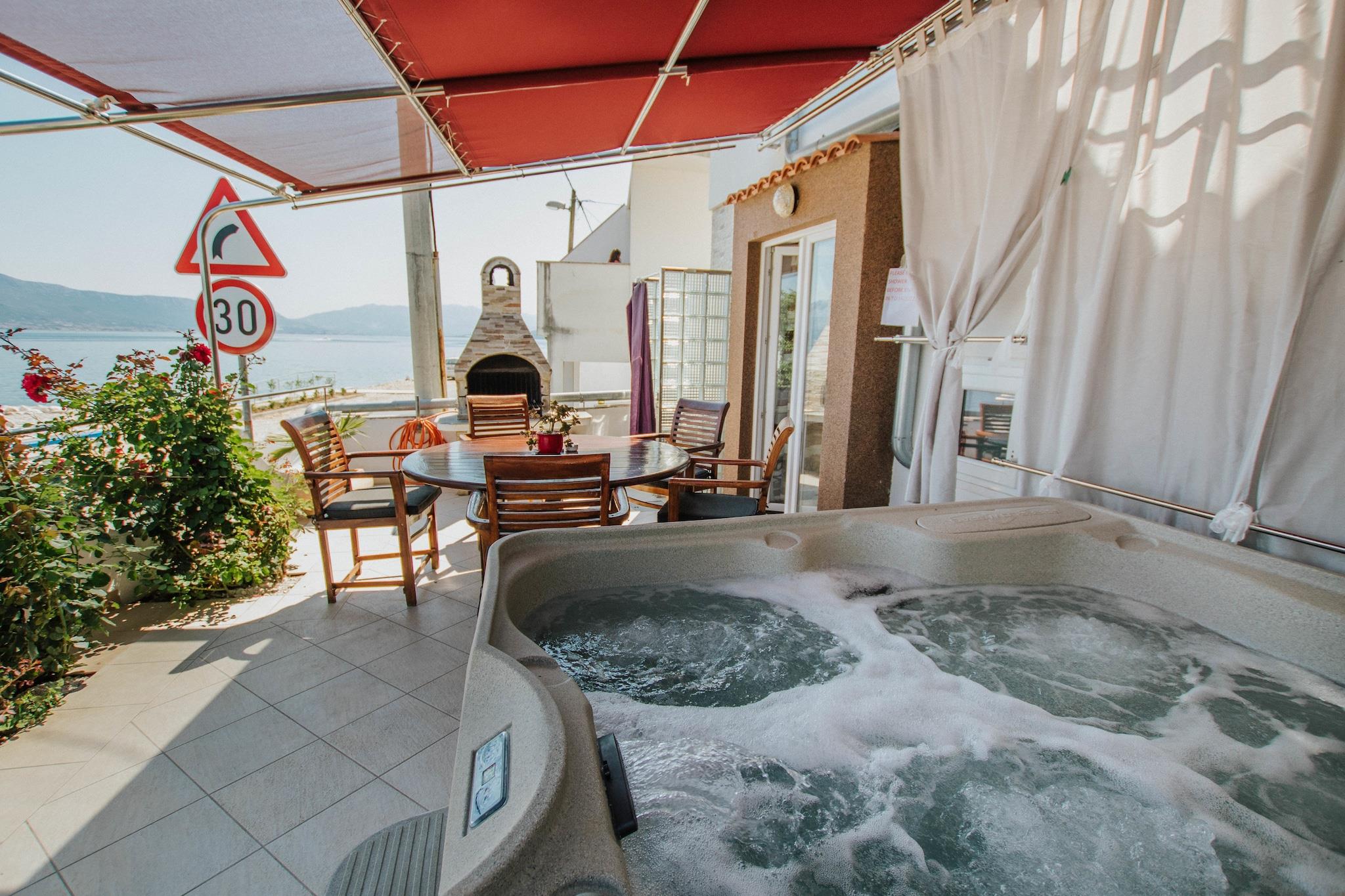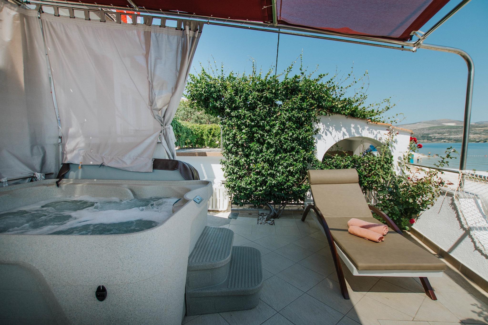 Arbanija är liten bosättning på norra sidan av ön Ciovo, bara 4 km från den pittoreska staden Trogir. Det är utmärkt läge för vila och avkoppling med ett kristallklart vatten och stranden bokstavligen bara över vägen vilket är perfekt om du inte "Jag vill inte spendera hela dagen på stranden och hellre gå upp till din privata terrass med jacuzzi, efter att ha badat eller doppat in och ut ur havet närhelst du önskar. Huset är mysigt och bekvämt och välutrustat med alla moderna Fritidshuset består av två separata lägenheter, fördelade på två våningar och fördelar med en terrass med grill och bord för familjer eller vänner som äter tillsammans. Mataffären, några små restauranger, strandbar och pizzeria ligger inom bara kort gångavstånd, medan fler faciliteter och bekvämligheter är lättillgängliga i närliggande Trogir. Detta är också ett utmärkt ställe att utforska dalmatiska hotspots på dagsturer.