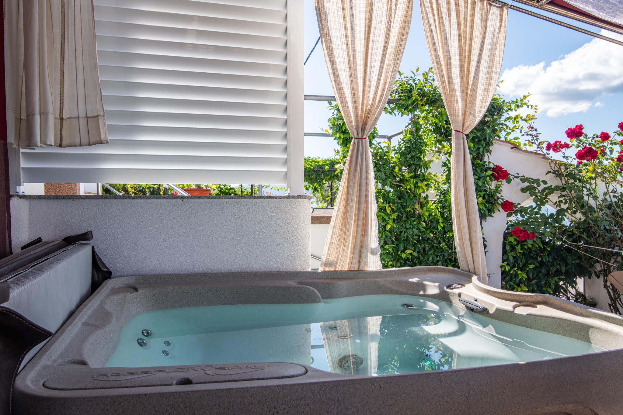 Fly till en fridfull kustparadis i Trogir - Arbanija med denna husdjursvänliga lägenhet för sex personer, belägen bara 10 meter från stranden. Lägenheten ligger i ett lugnt kustområde och erbjuder enkel tillgång till det klara Adriatiska vattnet. Den ligger bara 4,5 km från Trogirs UNESCO-listade gamla stadsdel, perfekt för att upptäcka historiska gator, kulturella pärlor och en pulserande lokal atmosfär. Restauranger, butiker och kollektivtrafik finns i närheten, vilket gör din vistelse bekväm och stressfri. Lägenheten erbjuder en rymlig och välkomnande planlösning, inklusive ett mysigt vardagsrum med platt-TV med satellitkanaler, DVD-spelare och CD-spelare. Ett fullt utrustat kök med moderna apparater gör måltiderna enkla, medan två bekväma sovrum, ett med dubbelsäng och luftkonditionering, det andra med två enkelsängar, garanterar vilsamma nätter. Gästerna kan njuta av ett privat bubbelbad, grilla på uteplatsen och använda en tvättmaskin och privat parkering. Utforska det imponerande Diocletianus palats i närliggande Split eller beundra skönheten i Sankt Domnius katedral, båda historiska platser man bara måste se. För middag kan du njuta av grillade specialiteter på restaurang Mali Raj, eller njuta av färska skaldjur på Konoba Mlinice, känd för sin traditionella charm. Oavsett om du kopplar av vid havet eller utforskar den dalmatiska kusten, är denna lägenhet i Arbanija den perfekta basen för din semester.
