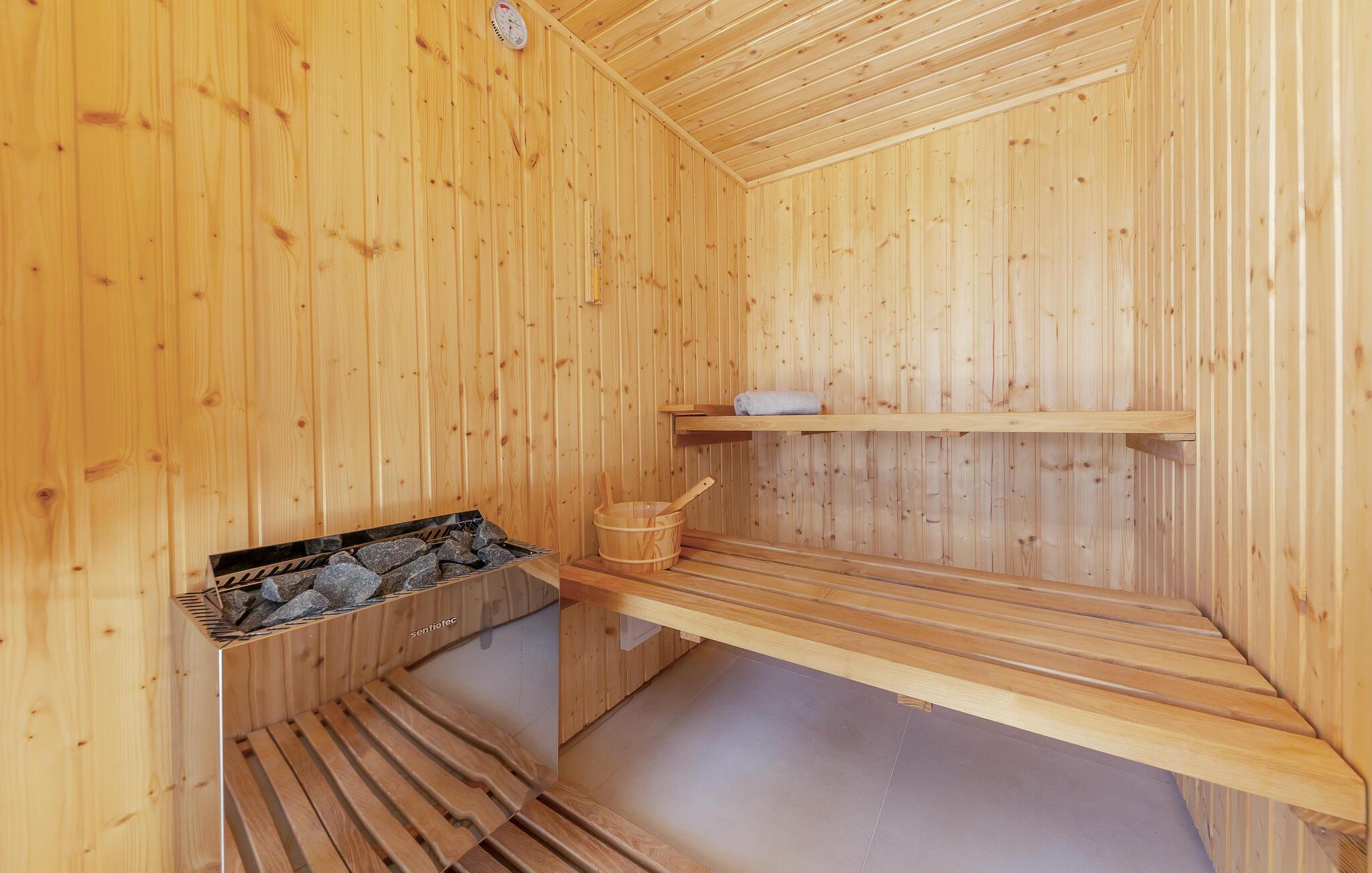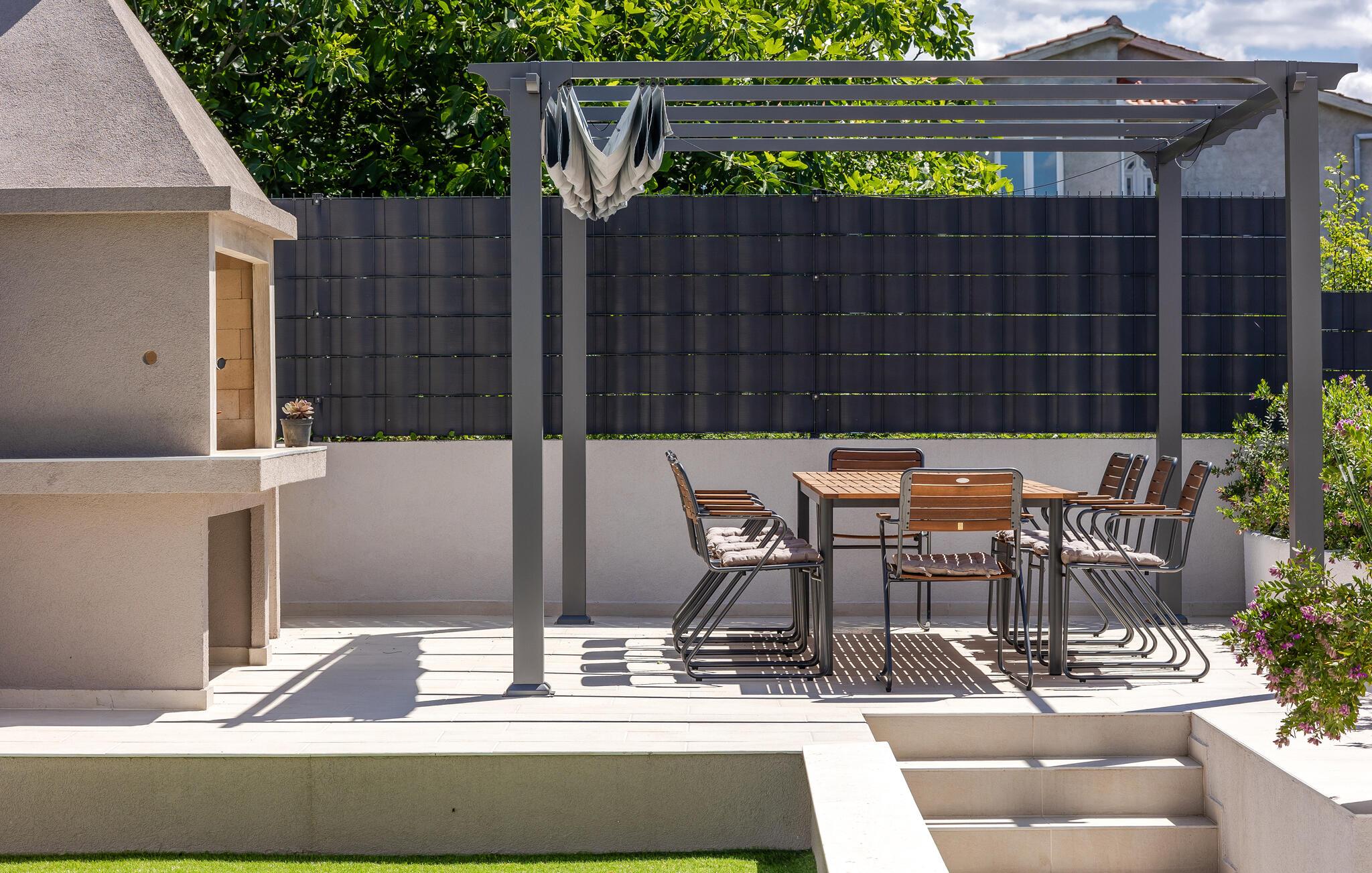 Du kan också se fram emot trädgården, som inte på något sätt är underlägsen huset. Samlas på terrassen med sitt stora sommarkök medan barnen hoppar på studsmattan eller simmar i poolen under vattenfallet. Det finns också en liten gräsmatta för bollspel och en stor solterrass med gott om solstolar och en solsäng.