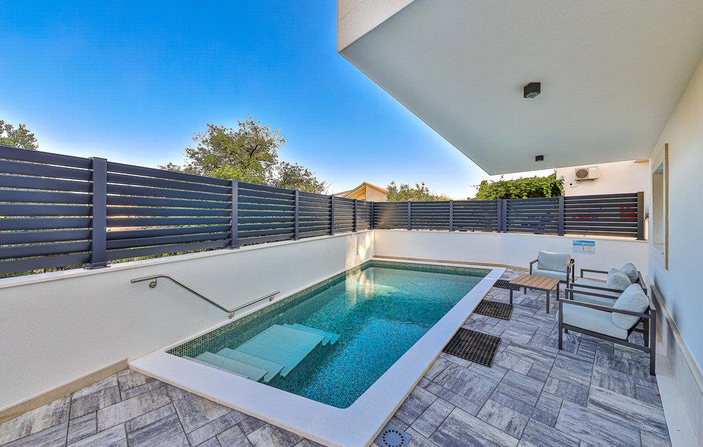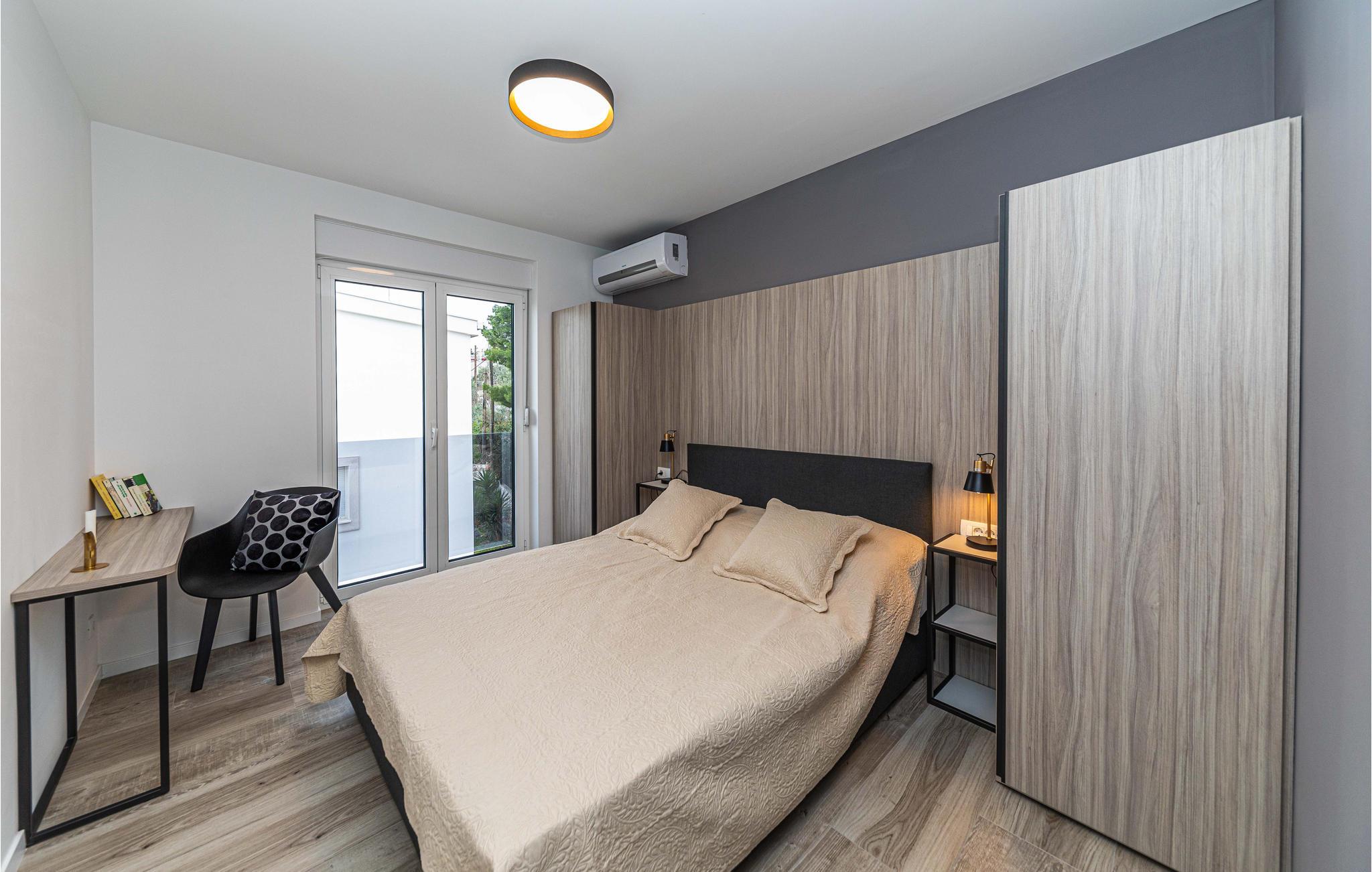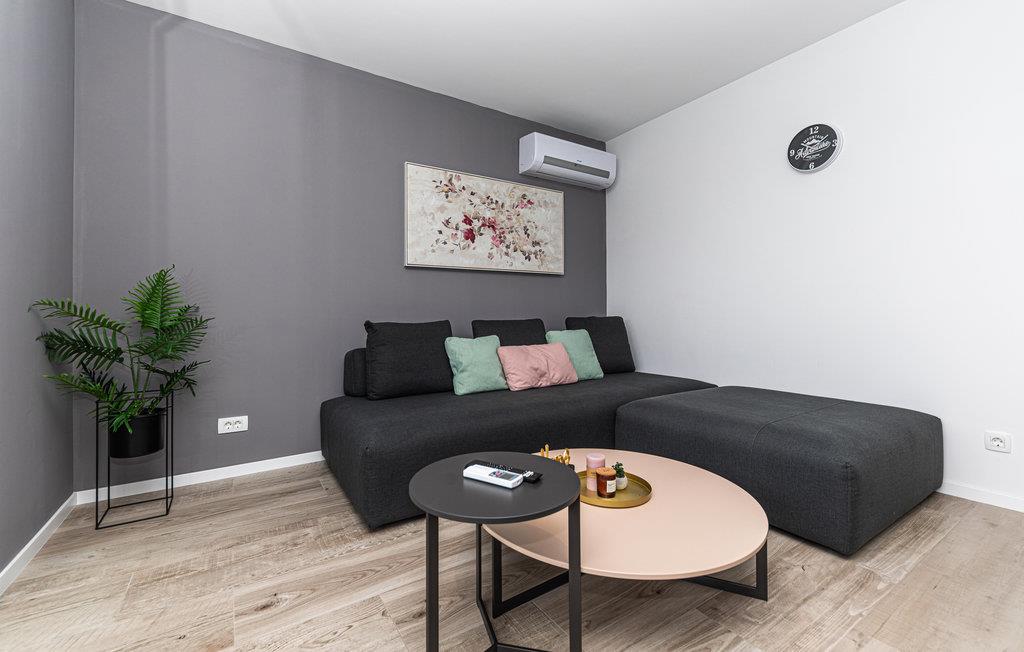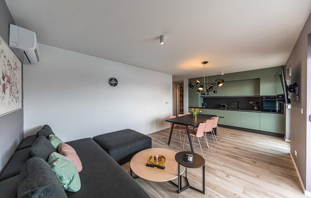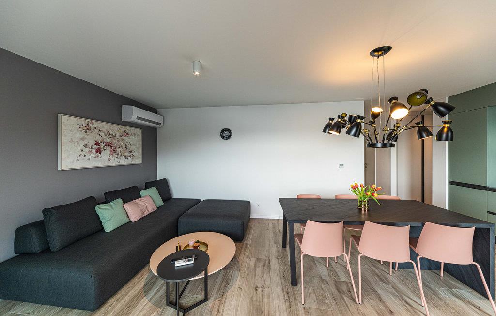 Lägenheten välkomnar dig med en vacker atmosfär och en inbjudande feelgood-stämning. Njut av vackra timmar tillsammans i det moderna vardagsrummet. Här kan du förbereda dina favoriträtter i det moderna köket och njuta av dem efteråt på den rymliga terrassen med en underbar panoramautsikt över havet och öarna. I husets gemensamma trädgård väntar en vacker pool där du kan förfriska dig och sedan koppla av i solen.
