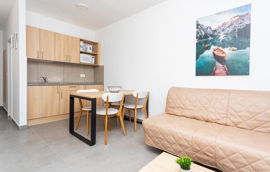 Denna moderna lägenhet är idealiskt belägen bara några steg från havet i ett lägenhetskomplex. Här kan du njuta av härliga dagar tillsammans med dina nära och kära. Efter en härlig dag på stranden eller på en utflykt kan du göra dig bekväm i soffan i vardagsrummet, se tillbaka på dina upplevelser och avsluta dagen i en avslappnad atmosfär.