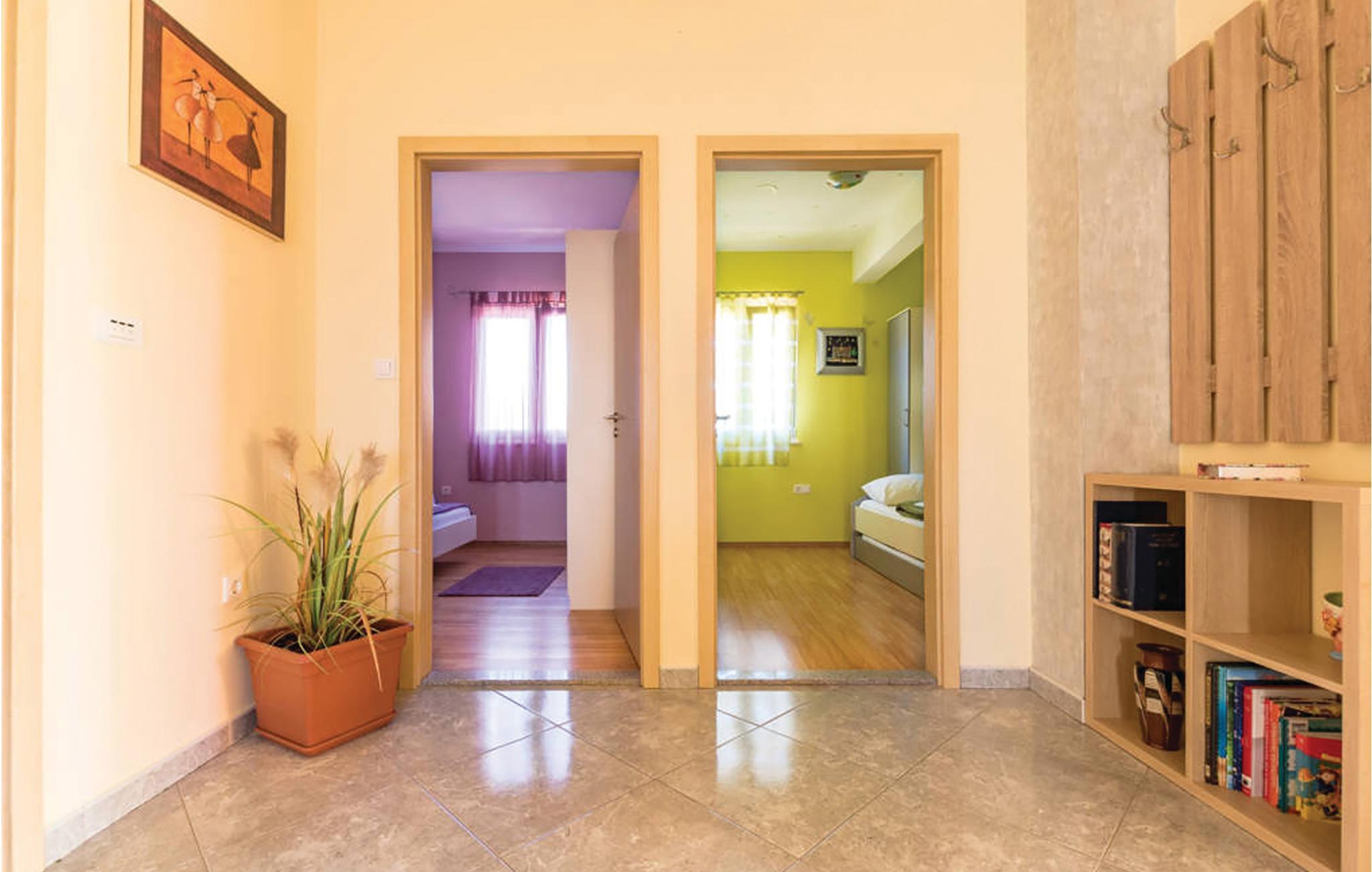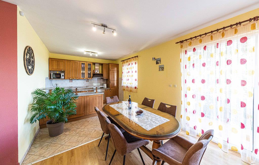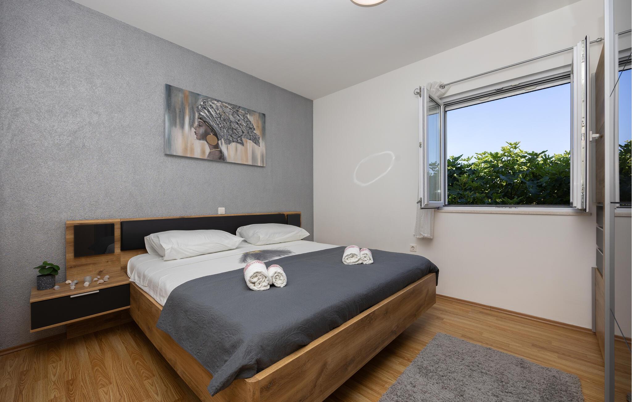 Detta semesterhus med pool och vacker trädgård består av två bostadsenheter som är förbundna med externa trappor och är därför perfekt för två familjer. Boendeenheterna är jämnt fördelade och har vardera tre sovrum, ett badrum och ett stort vardagsrum med matplats och kök. Fastigheten är helt inhägnad och barnen kan därför leka bekymmersfritt eller fräscha upp sig i poolen. Från terrasserna har du en vacker utsikt över Katelbukten, som du säkert kommer att njuta av. De historiska städerna Trogir och Split ligger bara några minuters bilresa bort.