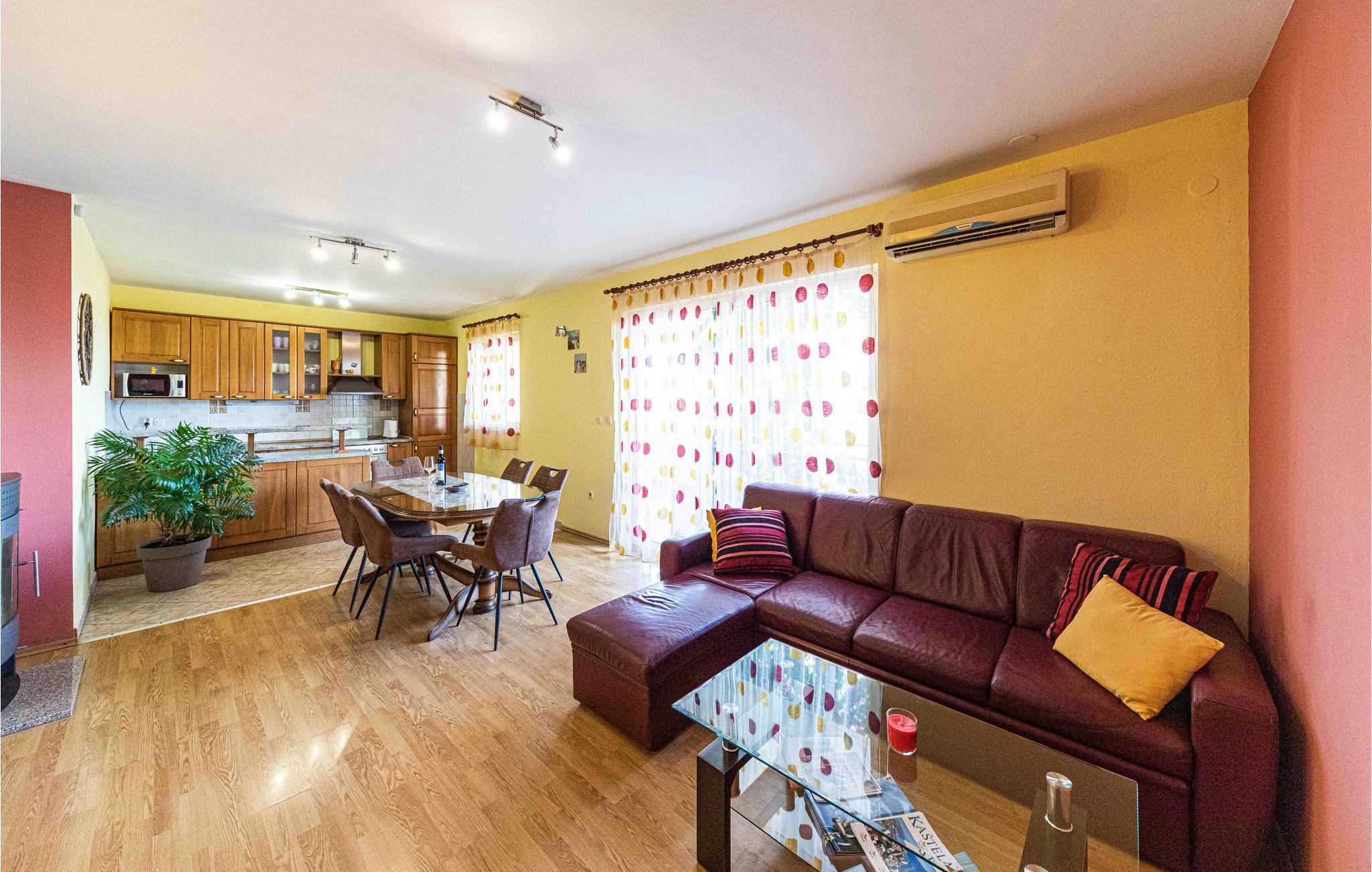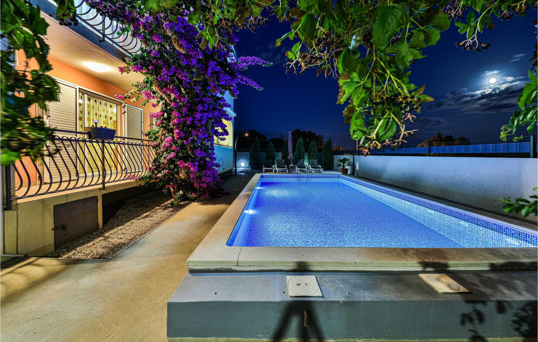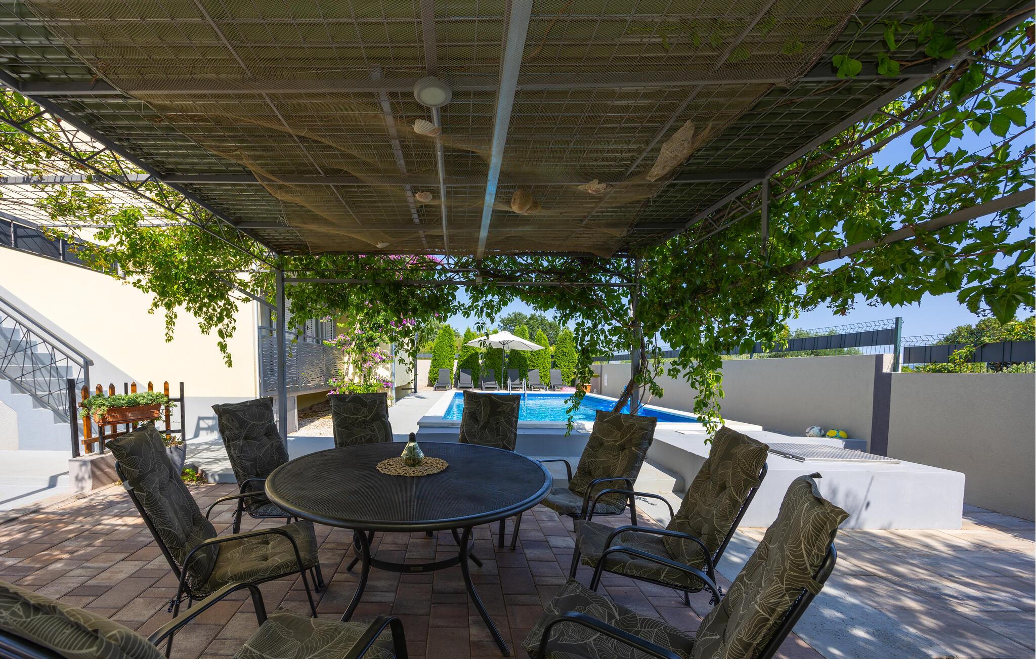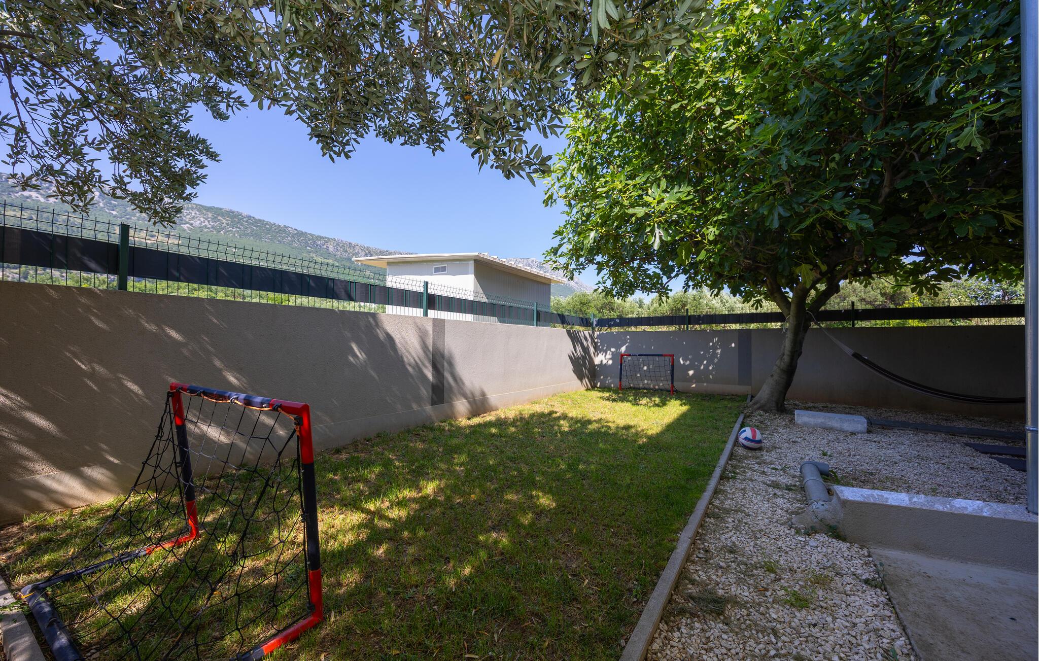 Detta semesterhus med pool och vacker trädgård består av två bostadsenheter som är förbundna med externa trappor och är därför perfekt för två familjer. Boendeenheterna är jämnt fördelade och har vardera tre sovrum, ett badrum och ett stort vardagsrum med matplats och kök. Fastigheten är helt inhägnad och barnen kan därför leka bekymmersfritt eller fräscha upp sig i poolen. Från terrasserna har du en vacker utsikt över Katelbukten, som du säkert kommer att njuta av. De historiska städerna Trogir och Split ligger bara några minuters bilresa bort.