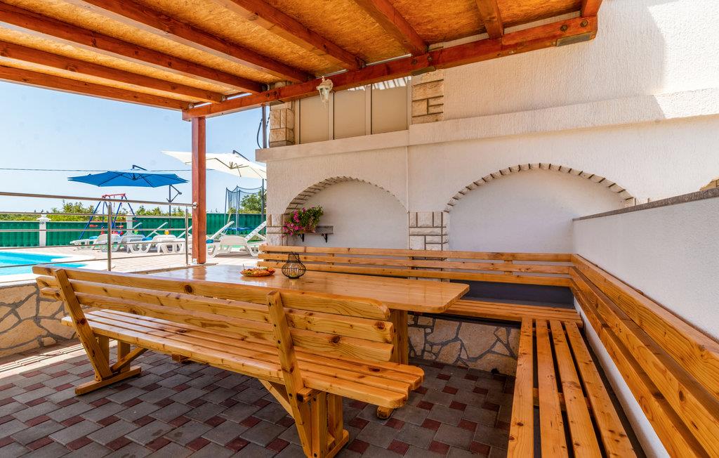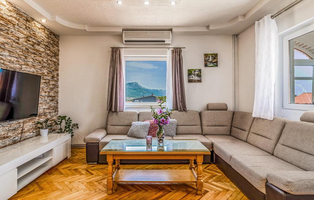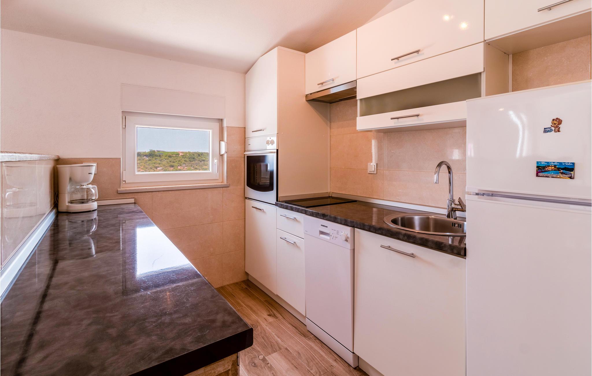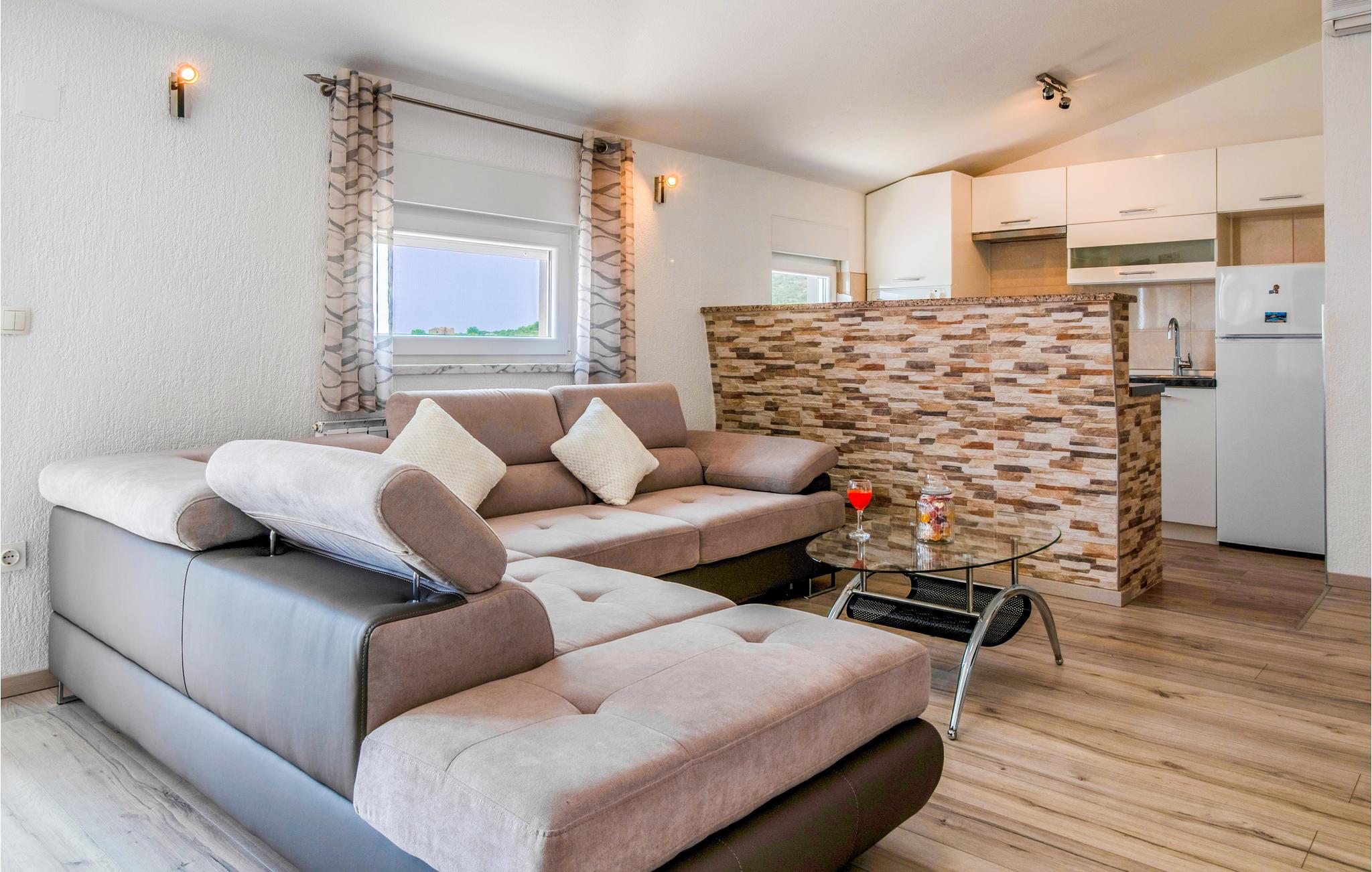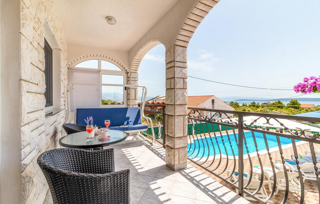 Tillbringa din semester i detta trevligt inredda semesterhus med en vacker panoramautsikt över havet. Huset består av tre boendeenheter, varav en ligger på första våningen och de övriga två på andra våningen. Poolen är idealisk för att njuta och koppla av. Fastigheten är inhägnad, vilket gör den väl lämpad för barn. Uppfarten är oasfalterad de sista 100 metrarna. Utforska de historiska städerna Trogir och Split, vars minnesmärken tillhör Unescos världsarv.
