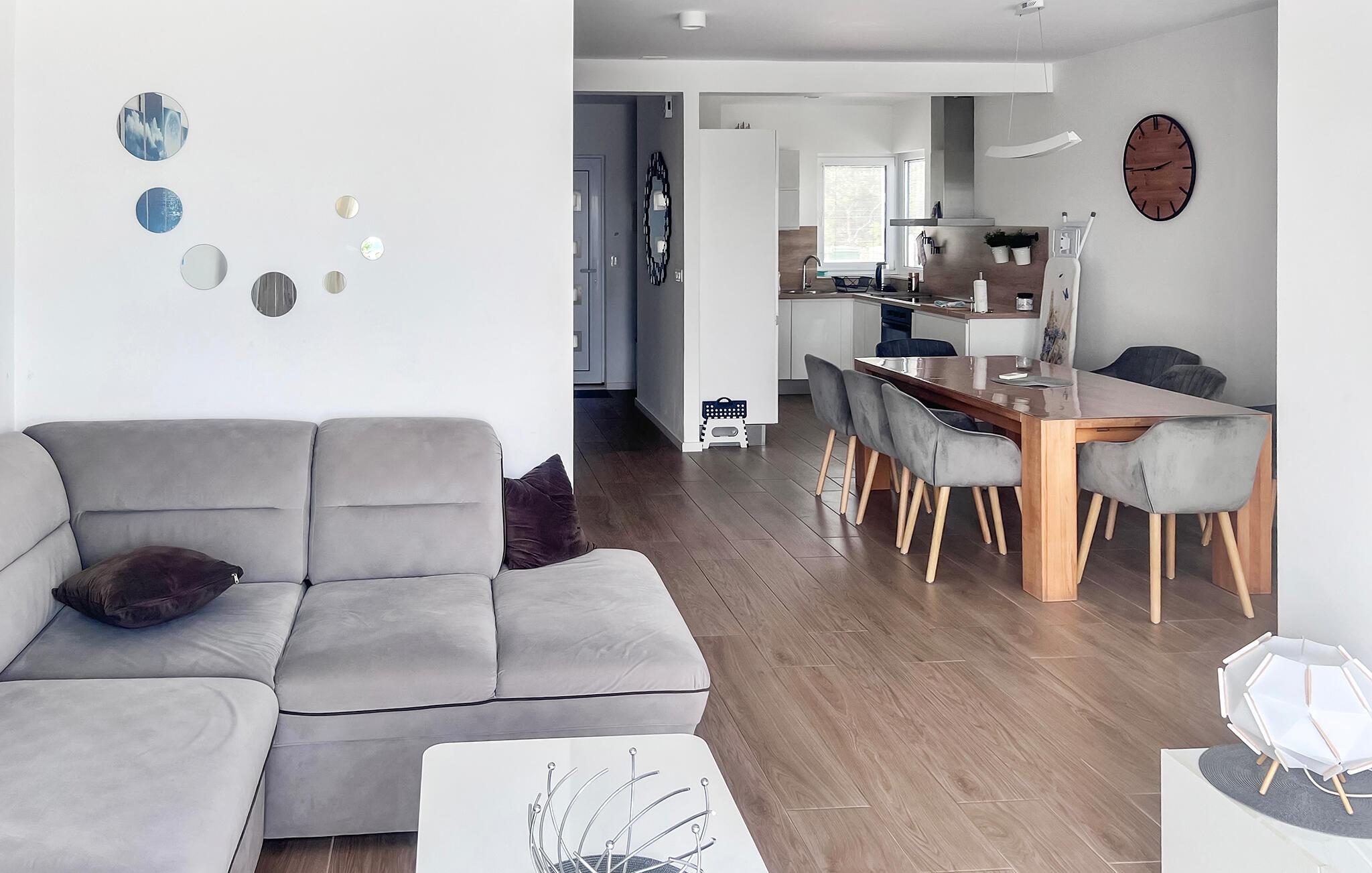 Detta smakfullt inredda hem välkomnar dig med en harmonisk atmosfär där du hittar gott om utrymme för att umgås, även med en större grupp. Organisera glada matlagningskvällar och fira dina skapelser vid det mysiga matbordet. Koppla sedan av i den bekväma soffan i det mysiga vardagsrummet medan du streamar en spännande serie eller spelar ett brädspel med dina nära och kära.