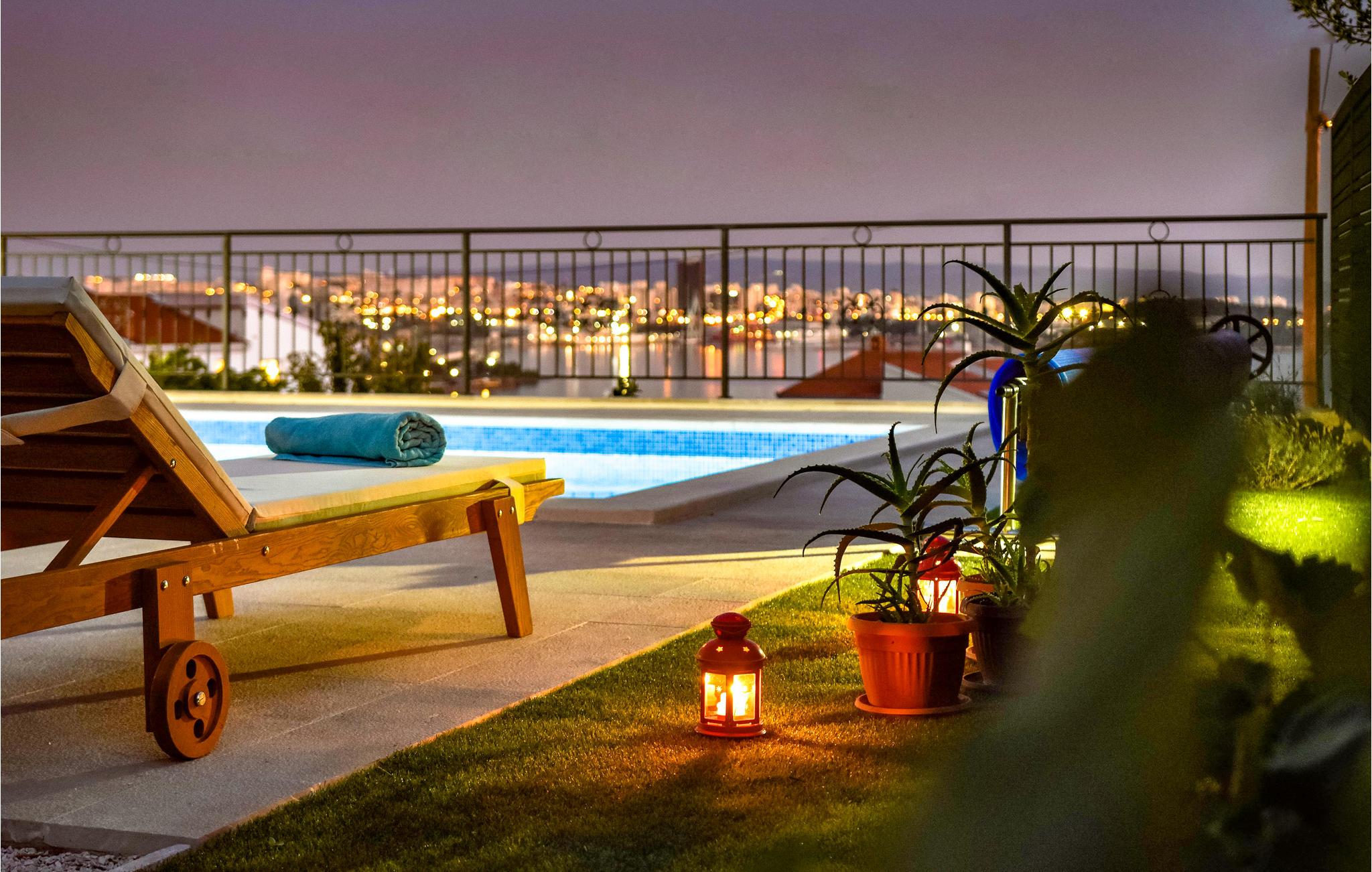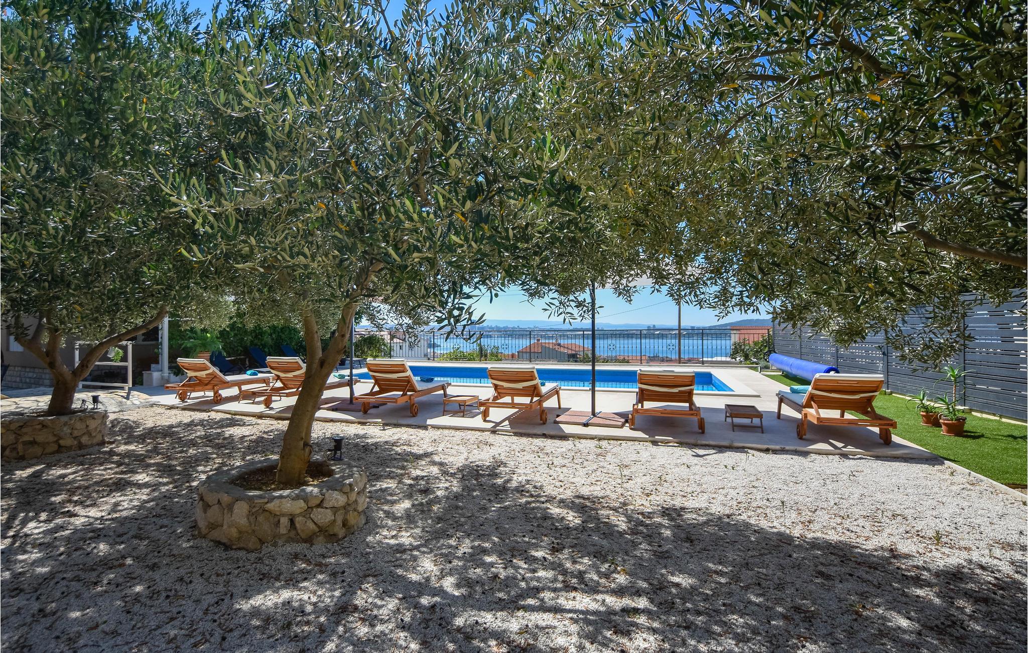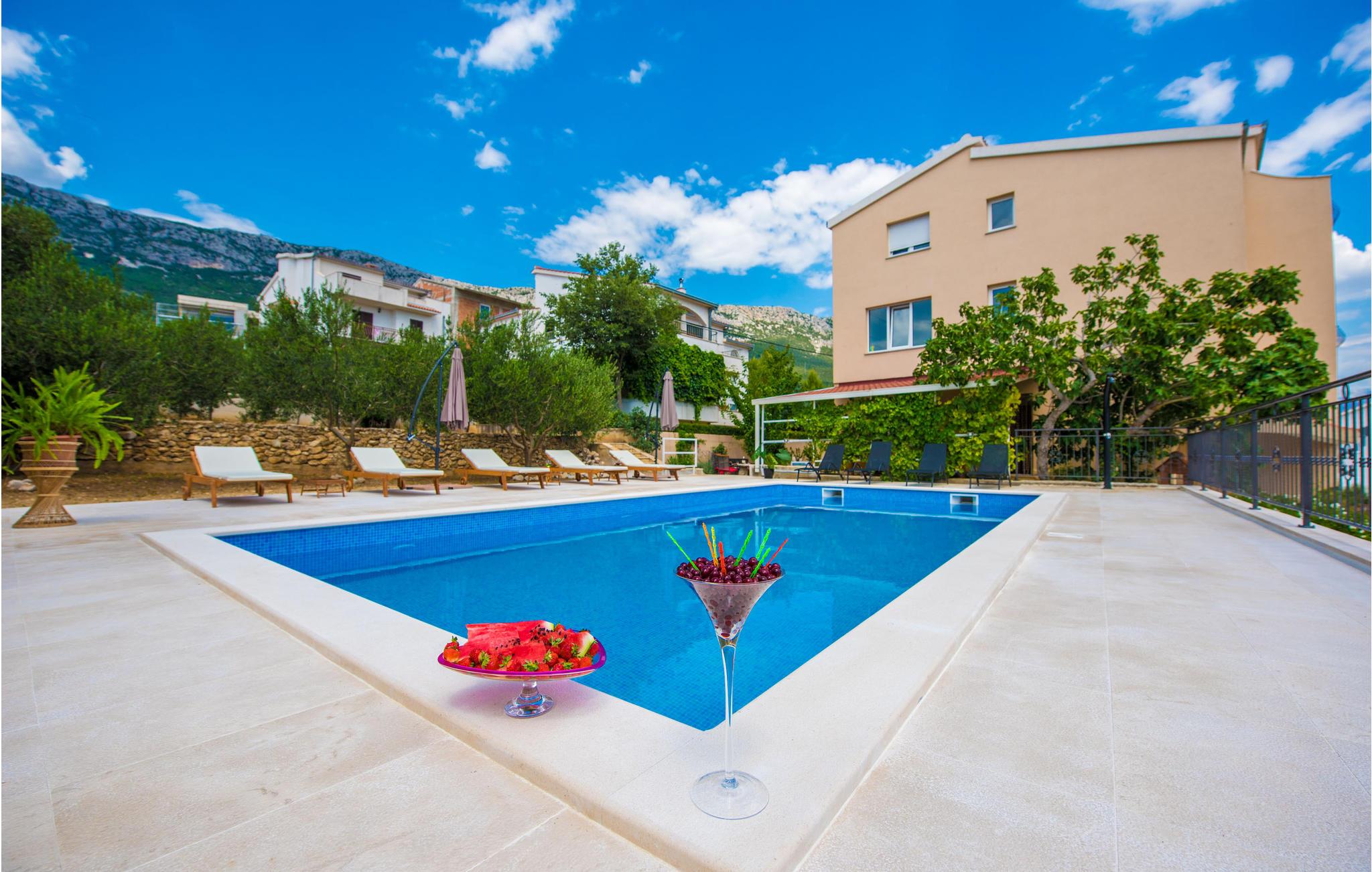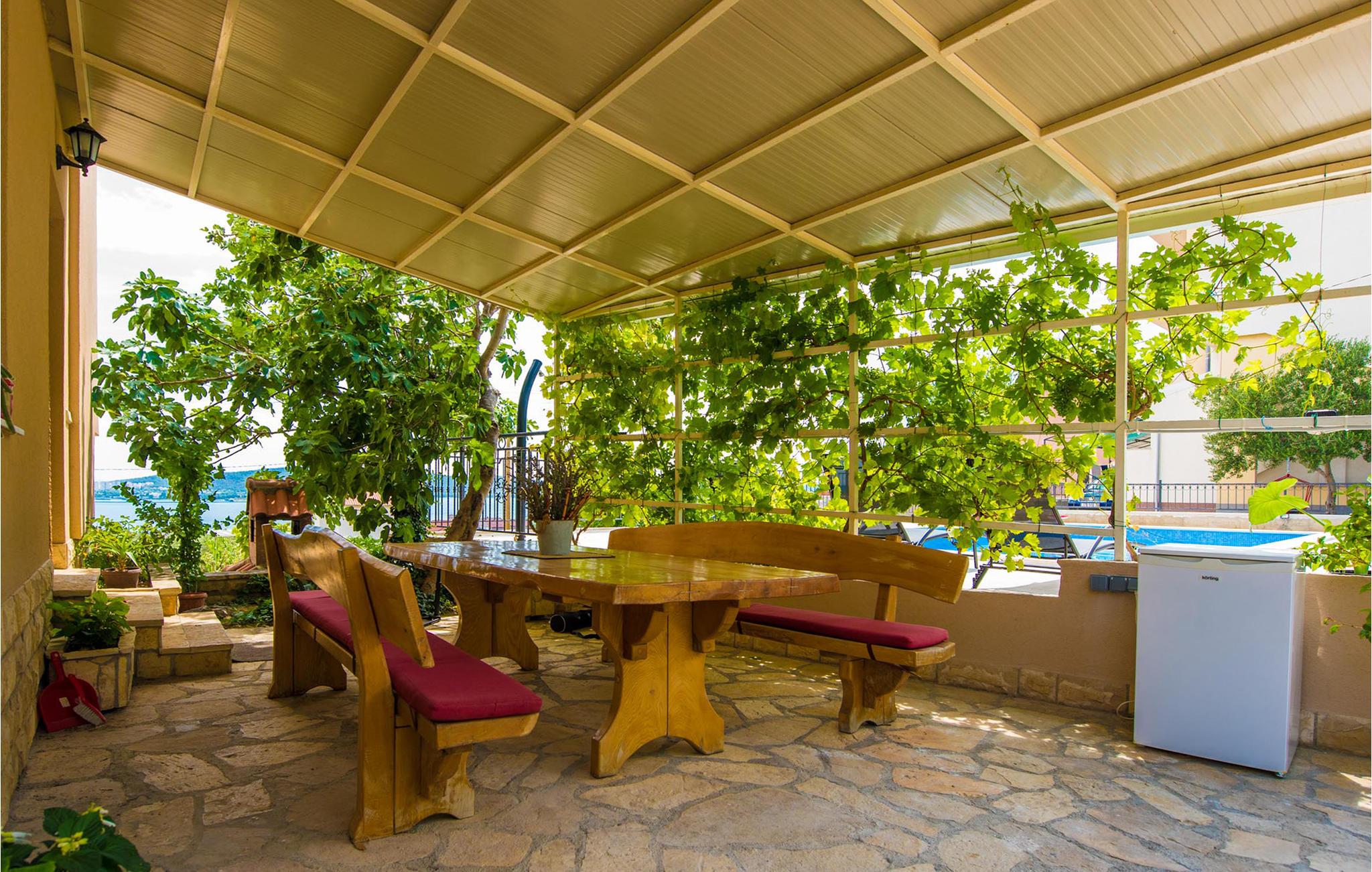 Detta bekväma semesterhus med pool är fördelat på 3 våningar som är förbundna med interna trappor. Det är idealiskt för en semester med flera familjer och vänner. Inredningen på 2 och 3 våningen är modern med 2 badrum per våning. Den funktionellt inredda 1:a våningen erbjuder dig en lika trevlig vistelse. Från terrassen kan du njuta av panoramautsikten över hela bukten, från Split till Trogir. Du kan fräscha upp dig och koppla av i poolen med hydromassagestrålar. Besök de historiska städerna Trogir och Split med många kulturhistoriska sevärdheter, många underhållningsalternativ för alla åldersgrupper och restauranger med utmärkt dalmatiskt kök.