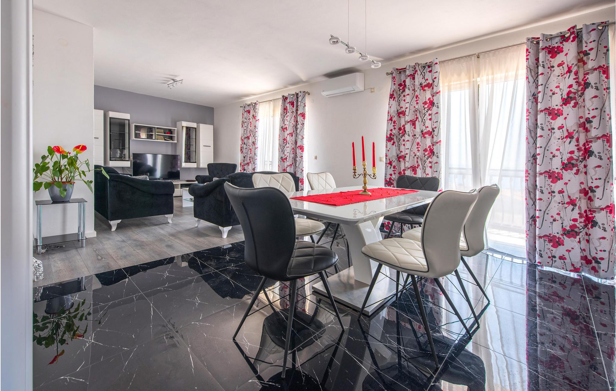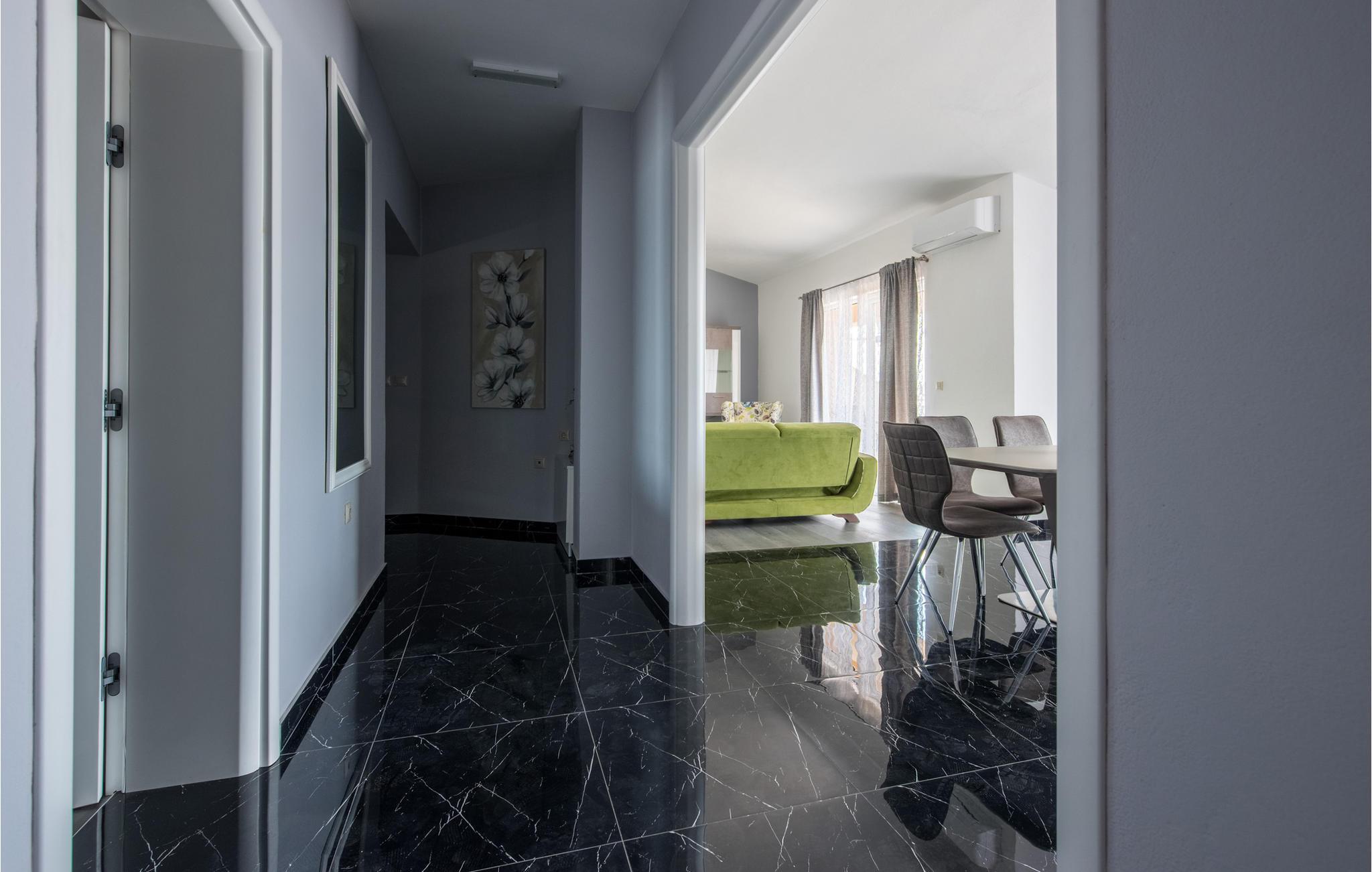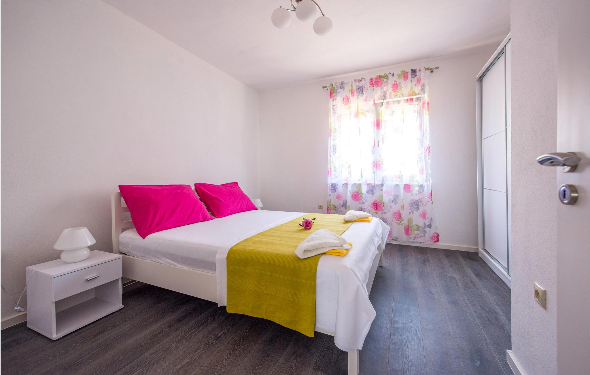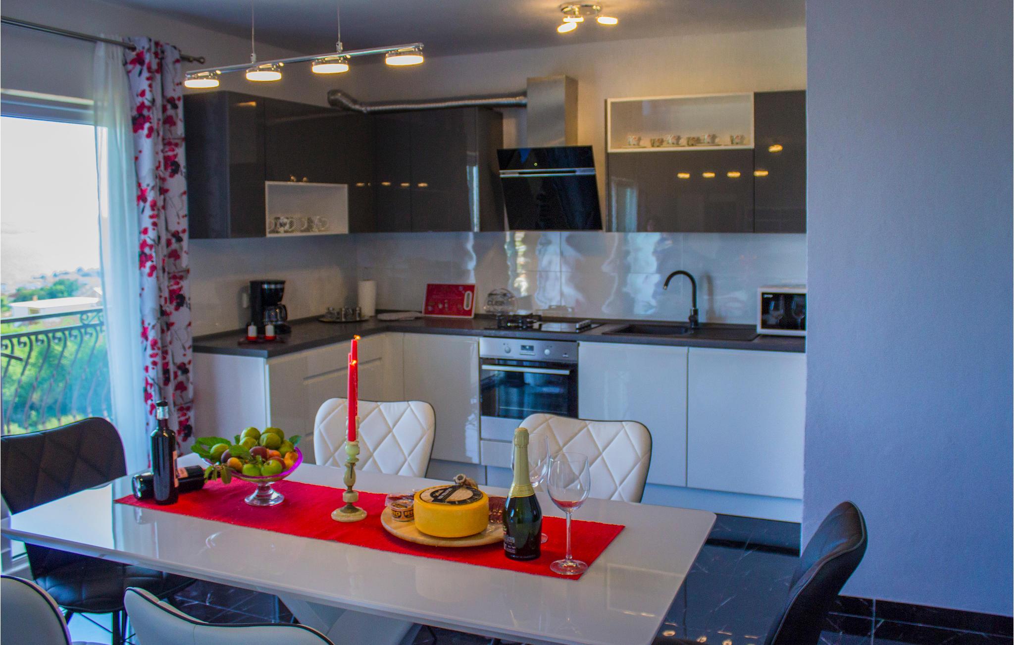 Detta bekväma semesterhus med pool är fördelat på 3 våningar som är förbundna med interna trappor. Det är idealiskt för en semester med flera familjer och vänner. Inredningen på 2 och 3 våningen är modern med 2 badrum per våning. Den funktionellt inredda 1:a våningen erbjuder dig en lika trevlig vistelse. Från terrassen kan du njuta av panoramautsikten över hela bukten, från Split till Trogir. Du kan fräscha upp dig och koppla av i poolen med hydromassagestrålar. Besök de historiska städerna Trogir och Split med många kulturhistoriska sevärdheter, många underhållningsalternativ för alla åldersgrupper och restauranger med utmärkt dalmatiskt kök.