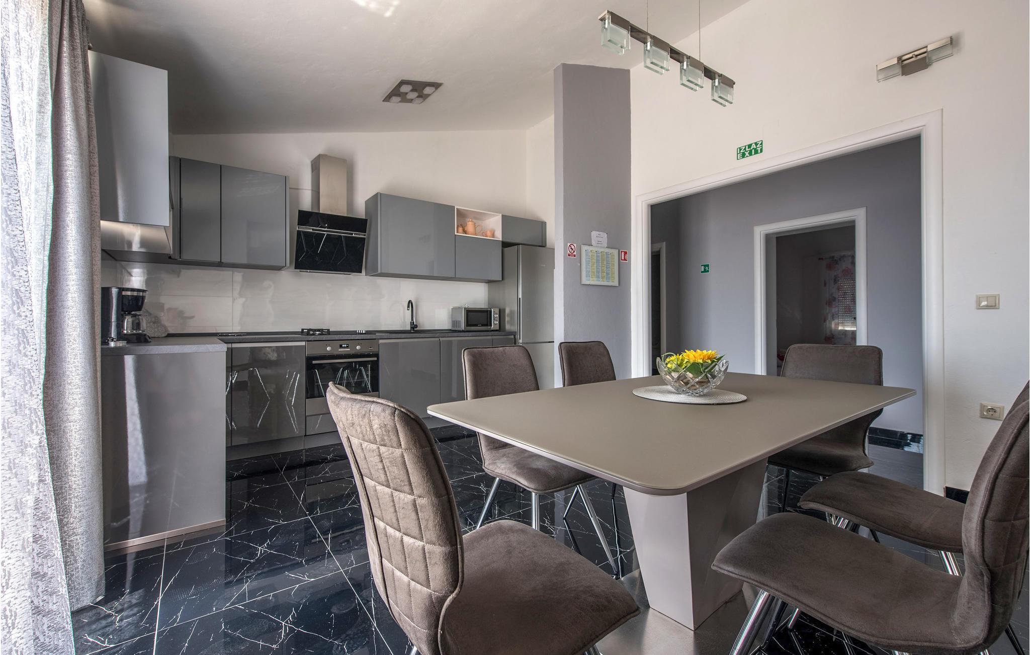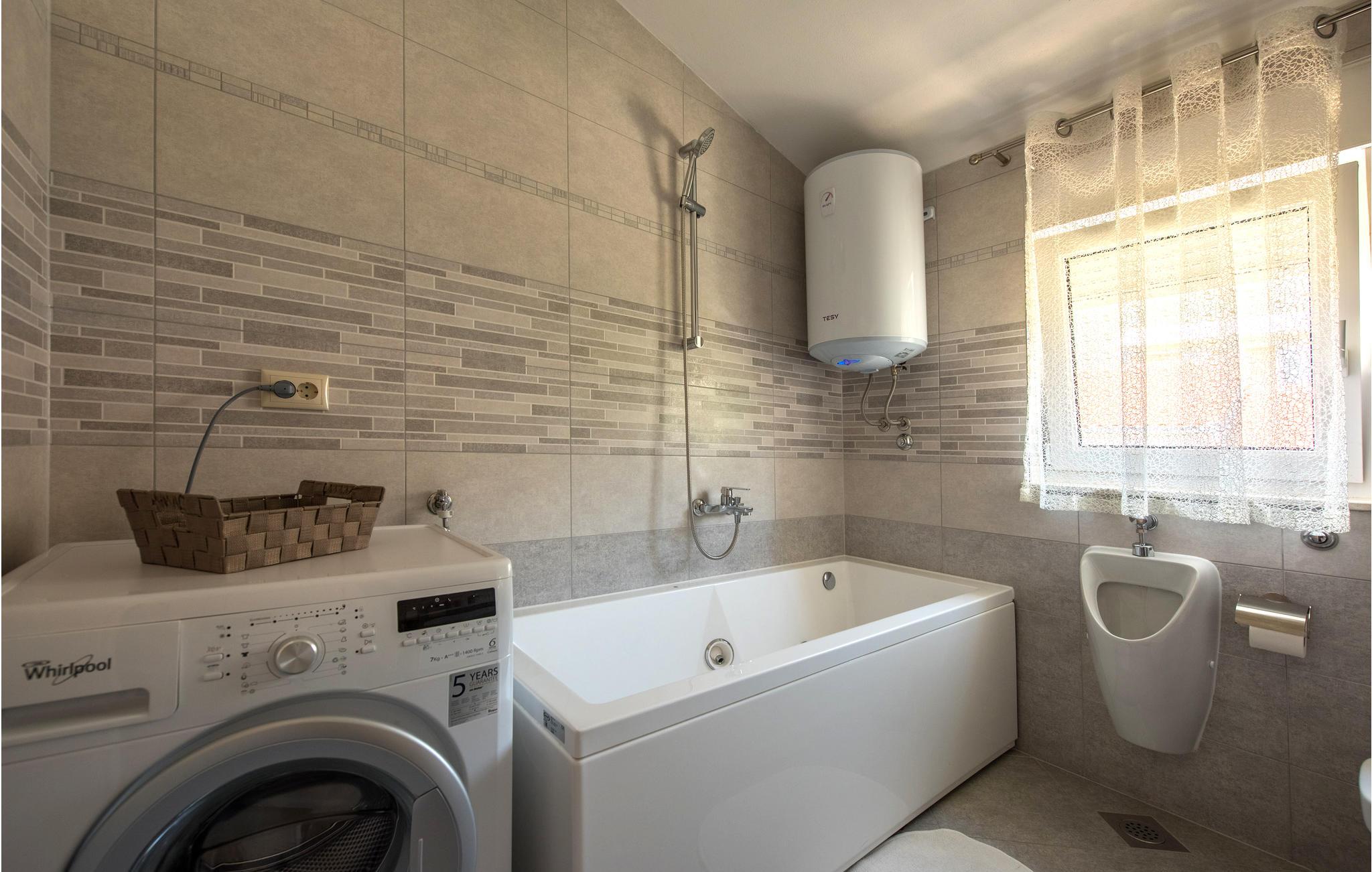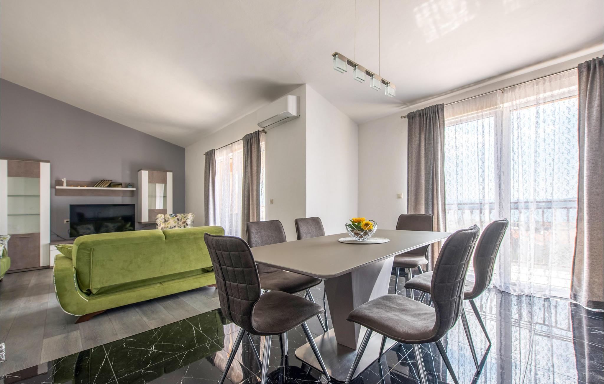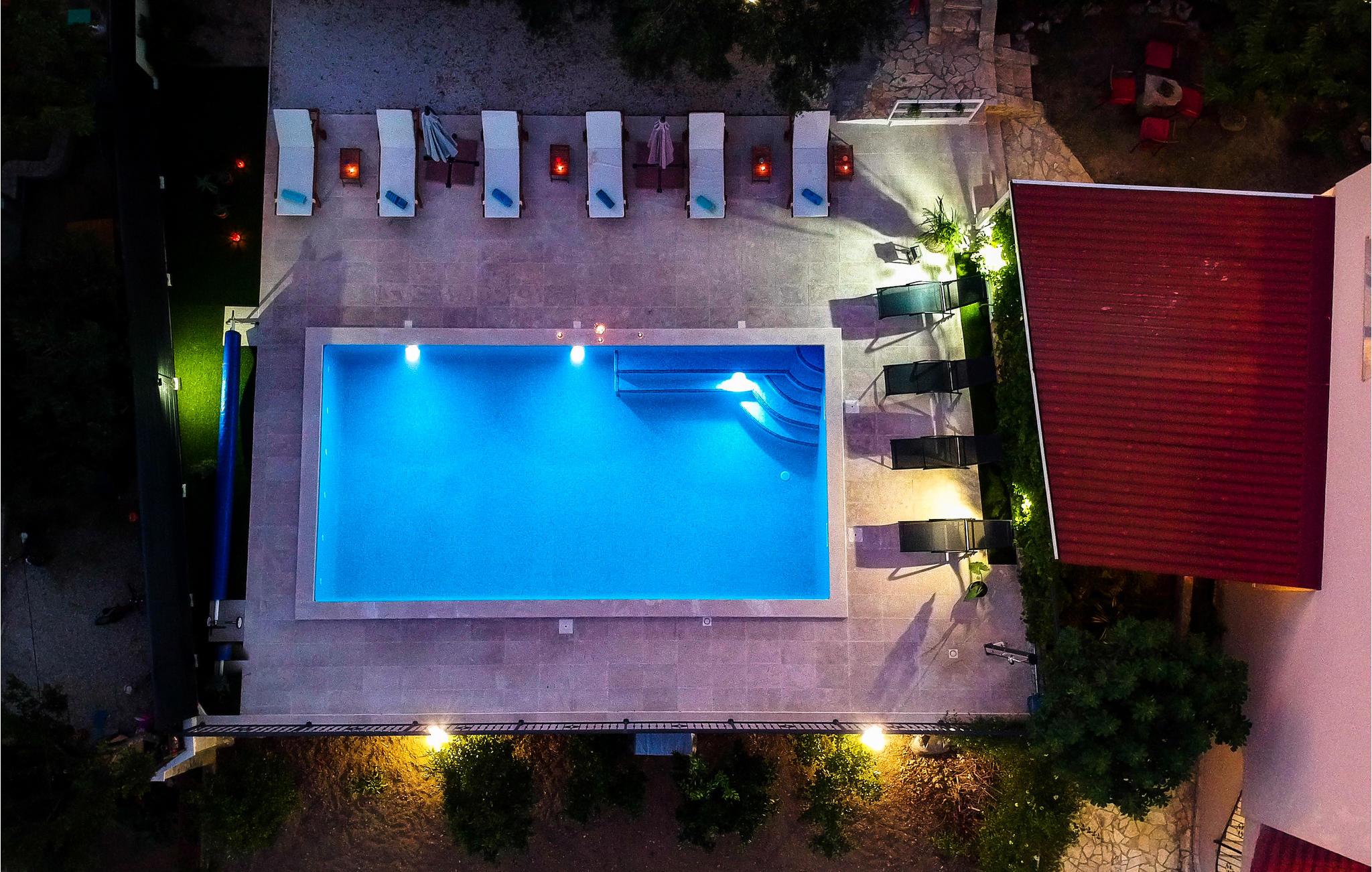 Detta bekväma semesterhus med pool är fördelat på 3 våningar som är förbundna med interna trappor. Det är idealiskt för en semester med flera familjer och vänner. Inredningen på 2 och 3 våningen är modern med 2 badrum per våning. Den funktionellt inredda 1:a våningen erbjuder dig en lika trevlig vistelse. Från terrassen kan du njuta av panoramautsikten över hela bukten, från Split till Trogir. Du kan fräscha upp dig och koppla av i poolen med hydromassagestrålar. Besök de historiska städerna Trogir och Split med många kulturhistoriska sevärdheter, många underhållningsalternativ för alla åldersgrupper och restauranger med utmärkt dalmatiskt kök.