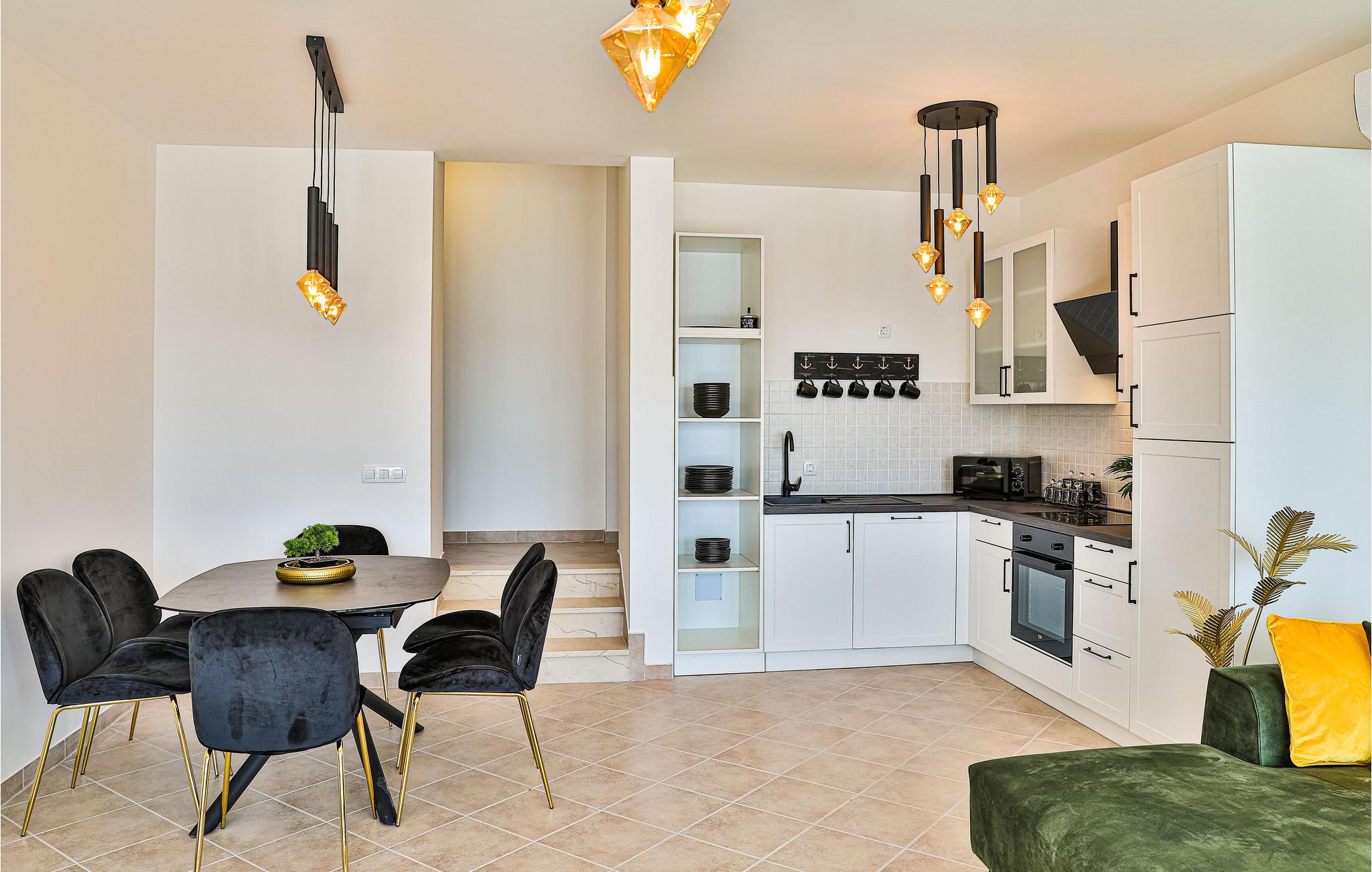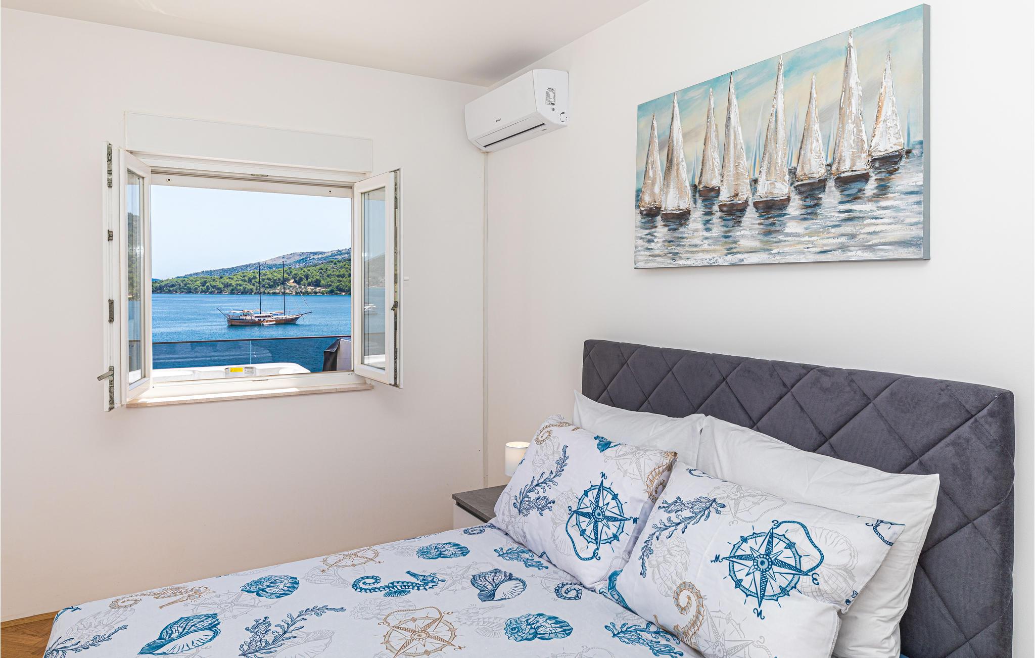 Detta stora, moderna semesterhus ligger nära den vackra staden Trogir, där ni kan ha en underbar tid när som helst på året. Från balkongen har du en spektakulär utsikt över sundet och hamnen i Marina. Här kan du andas in den klara, friska havsluften tidigt på morgonen, vilket ger dig en ny start på dagen. Ännu vackrare är det förmodligen på kvällen, när fiskarna och seglarna återvänder från sina utflykter och solen går ner. Sätt dig bekvämt i soffan med dina nära och kära och njut av utsikten. Varma dagar kan du hoppa rakt ner i havet. På grund av den höga salthalten i regionen kan du nästan glida i havet.