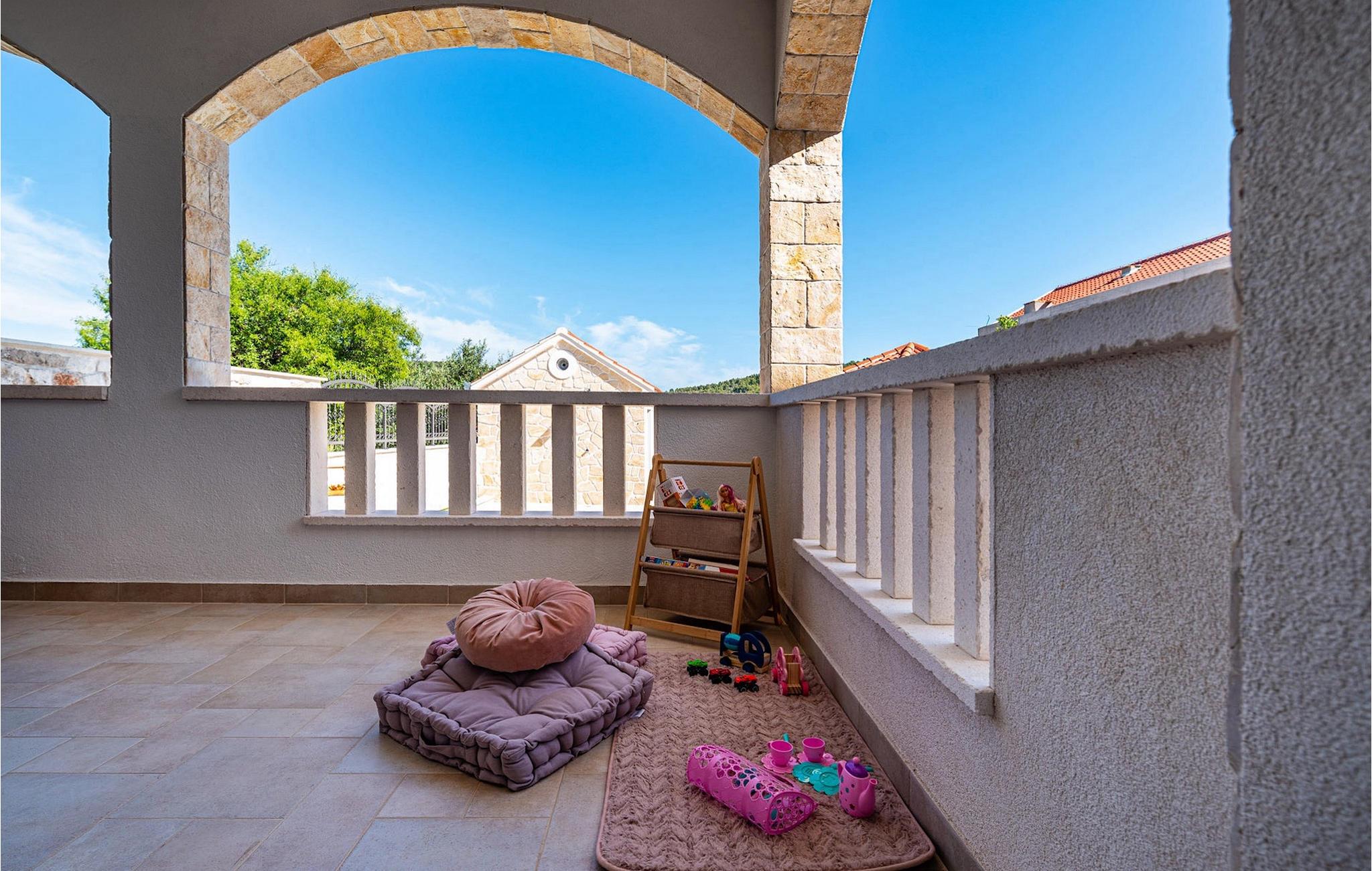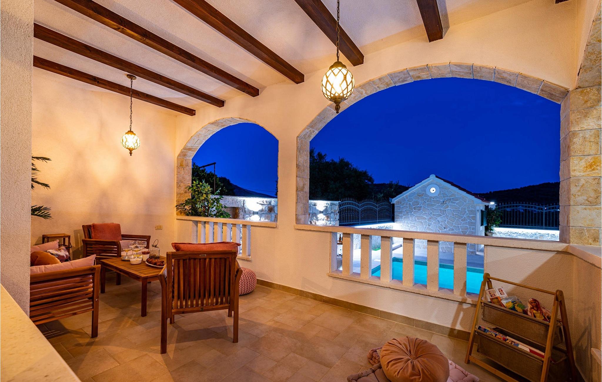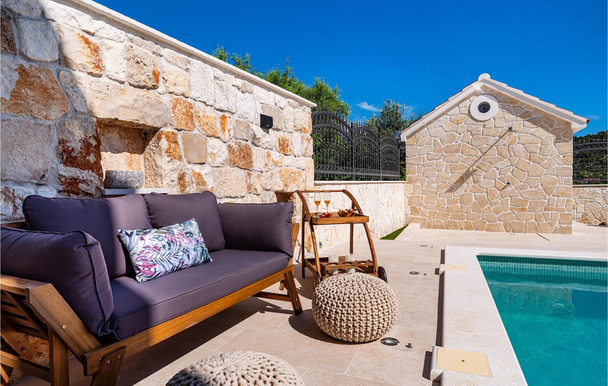 Utomhus kan du njuta av den uppfriskande 35m2 poolen, njuta av den dalmatiska solen på en av solstolarna eller samla familj och vänner i den mysiga täckta loungen för att planera utflykter tillsammans i den vackra regionen. Wellnessentusiaster bör inte glömma att nämna bastun i poolhuset, barnen kommer säkert att ha roligt med spelkonsolen och som en liten höjdpunkt för vinälskare kommer vinkylen i båda köken säkert inte att vara malplacerad. Som du kan se finns det något för alla. :-)