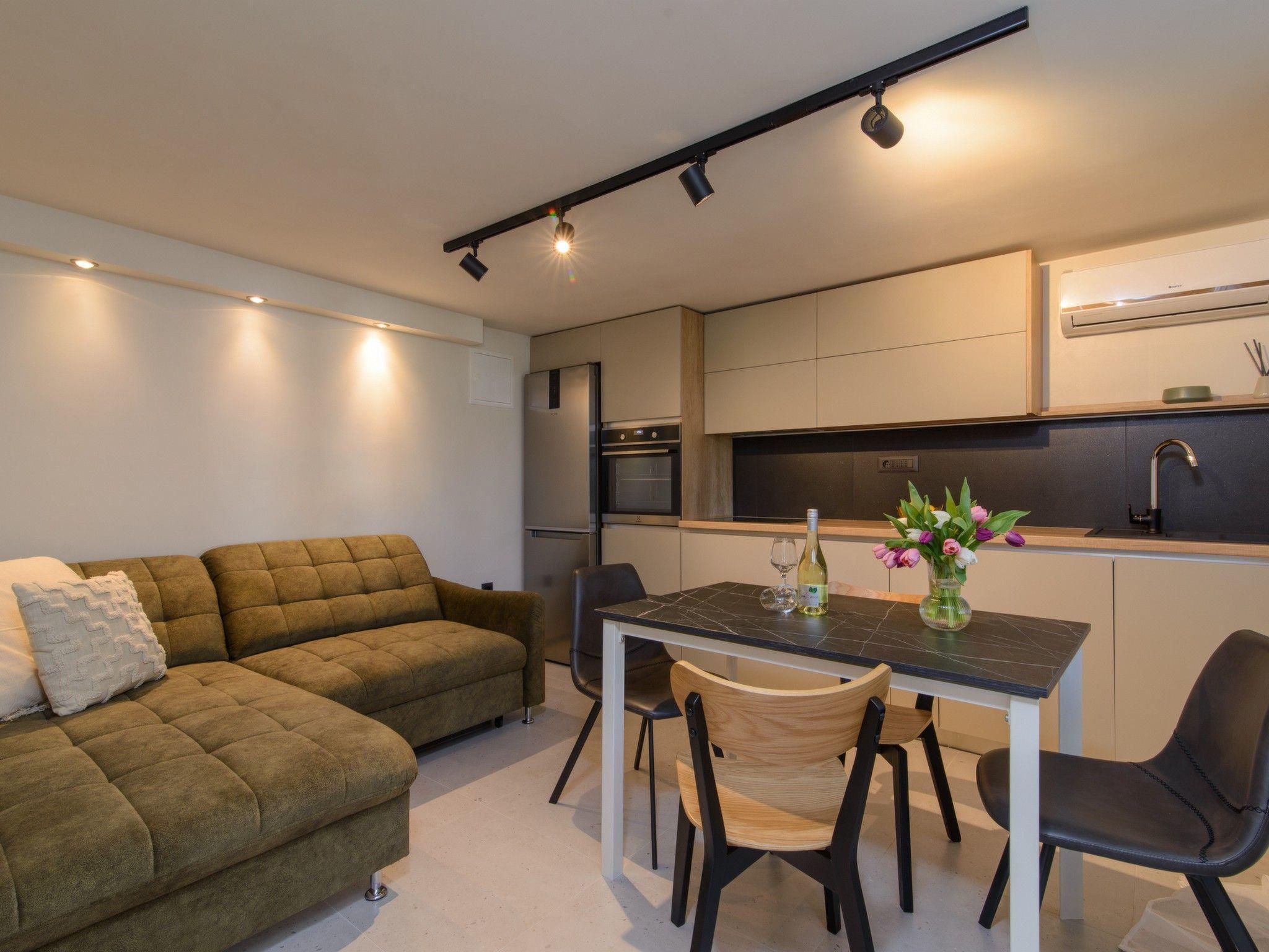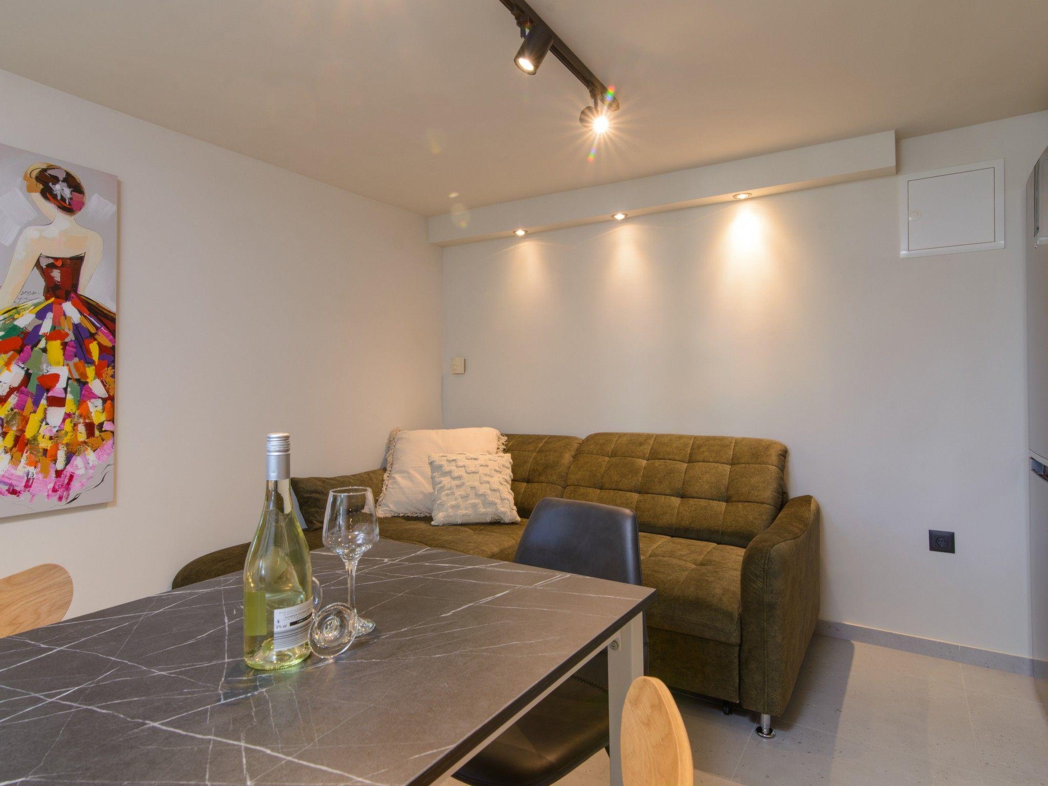 Apartment Maris 3B is located on the ground floor and covers the living area of 40 m2 + terrace of 27 m2. The apartment consists of 1 bedroom with a double bed and a sofa bed for 1 person, 1 modern bathroom with shower, living room and a fully equipped kitchen with a dining area. The apartment can comfortably accommodate up to 3 persons. The living room has access to a spacious covered terrace equipped with an outdoor table and chairs with a garden view.