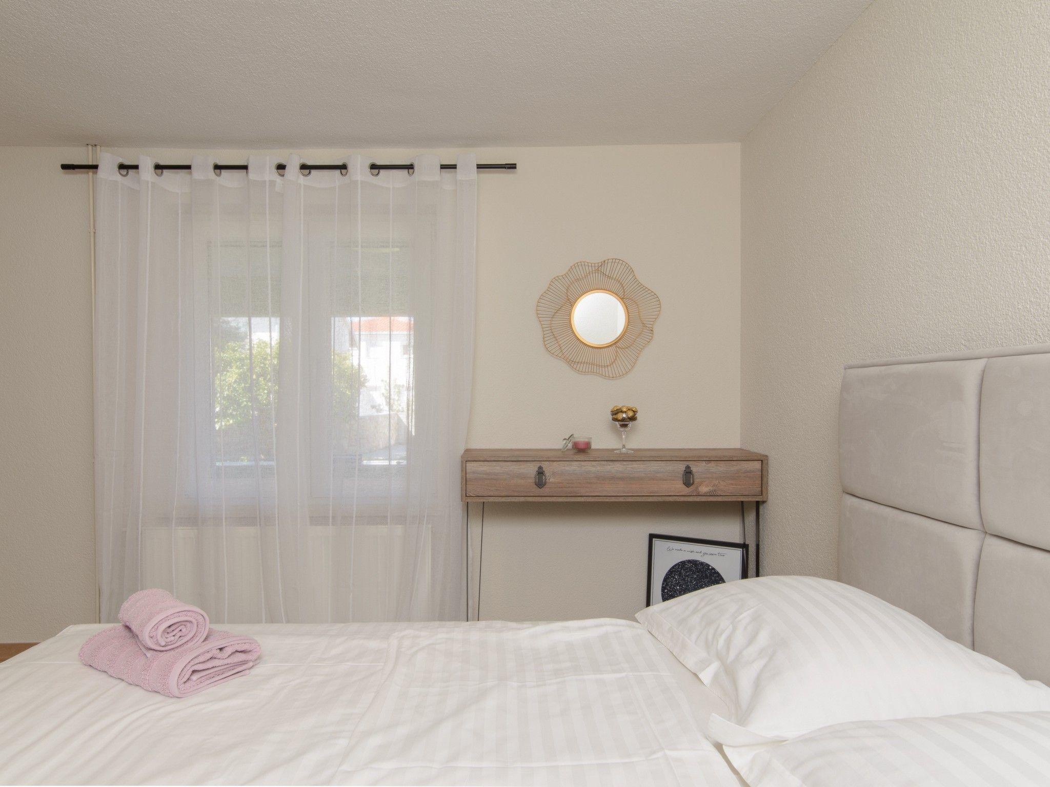 The outdoor area is perfectly designed to provide complete relaxation. Guests of apartments Maris have access to the shared heated pool (30 m2) with massage jets and a waterfall surrounded with sun loungers and parasols, while those who enjoy barbecue can use the shared barbecue in the summer kitchen, which is available on request and with previous notice. Families with children will surely appreciate the play area in the garden which consists of a slide and a swing, while the water fountain in the middle of the lush Mediterranean garden completes the ambience of a peaceful oasis.