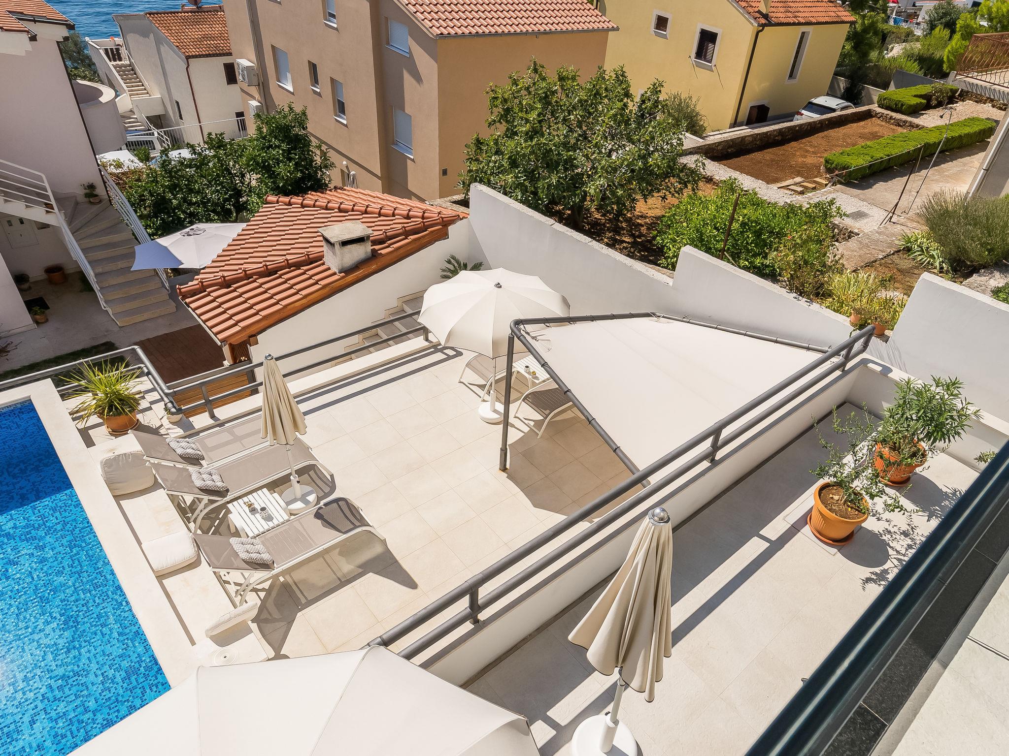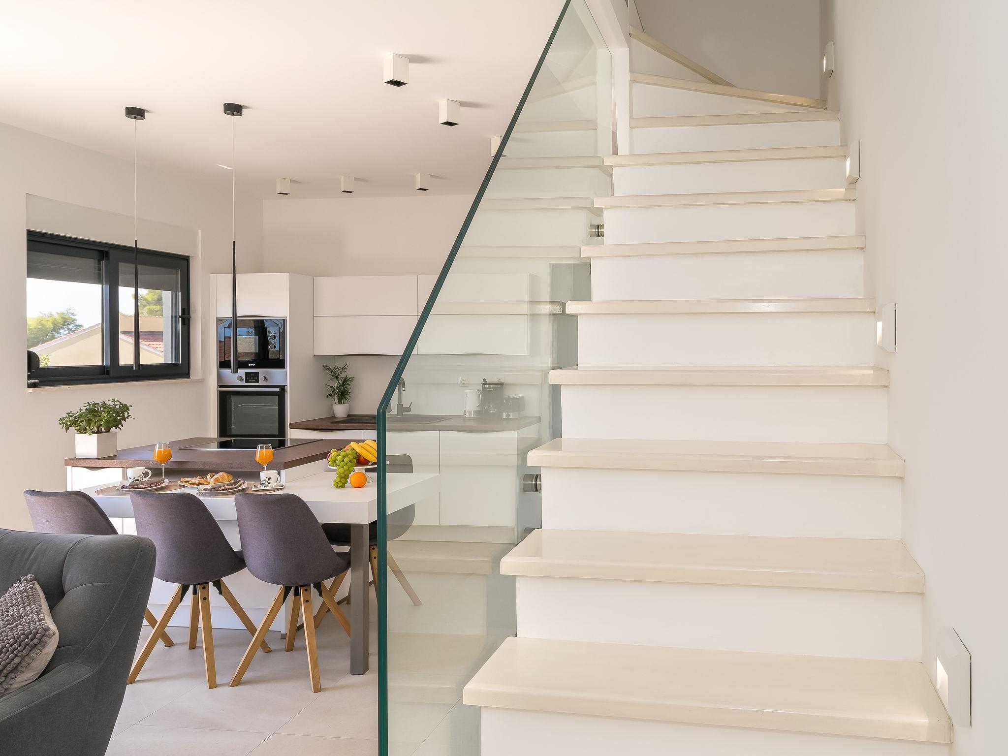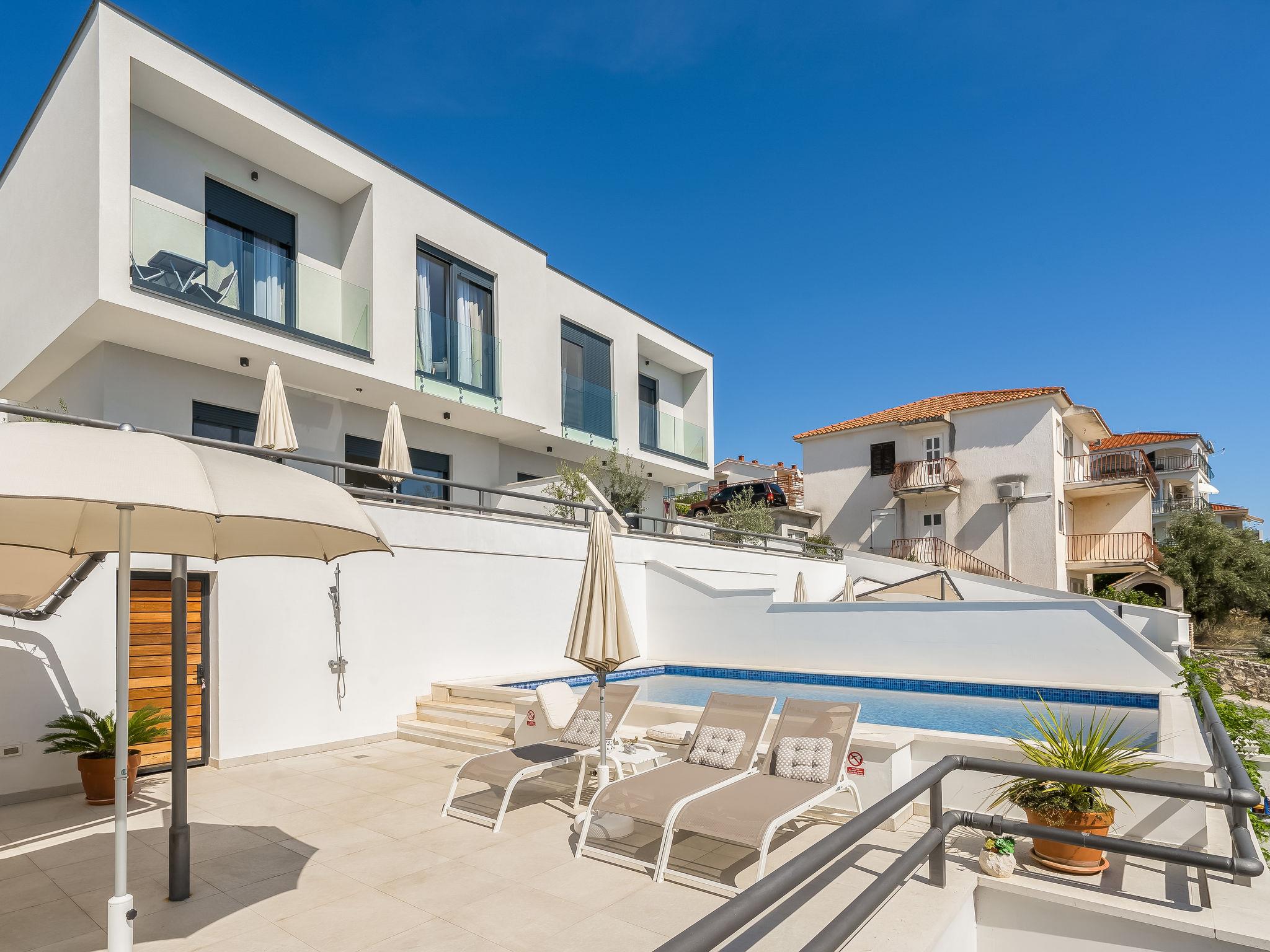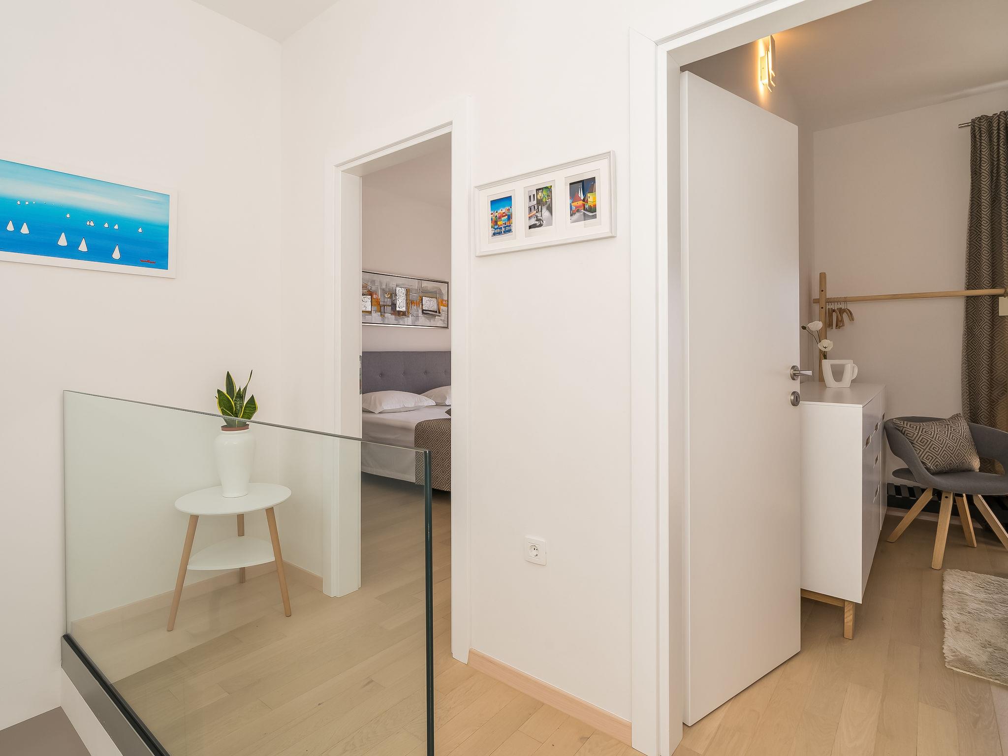 Okrug Gornji (Ciovo) 6 km from Trogir: Open staircase. Semi-detached house "Villa Meri 2", 2 storeys, built in 2019. 1.5 km from the centre of Okrug Gornji, in a quiet, sunny, elevated position, 60 m from the sea, 60 m from the beach. For shared use: swimming pool angular (7 x 4 m, 30 m2, depth 140 cm, seasonal availability: 01.May. - 15.Oct.) with internal staircase. Terrace (60 m2), garden furniture, barbecue. Private: outdoor shower. In the house: internet access, washing machine. Parking (for 2 cars) at the house on the premises. Shop 250 m, restaurant 200 m, bus stop 1.8 km, pebble beach 150 m, rocky beach 60 m. Please note: airfield 6 km from the property. Property ref. HR4910.304 is situated on the same property.
