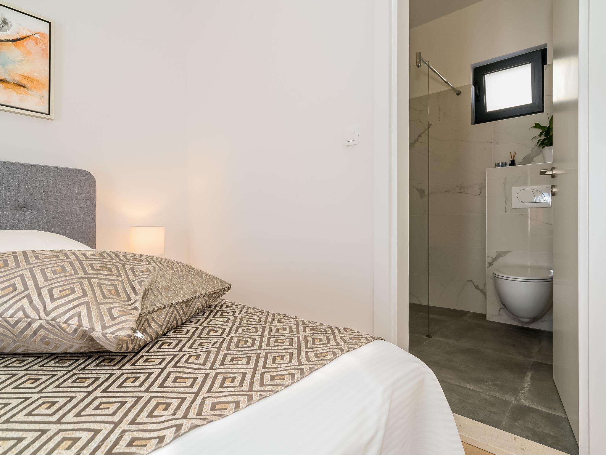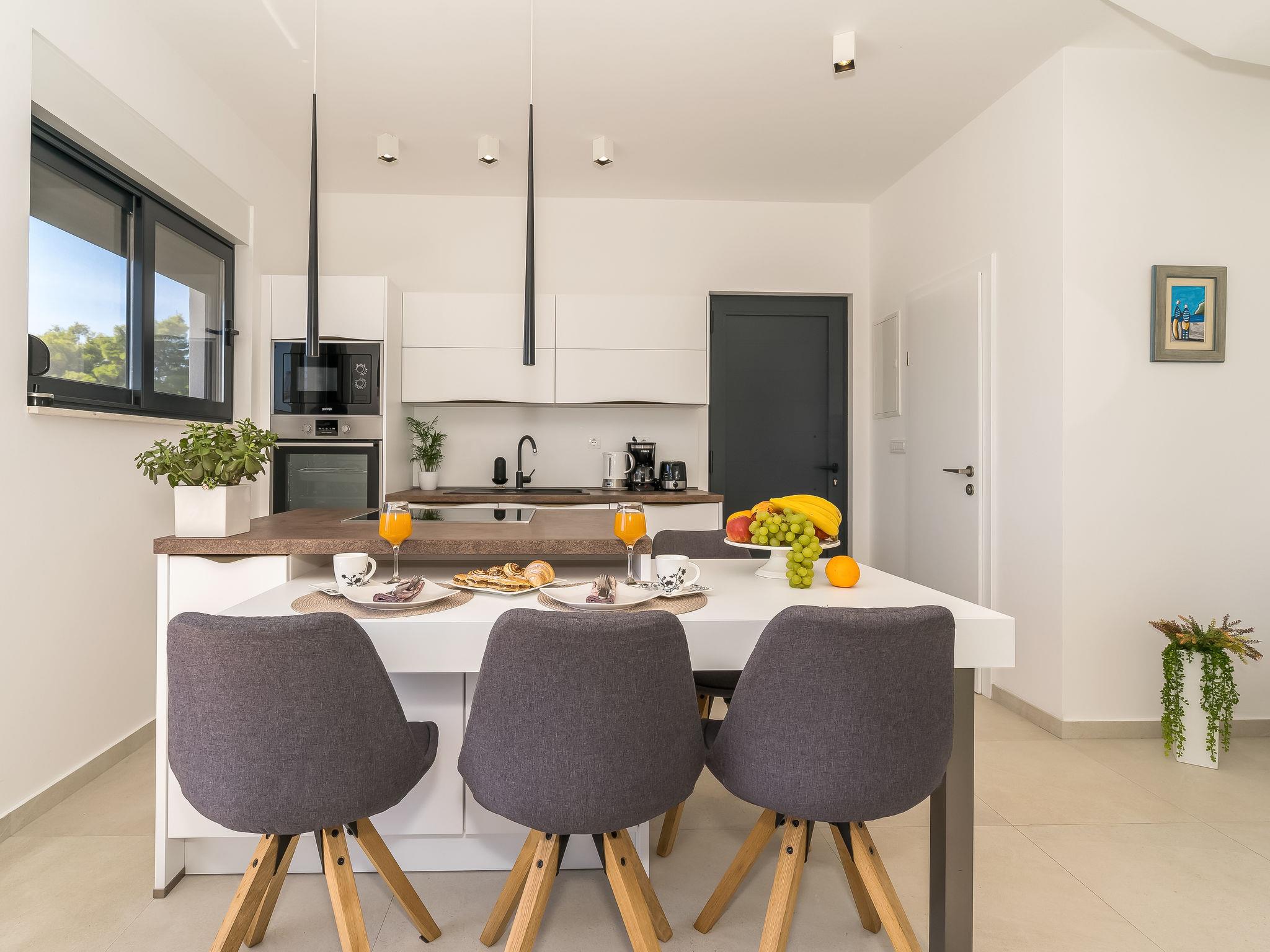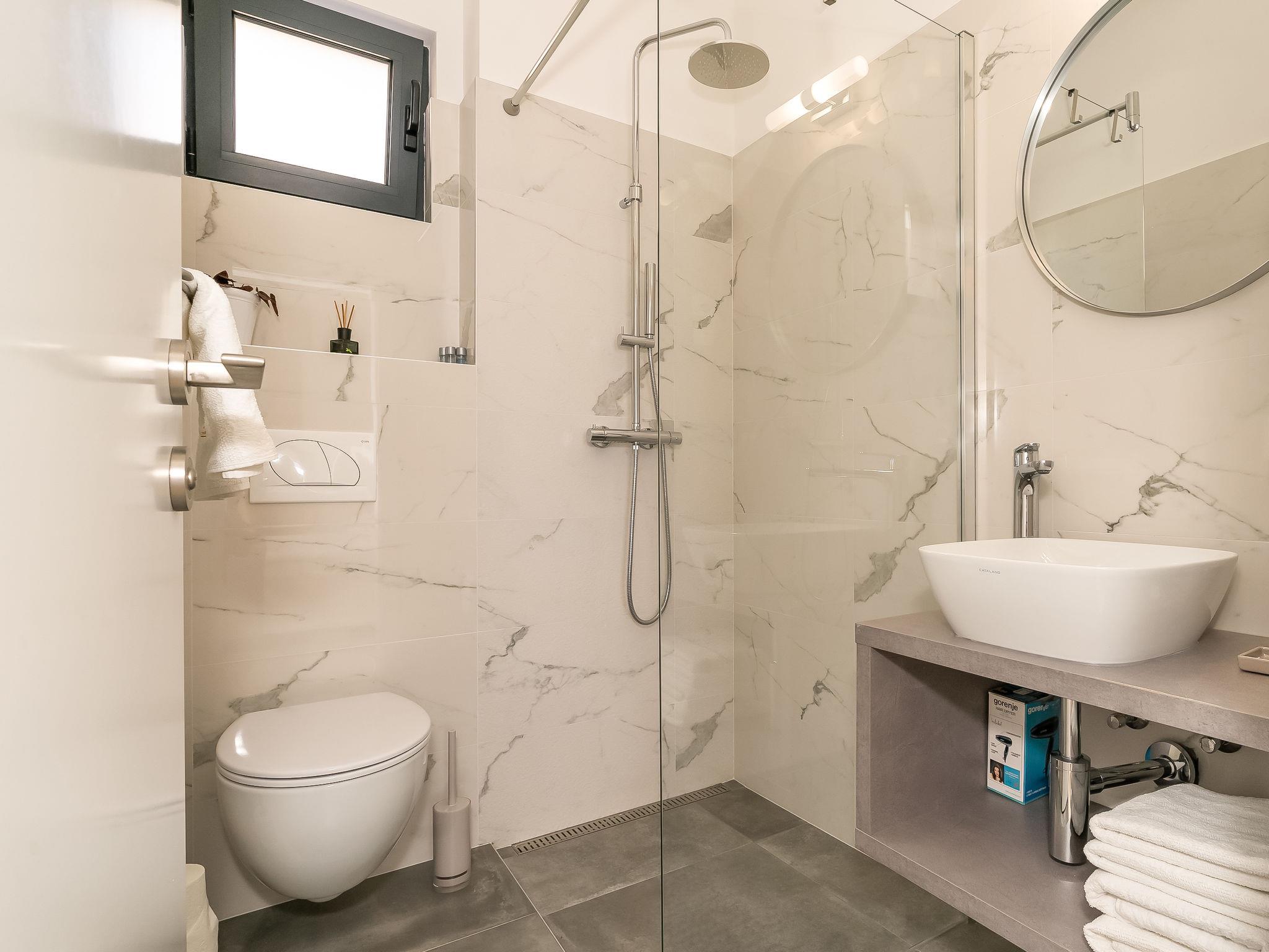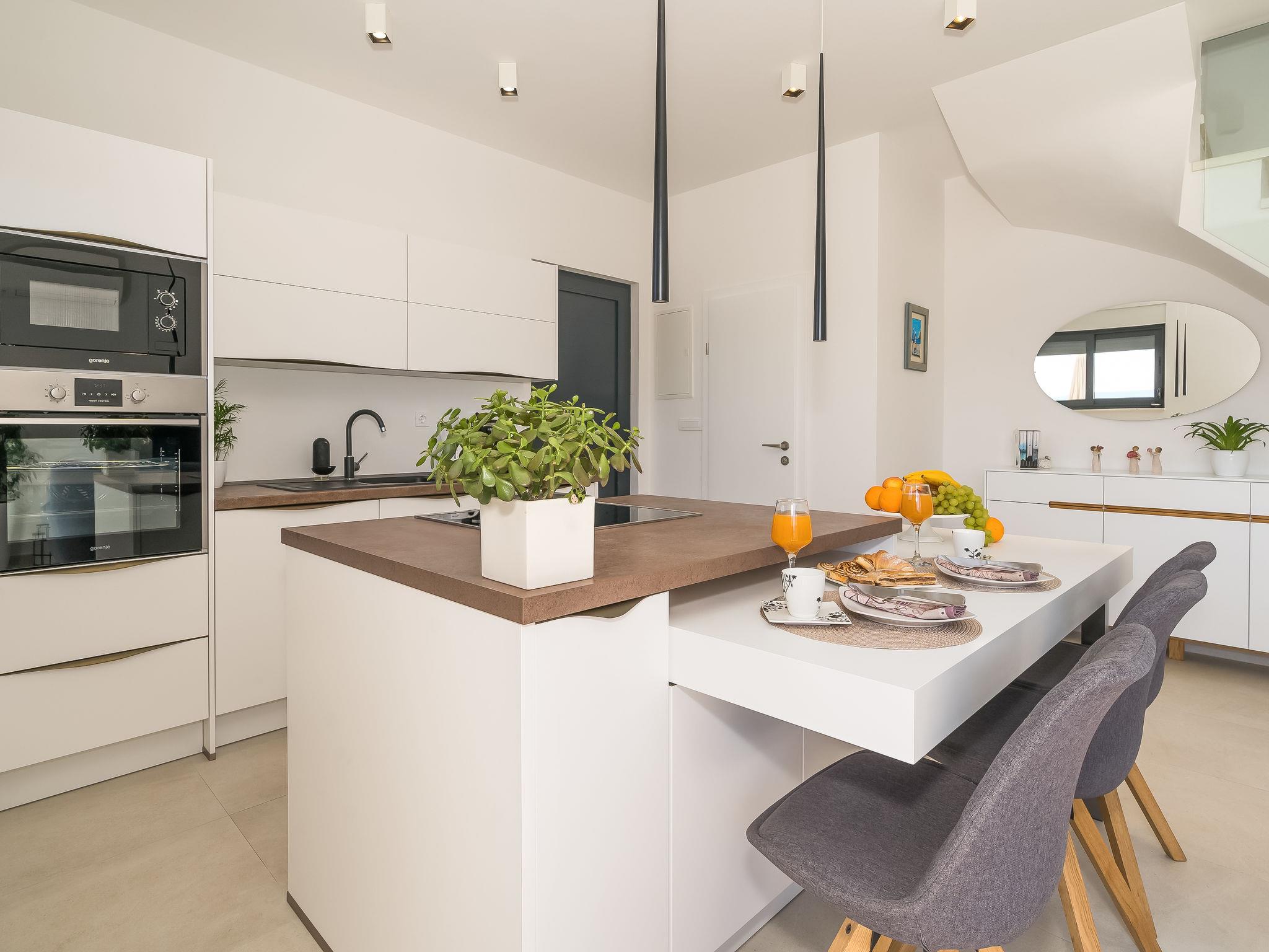 Okrug Gornji (Ciovo) 6 km from Trogir: Open staircase. Semi-detached house "Villa Meri 2", 2 storeys, built in 2019. 1.5 km from the centre of Okrug Gornji, in a quiet, sunny, elevated position, 60 m from the sea, 60 m from the beach. For shared use: swimming pool angular (7 x 4 m, 30 m2, depth 140 cm, seasonal availability: 01.May. - 15.Oct.) with internal staircase. Terrace (60 m2), garden furniture, barbecue. Private: outdoor shower. In the house: internet access, washing machine. Parking (for 2 cars) at the house on the premises. Shop 250 m, restaurant 200 m, bus stop 1.8 km, pebble beach 150 m, rocky beach 60 m. Please note: airfield 6 km from the property. Property ref. HR4910.304 is situated on the same property.