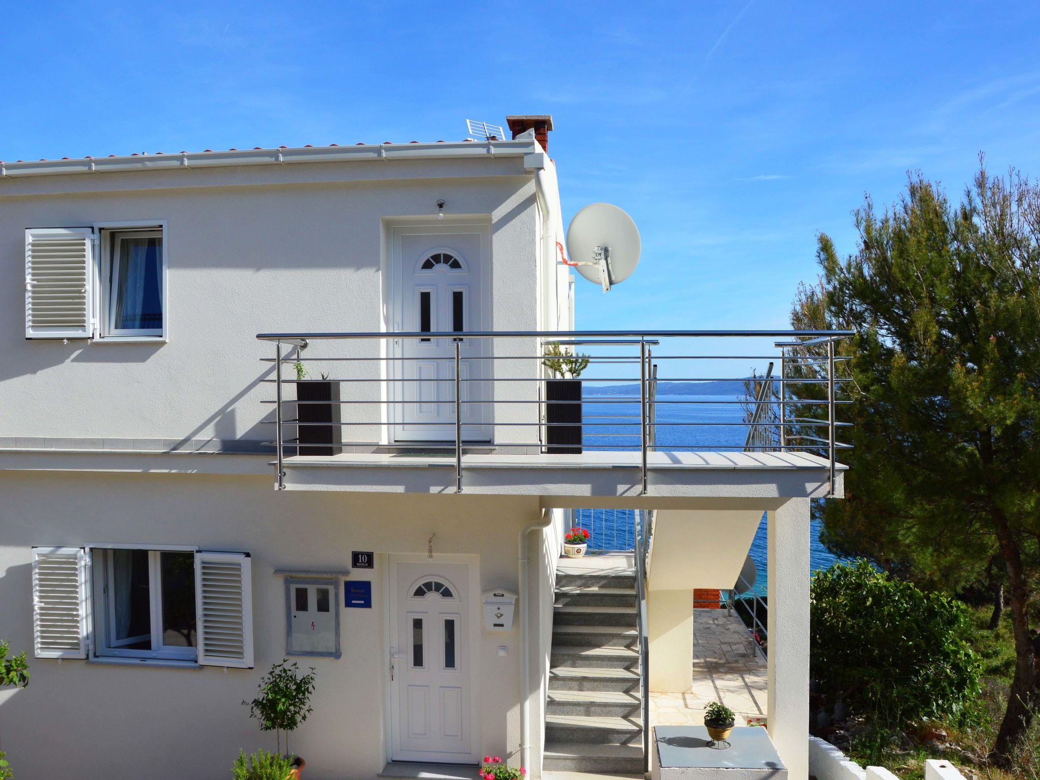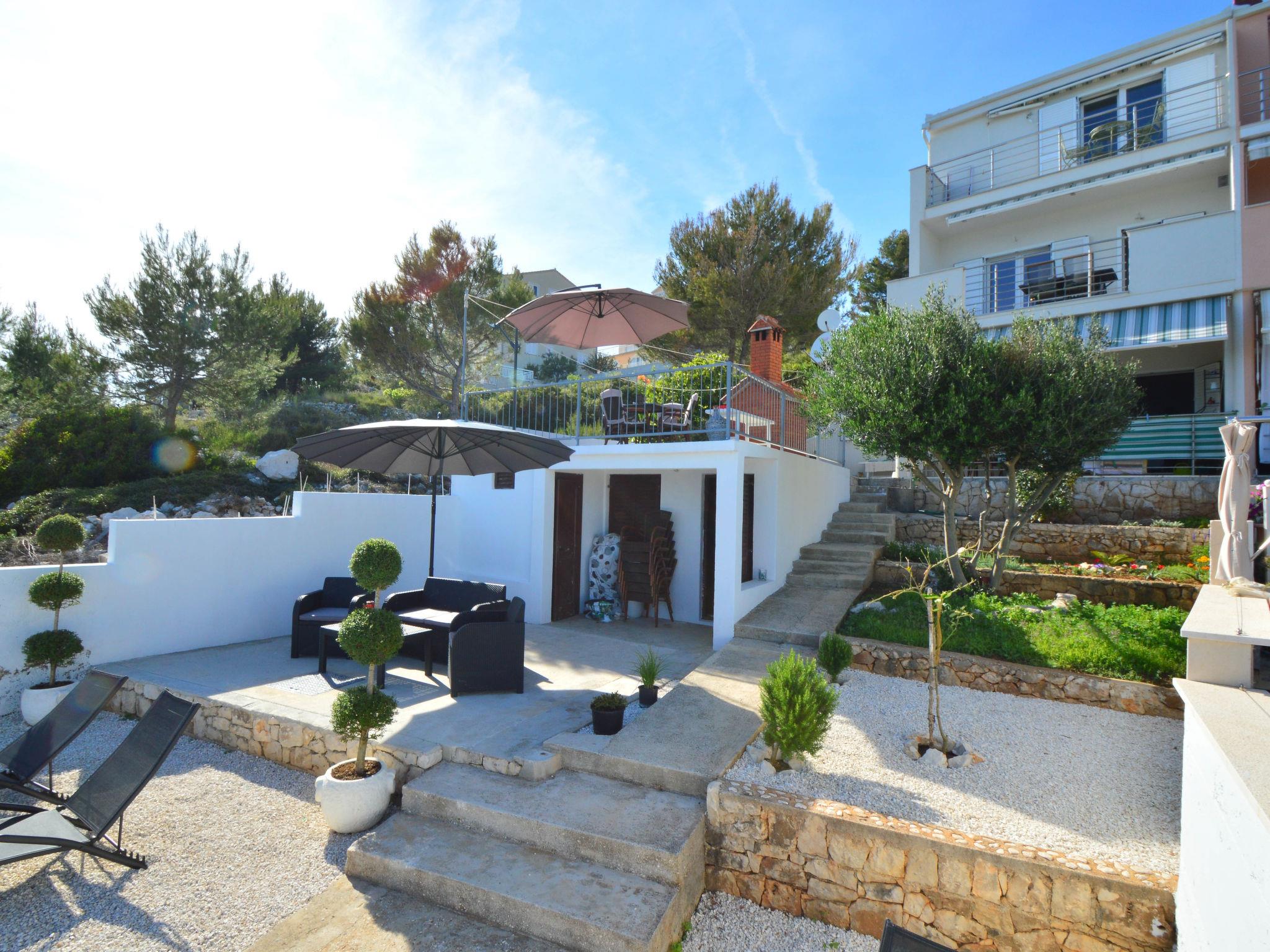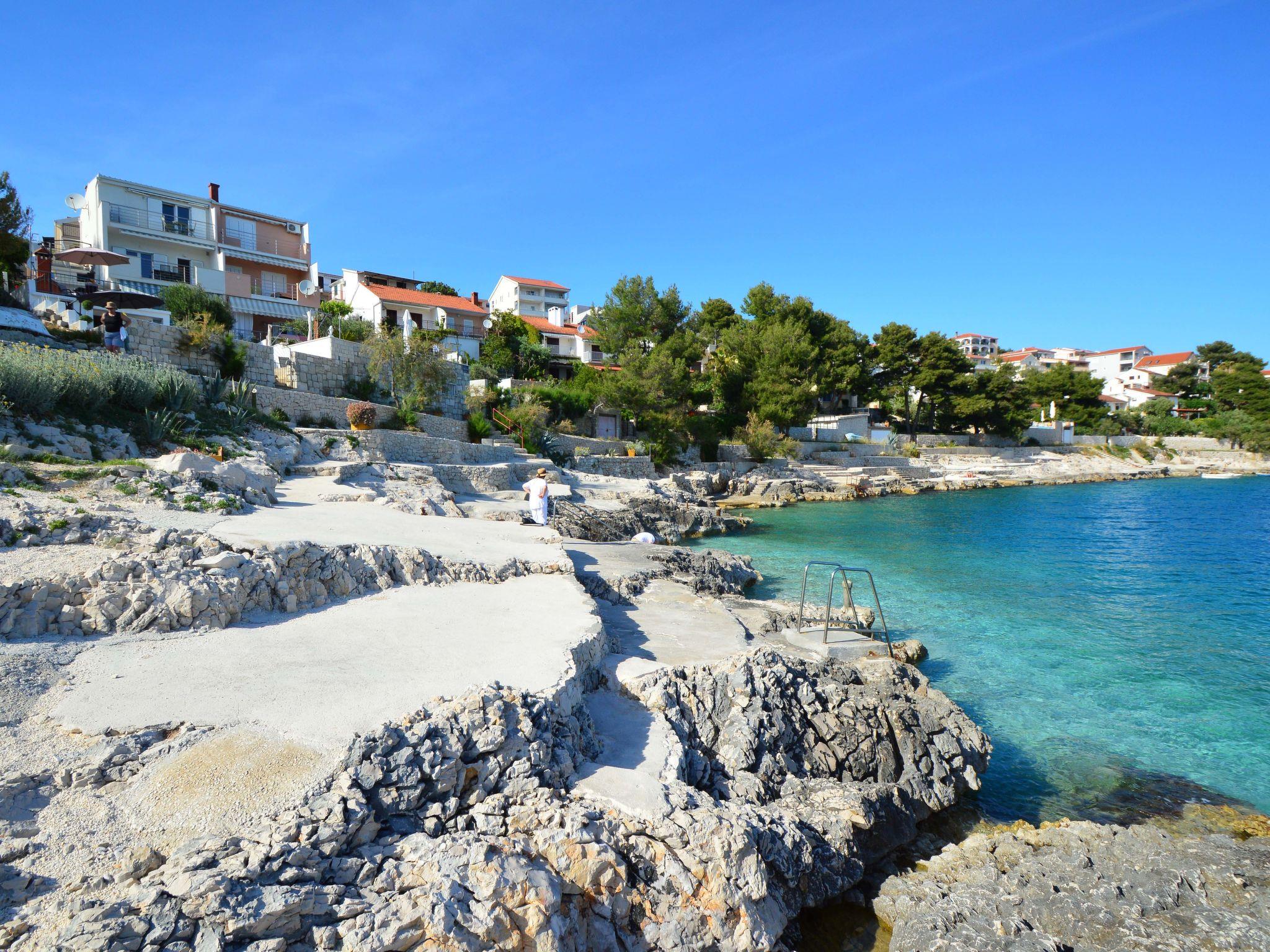 Okrug Gornji (Ciovo) 6 km from Trogir: Apartment house "Borka". 2 km from the centre of Okrug Gornji, in a quiet, sunny position, 30 m from the sea, 30 m from the beach, in a cul-de-sac. For shared use: property 250 m2 (fenced). Terrace (50 m2), garden furniture, barbecue. In the house: internet access. Parking at the house on the premises. Shop 850 m, restaurant 1 km, bus stop 2 km, rocky beach 30 m. Tennis 2.5 km. Please note: airfield 10 km from the property.