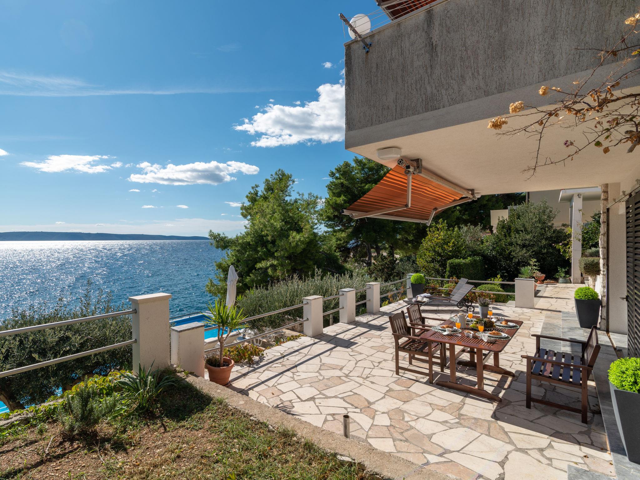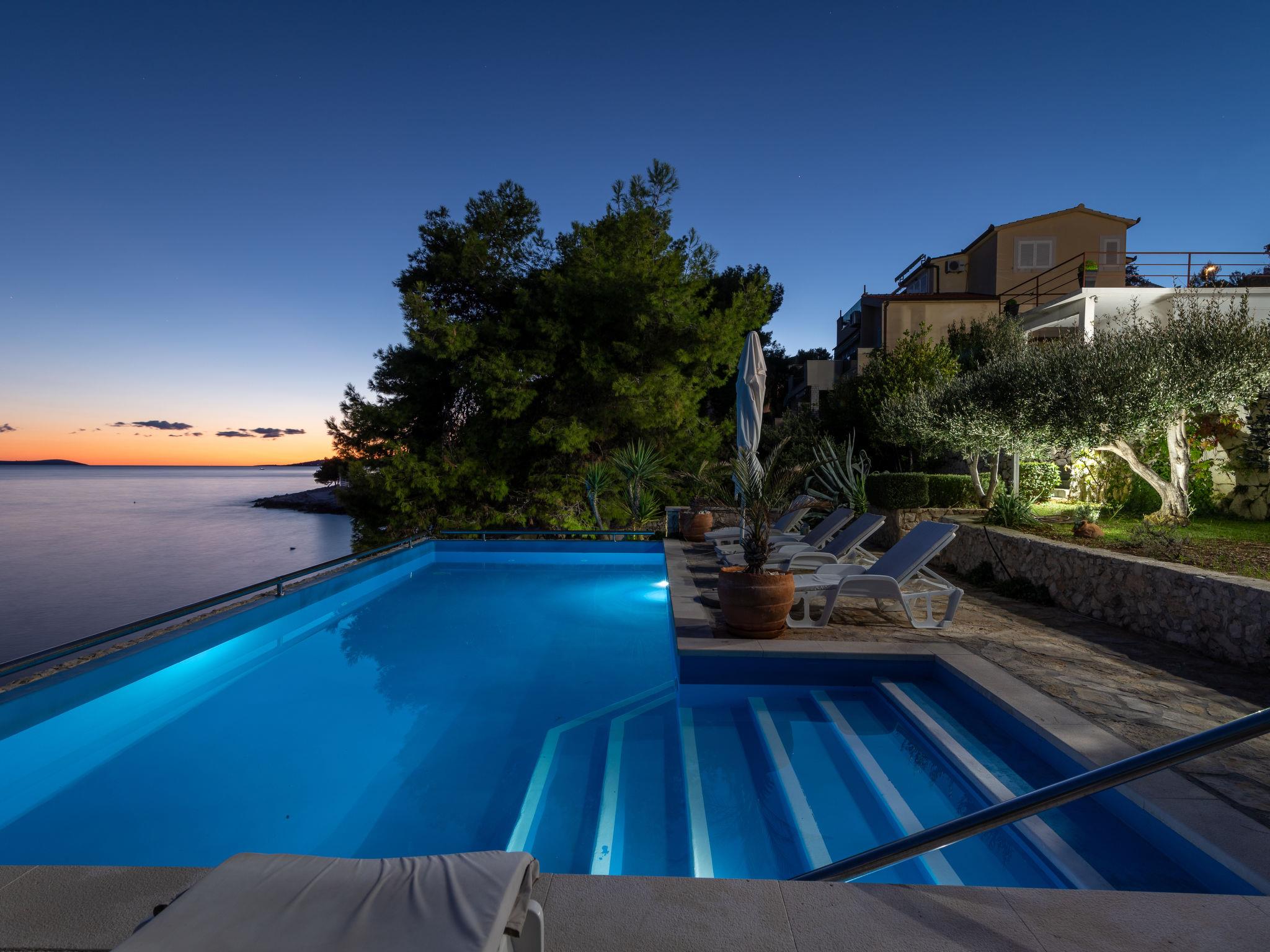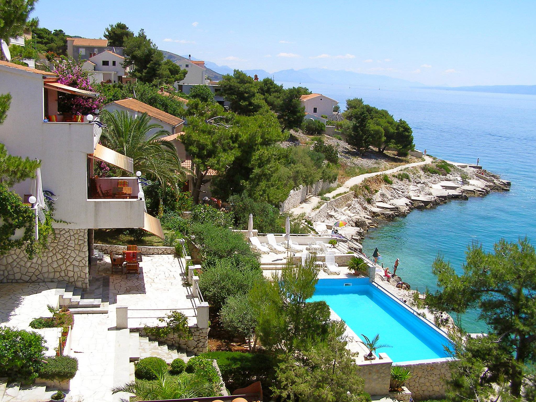 Okrug Gornji (Ciovo), 6 km from Trogir: Beautiful, cosy apartment house "Villa Pinia". Outside the resort, 1.5 km from the centre of Okrug Gornji, in a quiet, sunny, elevated position, 20 m from the sea, 20 m from the beach, in the countryside. For shared use: garden with plants, swimming pool angular (11 x 4 m, depth 120 - 140 cm, seasonal availability: 25.Apr. - 12.Sep.) with salt water and internal staircase. Outdoor shower, patio, barbecue. In the house: internet access, washing machine. Steep motor access to the house. Parking at the house on the premises. Shop 250 m, restaurant 1.5 km, bus stop 1.9 km, pebble beach 100 m, rocky beach 20 m. Please note: Additional accommodations can be booked.