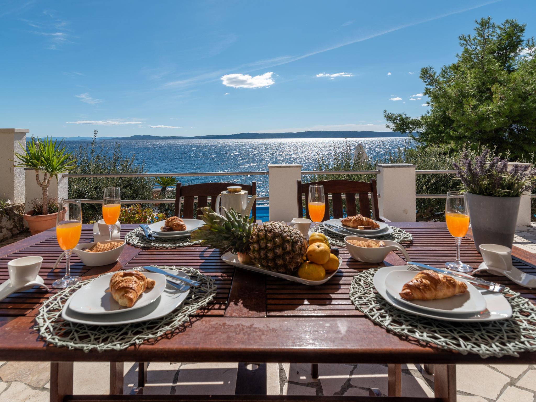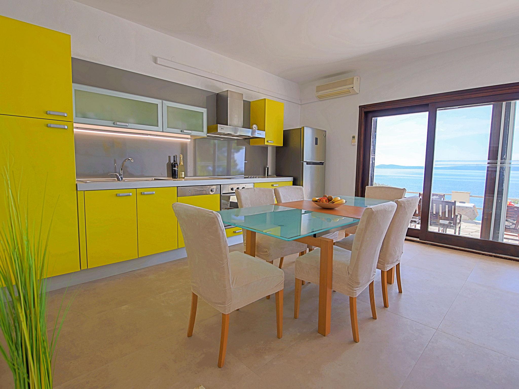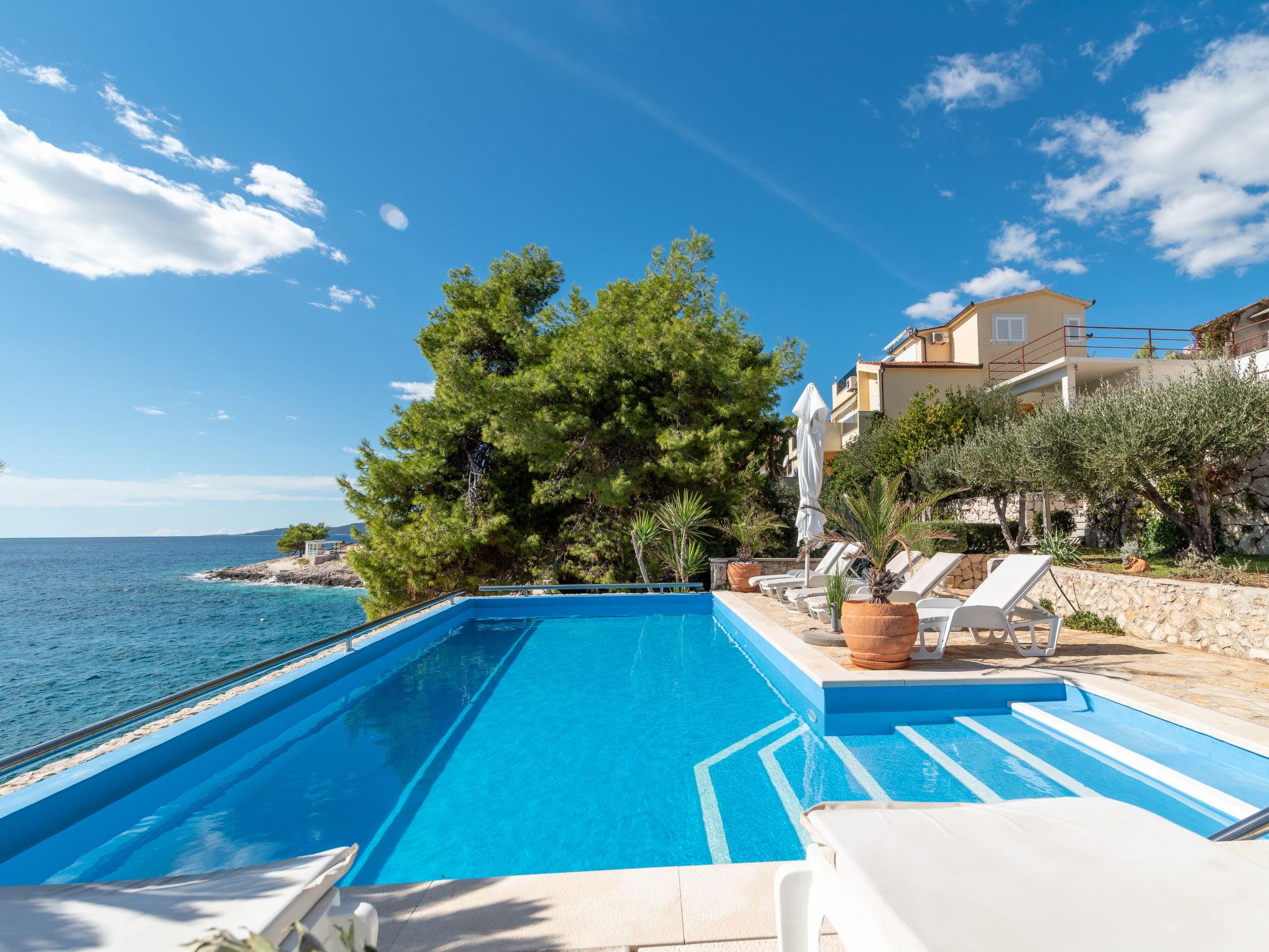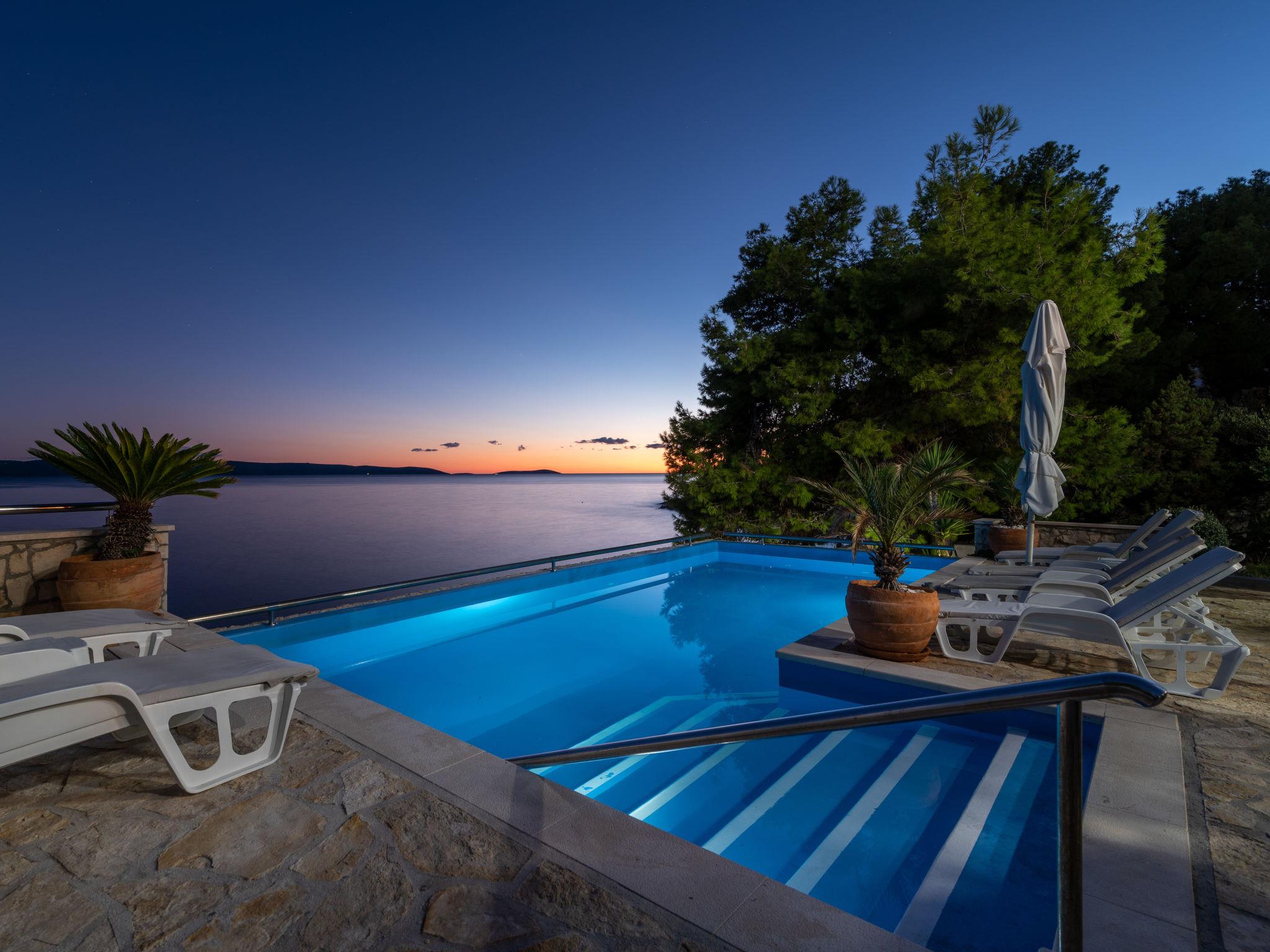 Okrug Gornji (Ciovo), 6 km from Trogir: Beautiful, cosy apartment house "Villa Pinia". Outside the resort, 1.5 km from the centre of Okrug Gornji, in a quiet, sunny, elevated position, 20 m from the sea, 20 m from the beach, in the countryside. For shared use: garden with plants, swimming pool angular (11 x 4 m, depth 120 - 140 cm, seasonal availability: 25.Apr. - 12.Sep.) with salt water and internal staircase. Outdoor shower, patio, barbecue. In the house: internet access, washing machine. Steep motor access to the house. Parking at the house on the premises. Shop 250 m, restaurant 1.5 km, bus stop 1.9 km, pebble beach 100 m, rocky beach 20 m. Please note: Additional accommodations can be booked.