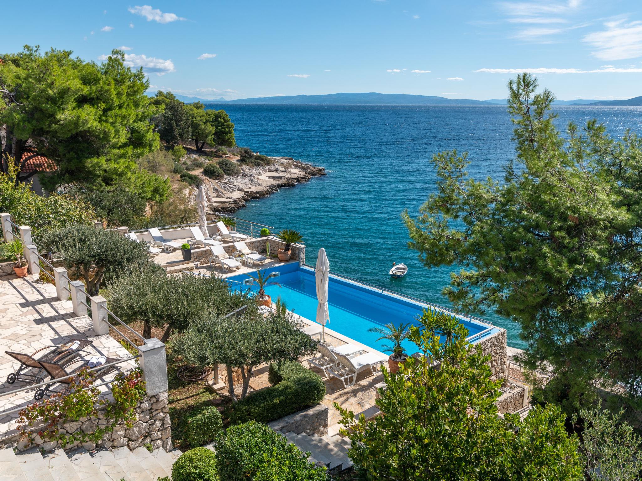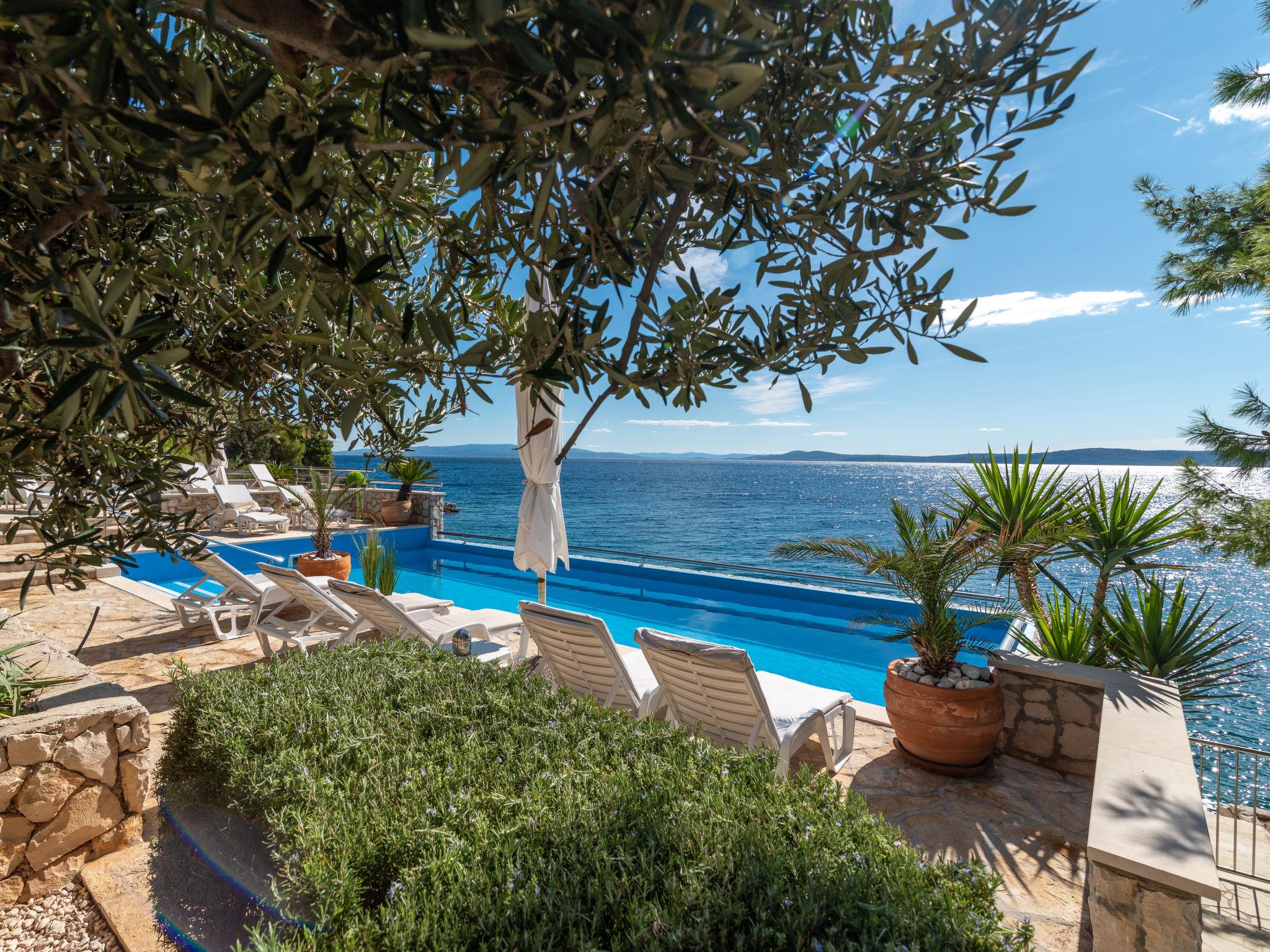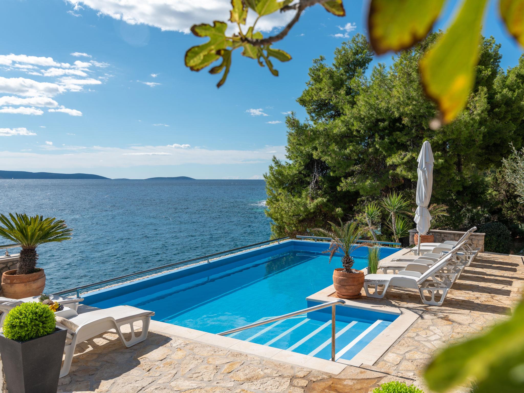 Okrug Gornji (Ciovo), 6 km from Trogir: Beautiful, cosy apartment house "Villa Pinia". Outside the resort, 1.5 km from the centre of Okrug Gornji, in a quiet, sunny, elevated position, 20 m from the sea, 20 m from the beach, in the countryside. For shared use: garden with plants, swimming pool angular (11 x 4 m, depth 120 - 140 cm, seasonal availability: 25.Apr. - 12.Sep.) with salt water and internal staircase. Outdoor shower, patio, barbecue. In the house: internet access, washing machine. Steep motor access to the house. Parking at the house on the premises. Shop 250 m, restaurant 1.5 km, bus stop 1.9 km, pebble beach 100 m, rocky beach 20 m. Please note: Additional accommodations can be booked.