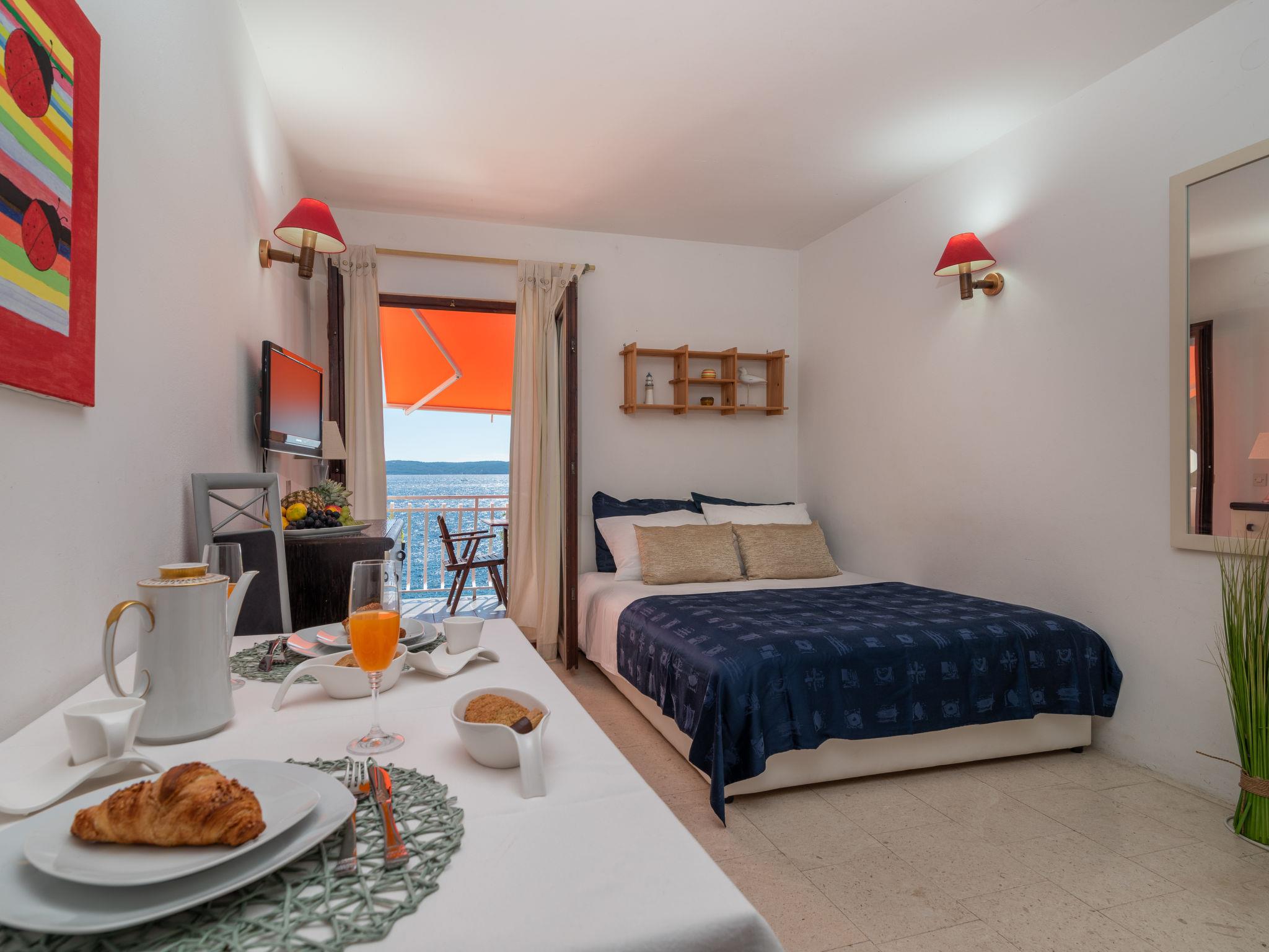 1-room apartment 18 m2 on 1st floor. Studio with 1 french bed (140 cm, length 200 cm), satellite TV and air conditioning. Open kitchen (2 hot plates) with dining table. Shower/bidet/WC. Terrace, south facing position. Terrace furniture. Marvellous panoramic view of the sea and the swimming pool. Facilities: hair dryer. Internet (WiFi, free).