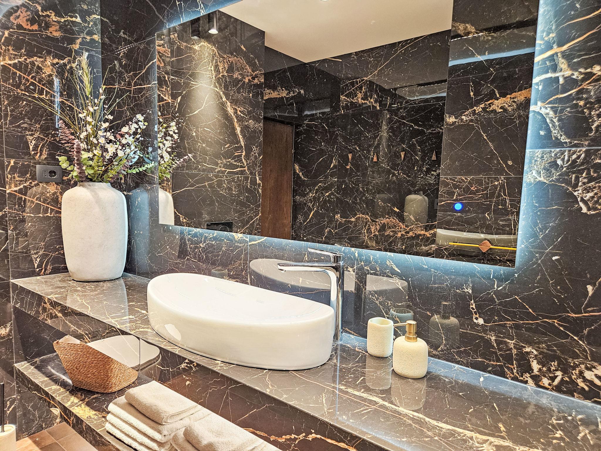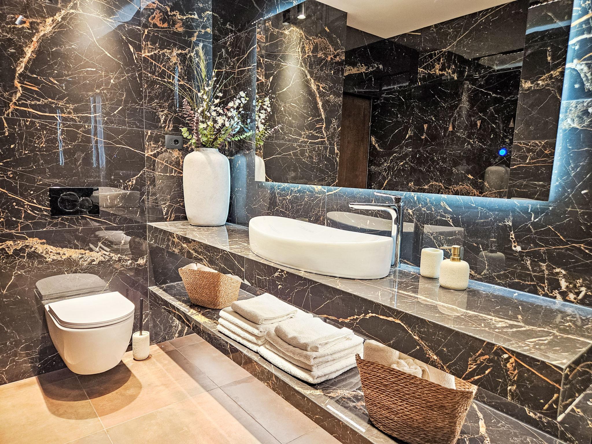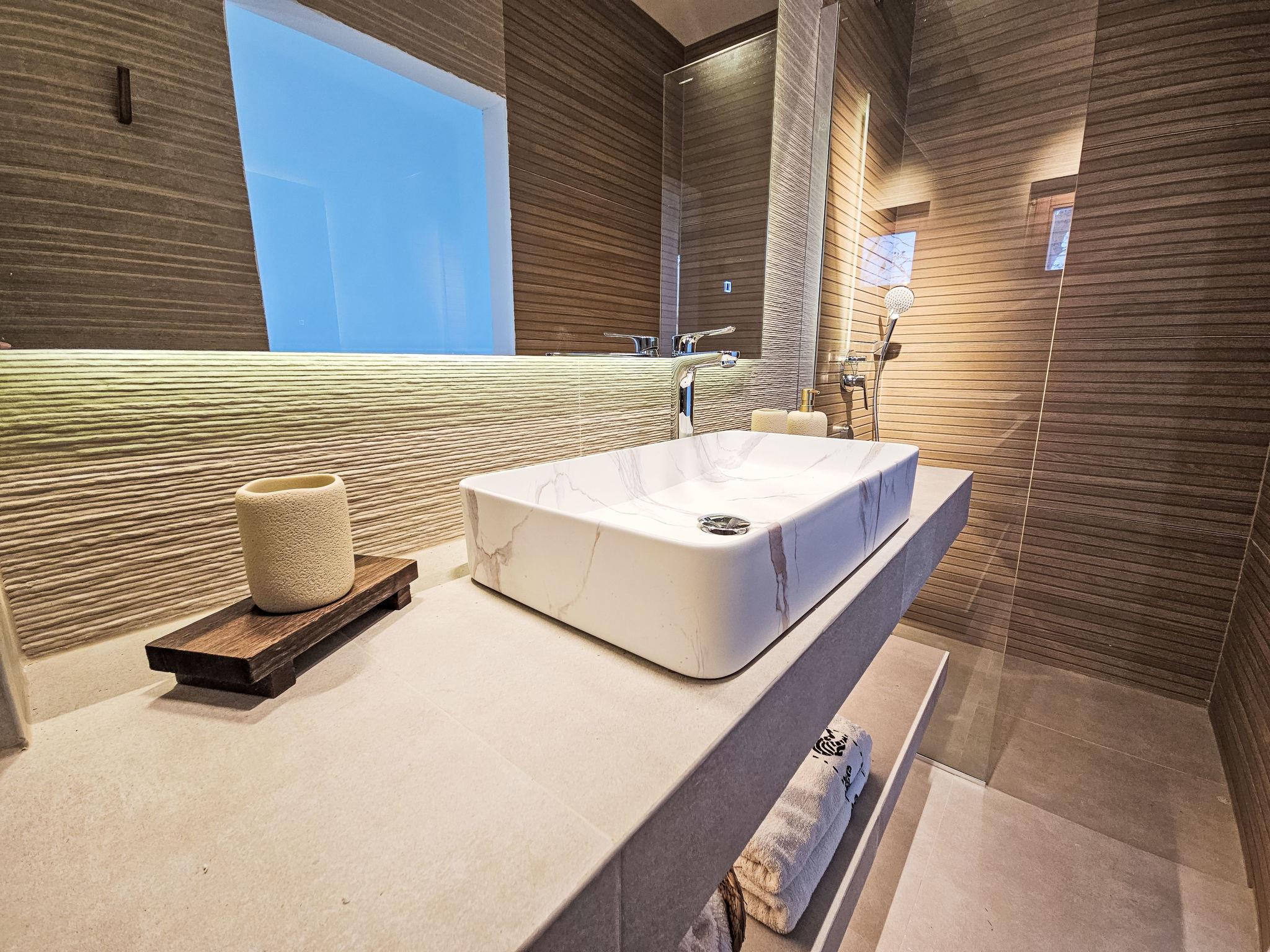 4-room apartment 120 m2 on 1st floor. Tasteful and cosy furnishings: living/dining room, on 2 levels with panoramic window with satellite TV and air conditioning. Exit to the balcony, south facing position. 1 double bedroom with shower/WC and air conditioning. Exit to the balcony, south facing position. 1 room with 1 bed and 1 x 2 bunk beds, air conditioning. 1 double bedroom with air conditioning. Kitchenette (4 hot plates, oven, dishwasher, freezer). Bath/bidet/WC. Terrace furniture. Marvellous panoramic view of the sea and the swimming pool. Facilities: children's high chair, baby cot, hair dryer. Internet (WiFi, free).
