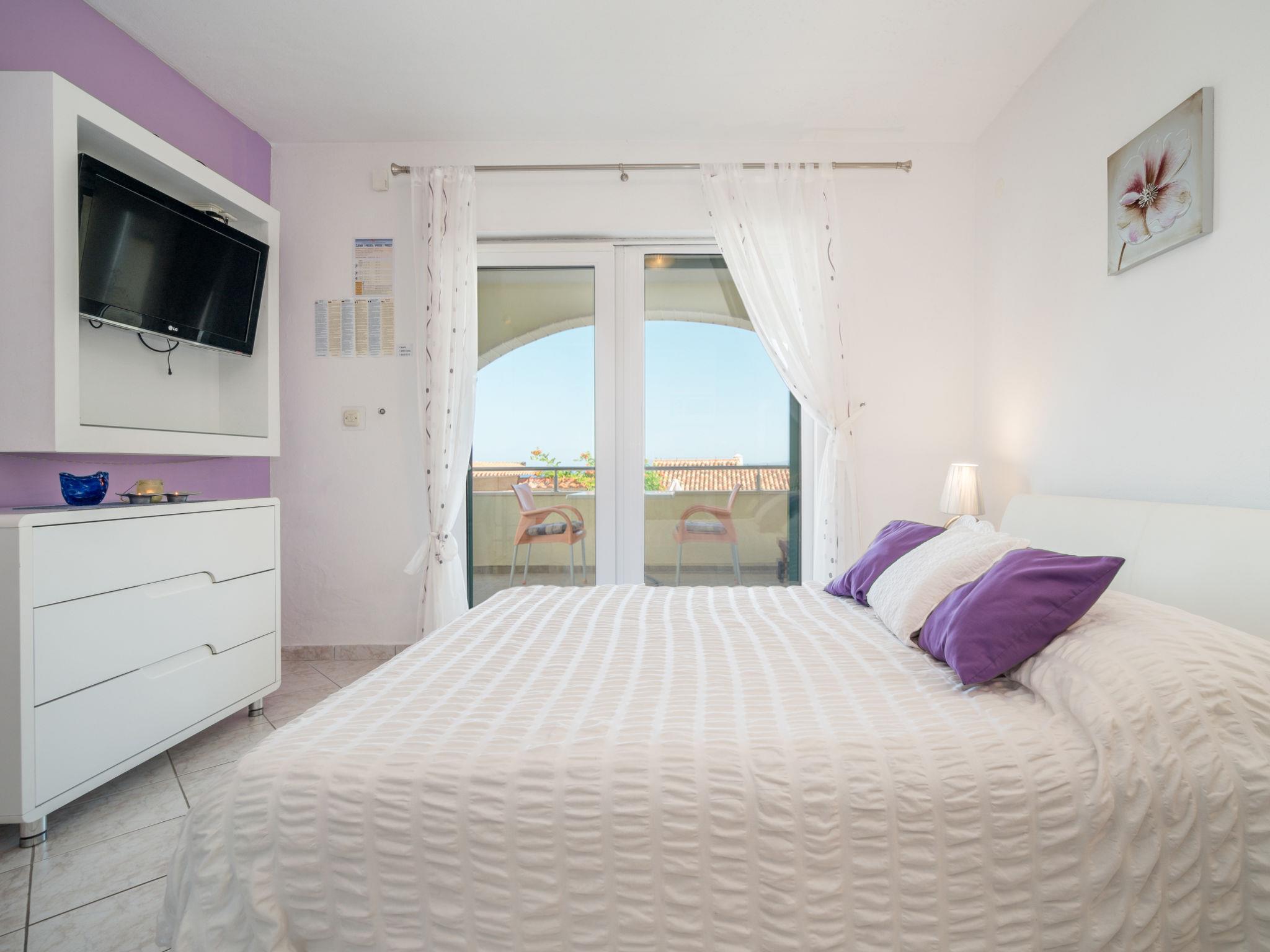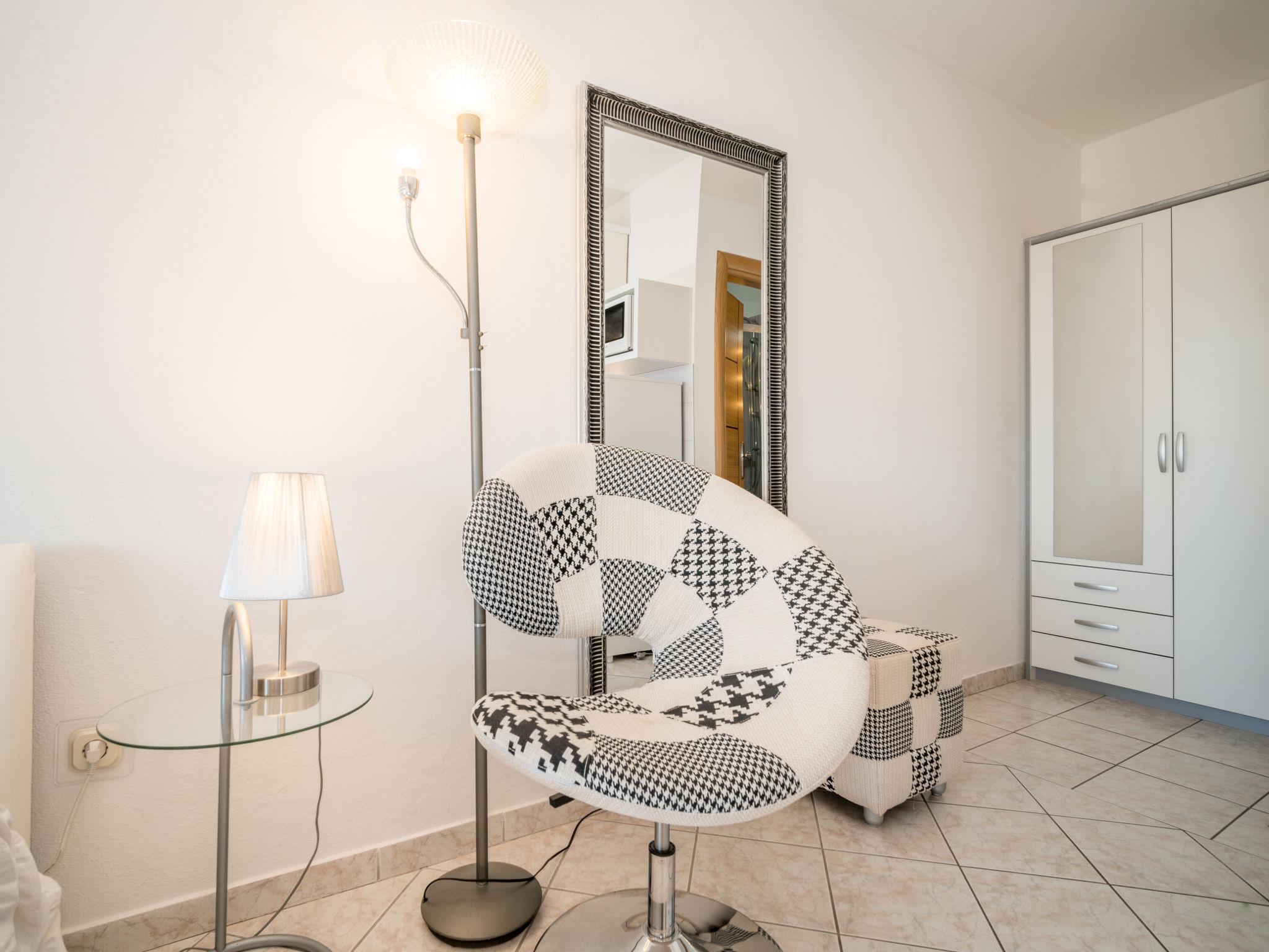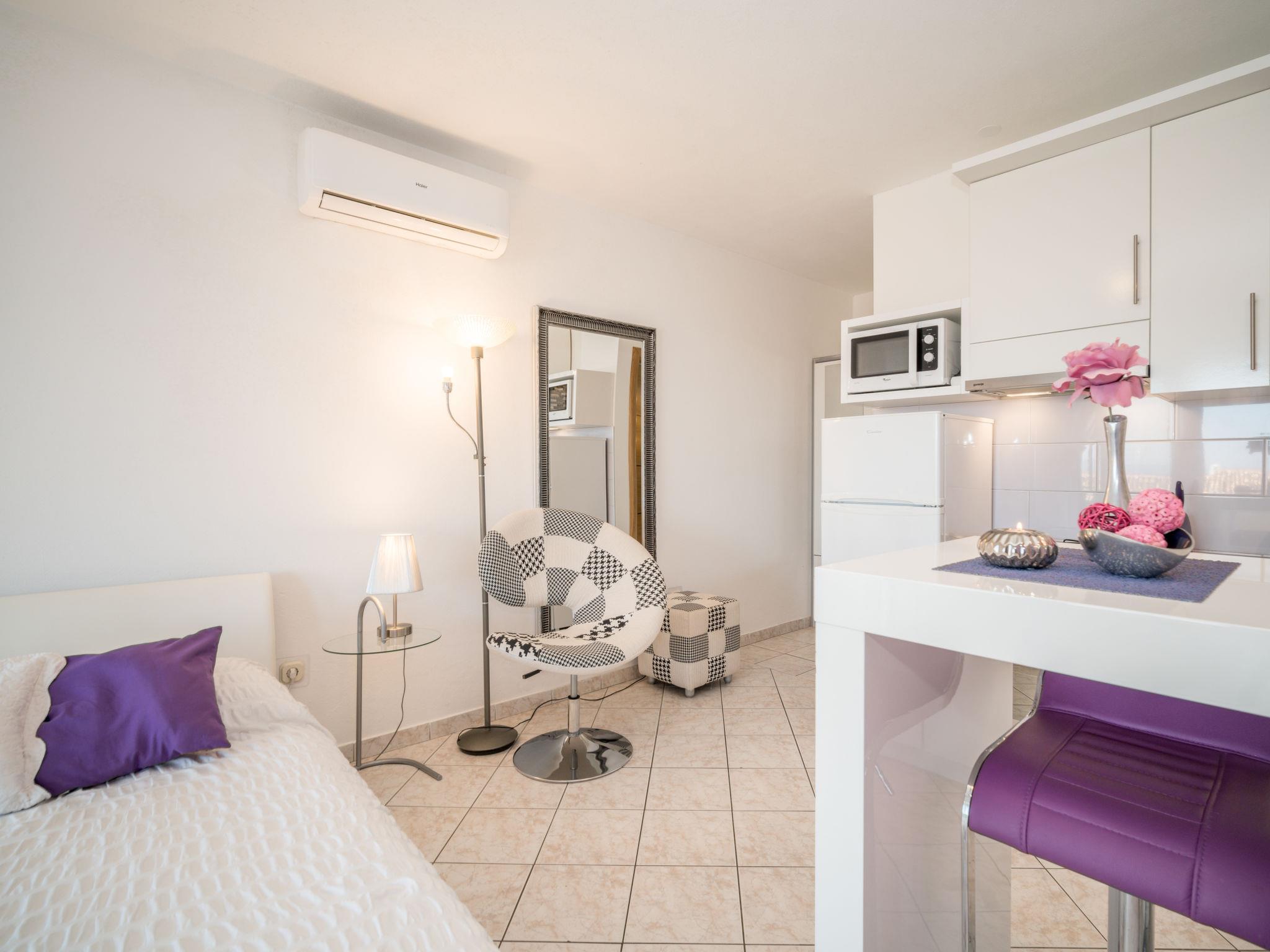 1-room studio 24 m2, on the ground floor. Living/sleeping room with 1 double bed, satellite TV and air conditioning. Exit to the terrace. Open kitchen (4 hot plates, oven, microwave, electric coffee machine) with dining table. Shower/WC. Terrace 10 m2, roofed. Terrace furniture. View of the sea and the swimming pool. Facilities: Internet (WiFi, free).