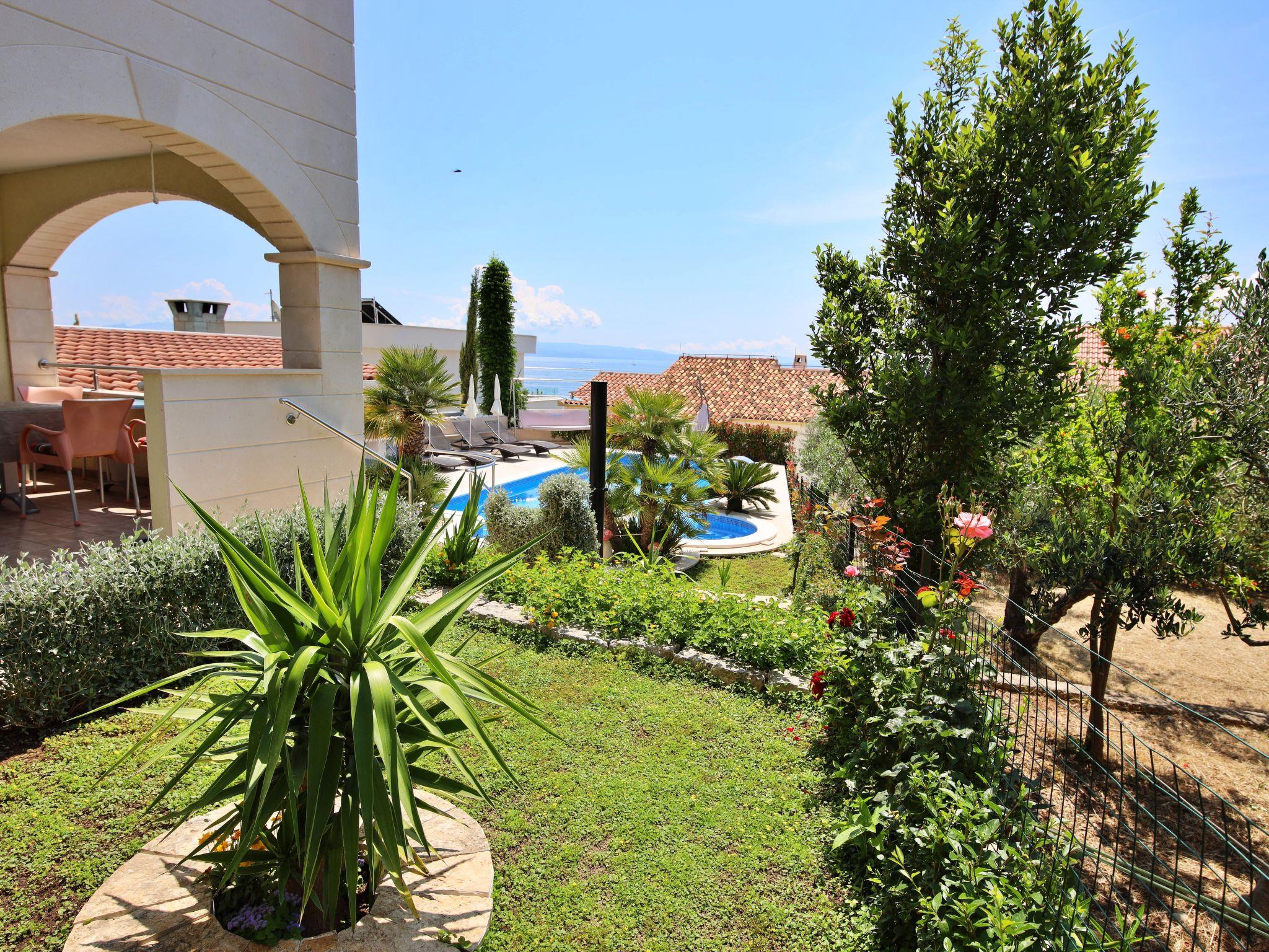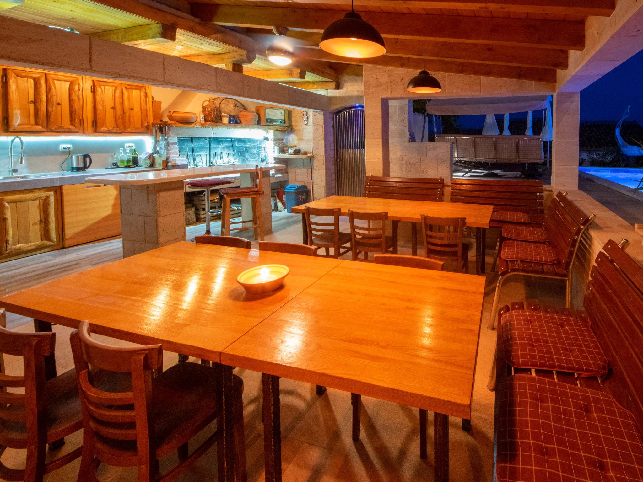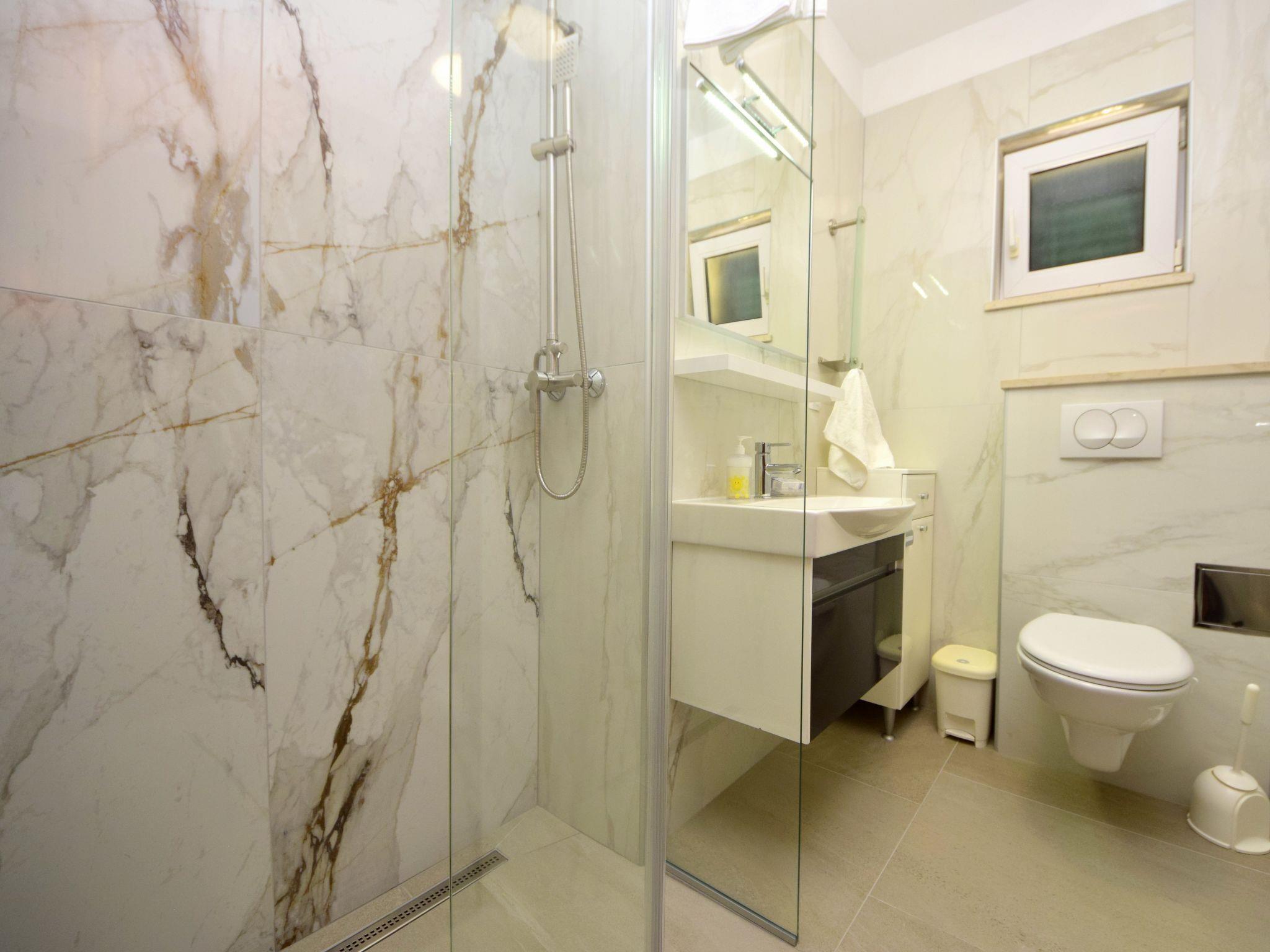 Okrug Gornji (Ciovo), 6 km from Trogir: Beautiful apartment house "Villa Andjelka". 1 km from the centre of Okrug Gornji, in a quiet, sunny, elevated position, 50 m from the sea, 50 m from the beach. For shared use: property, swimming pool heated (38 m2, depth 130 - 160 cm, seasonal availability: 25.Apr. - 03.Oct.) with internal staircase. WC in the pool area, outdoor shower, poolhouse with fridge, terrace, garden furniture, barbecue. In the house: internet access, sauna (extra). Washing machine, tumble dryer. Towel change 2 times per week. Parking at the house on the premises. E-charging station. Shop 200 m, restaurant 1 km, café 1 km, bus stop 1.7 km, pebble beach 500 m, rocky beach 50 m. Please note: Additional accommodations can be booked. Swimming pool with counterflow, geysir and hydromassage. For shared use: outdoor kitchen (fridge, ice maker, coffee machine, dishwasher).