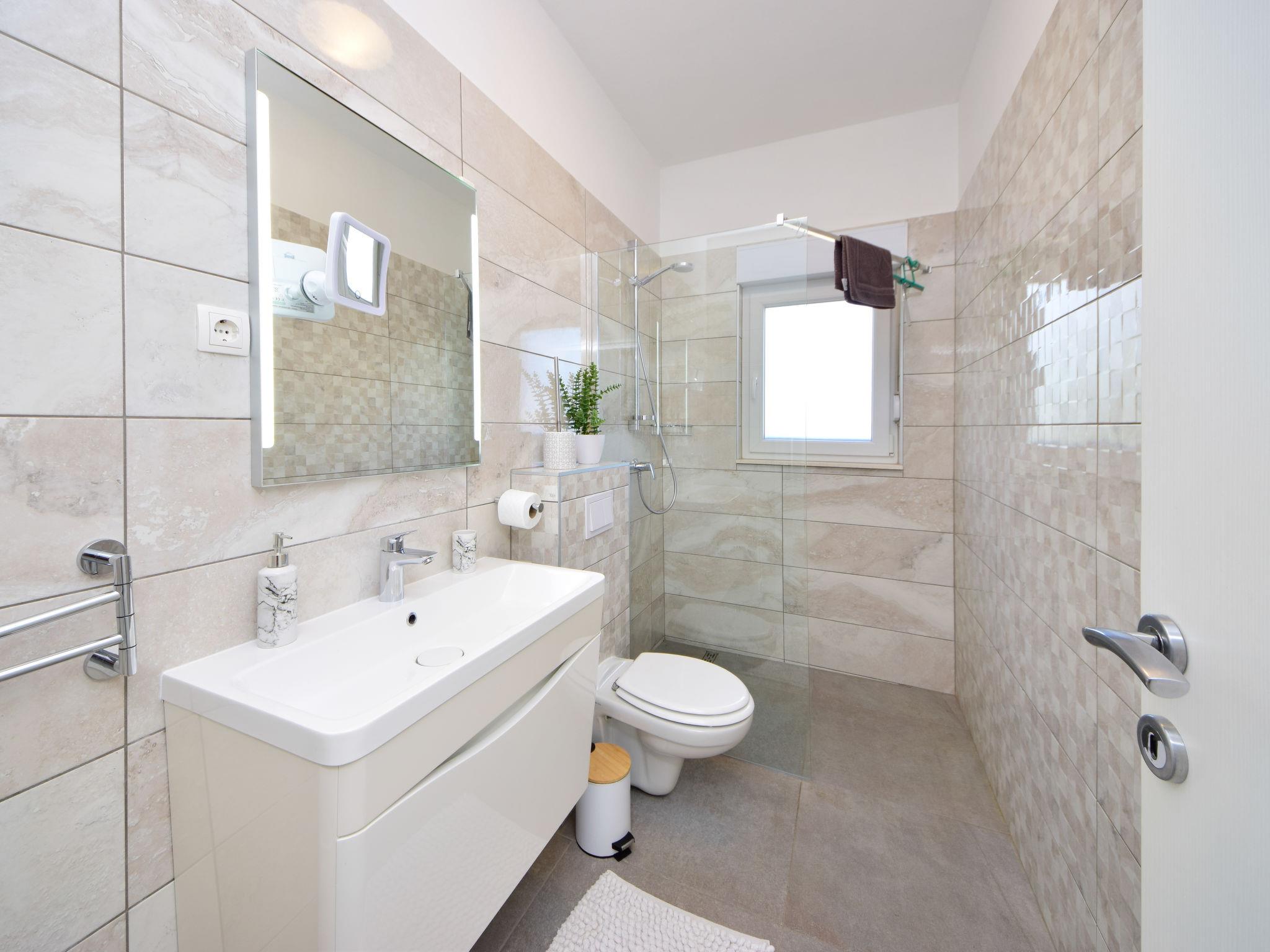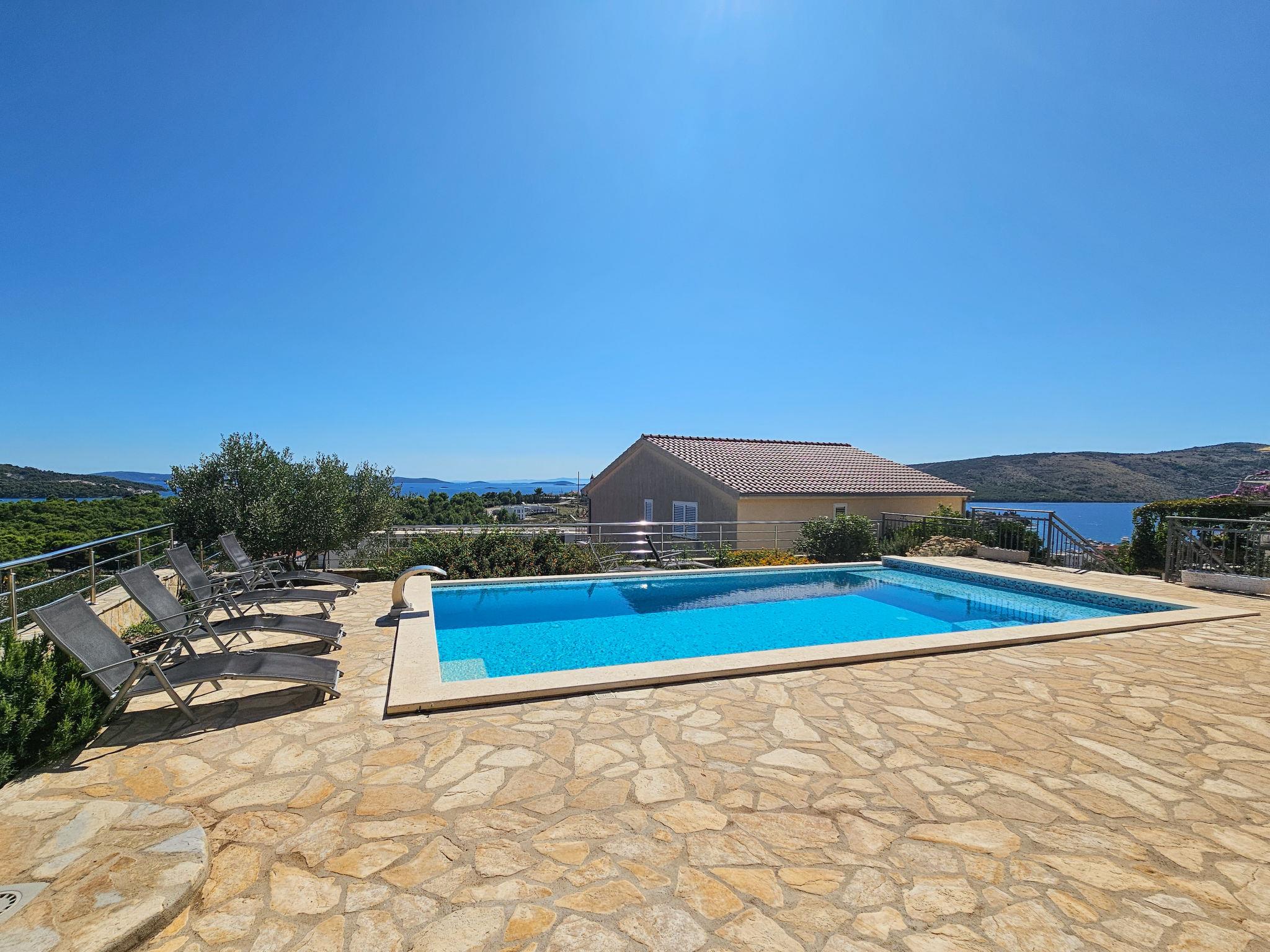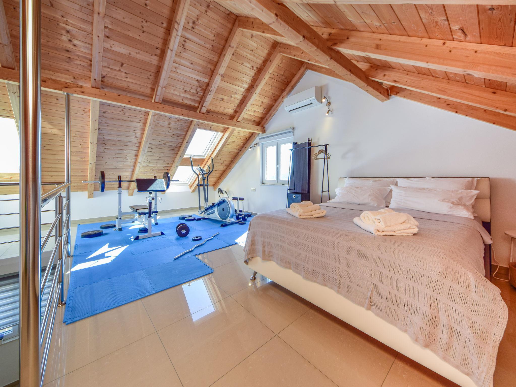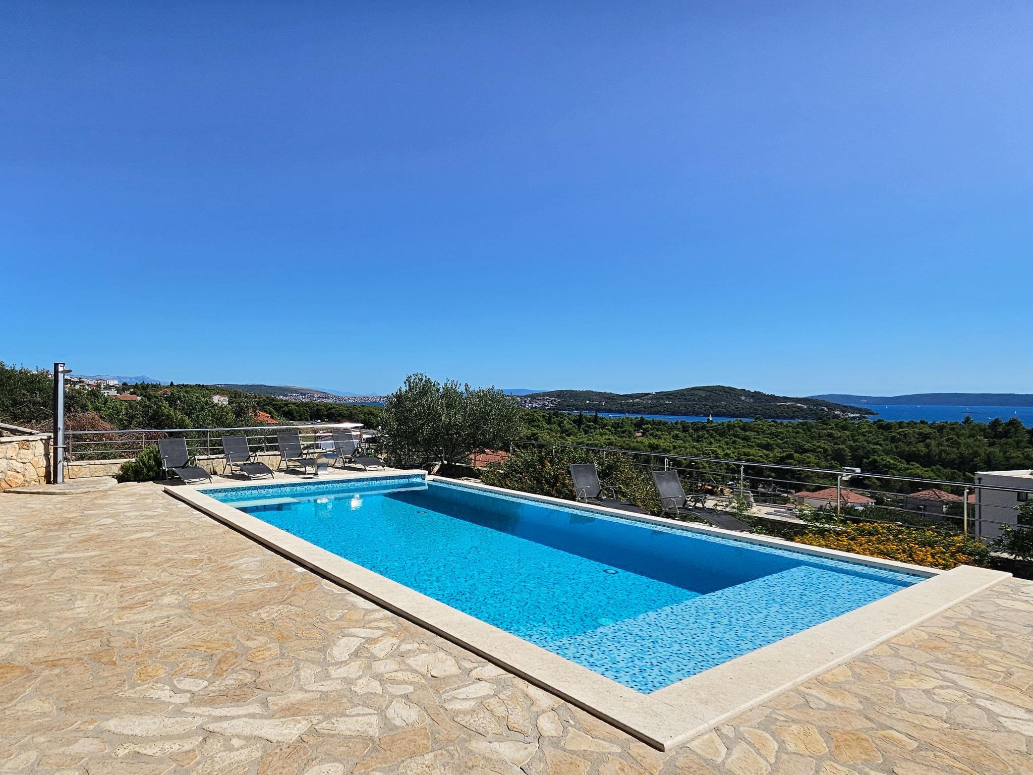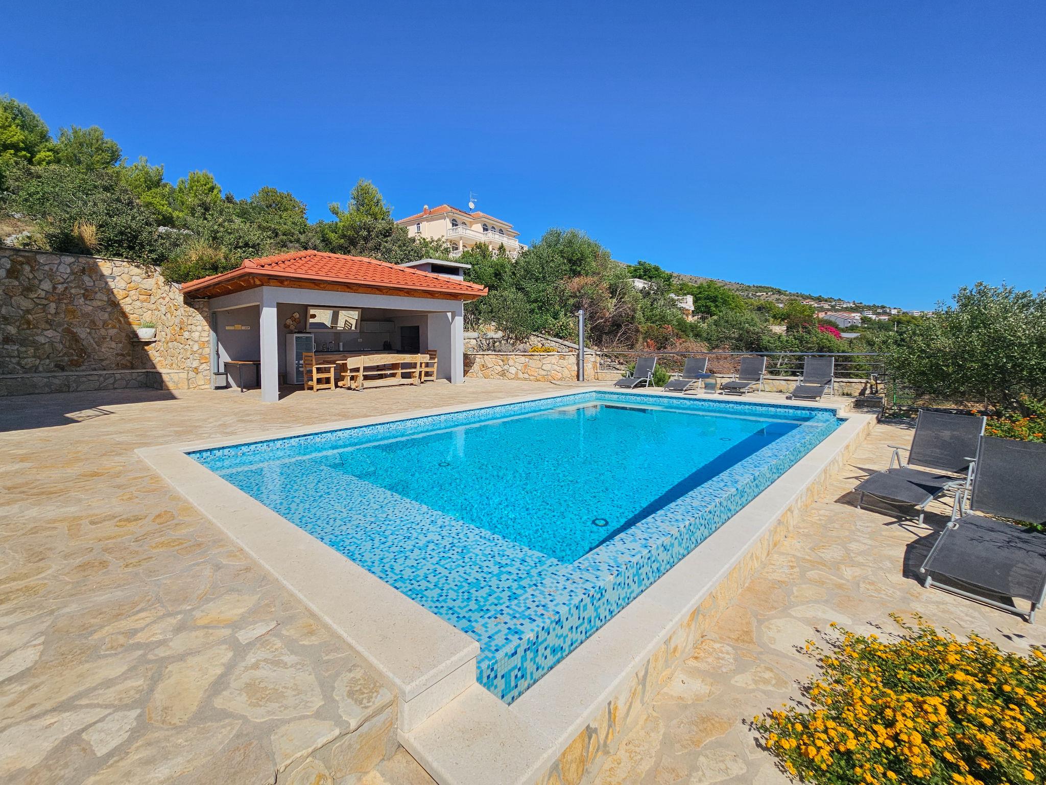 Seget Vranjica: Very beautiful villa "Maris", 3 storeys. 5.2 km from the centre of Trogir, in a quiet, sunny position on a slope, 1.1 km from the sea, 1.1 km from the beach, in a cul-de-sac. Private: property 400 m2 (fenced), swimming pool angular (32 m2, seasonal availability: 01.May. - 31.Oct.) with internal staircase. Outdoor shower, hot tub, pool house with fridge, barbecue, pool maintenance by the owner/gardener. In the house: internet access, fitness room, washing machine. 50 m long steep motor access to the house. Parking (for 4 cars) at the house on the premises. Shop 400 m, shopping centre 4.6 km, restaurant 1.1 km, bus stop 260 m, pebble beach 1.1 km. Please note: airfield 11 km from the property.