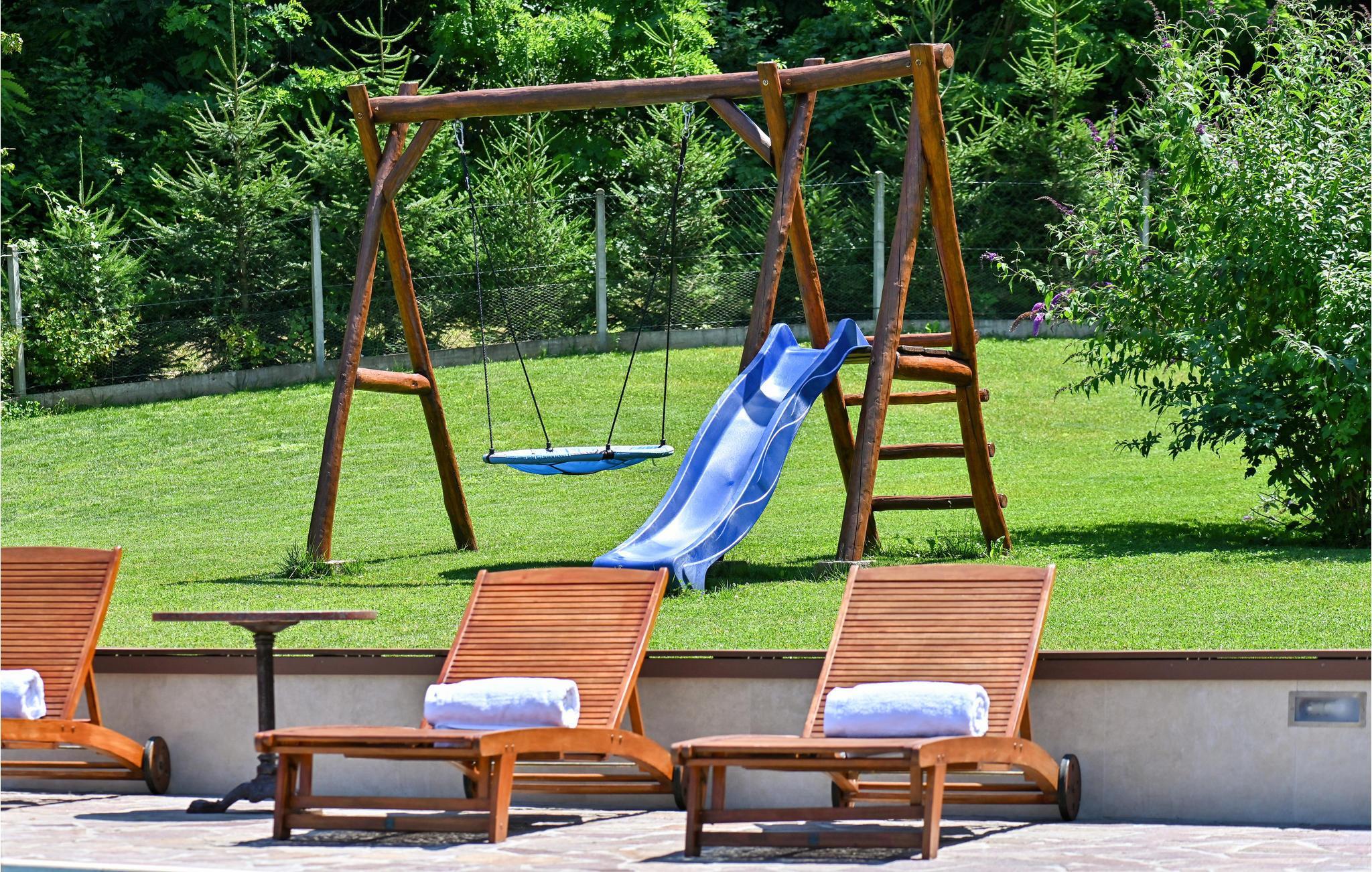 Detta vackra trähus i alpstil ligger vid foten av en kulle, omgivet av orörd grönska.