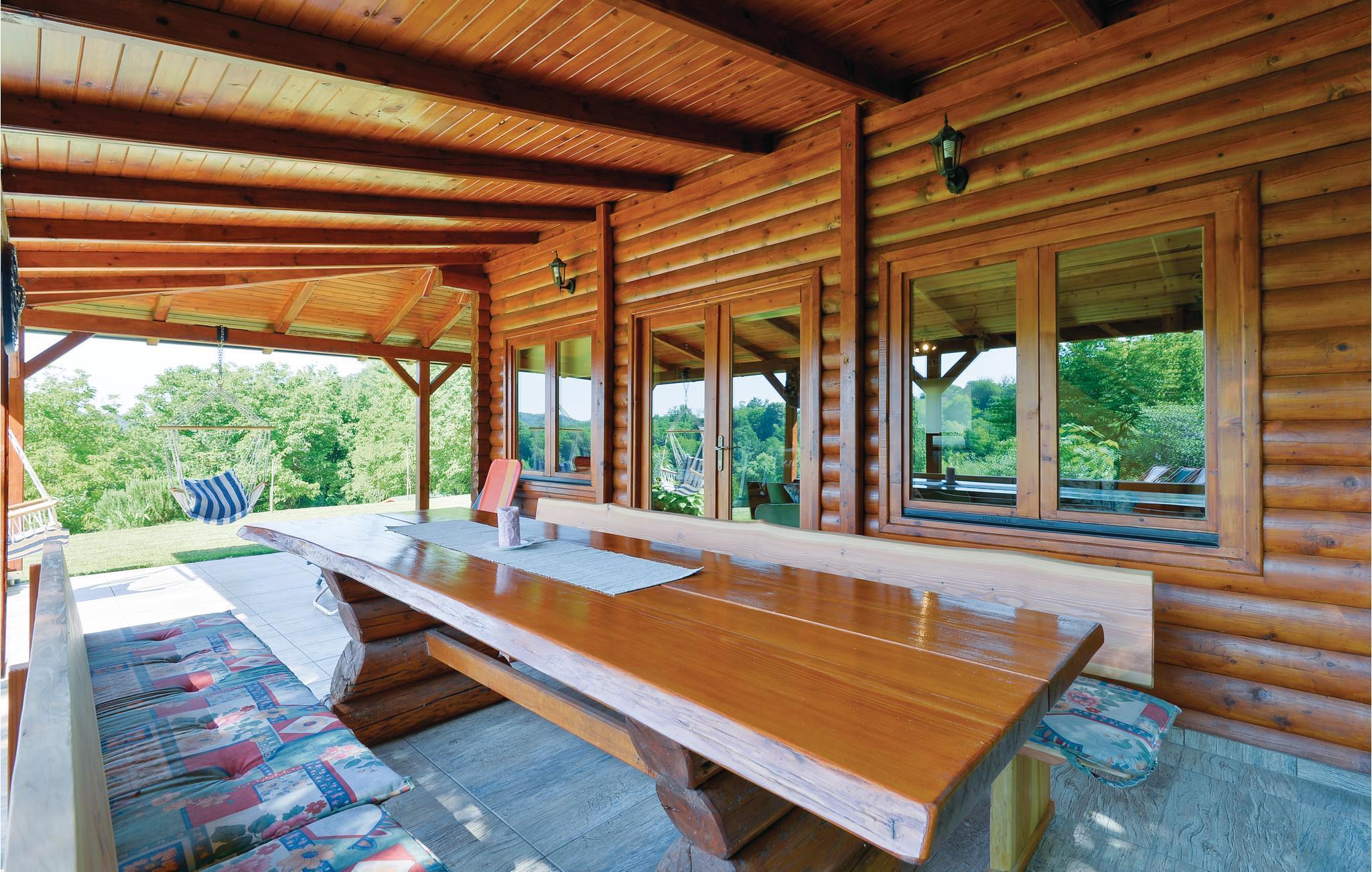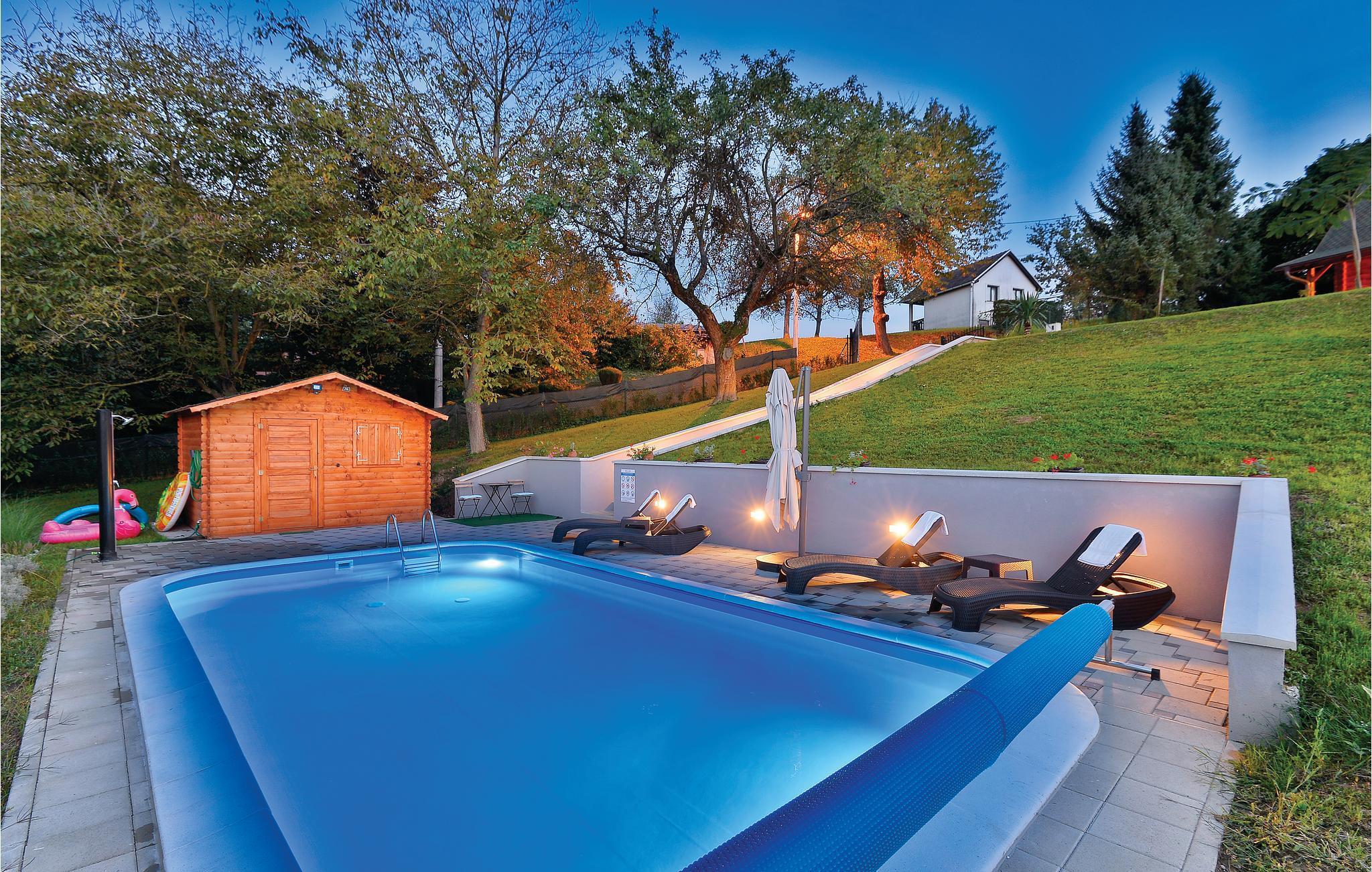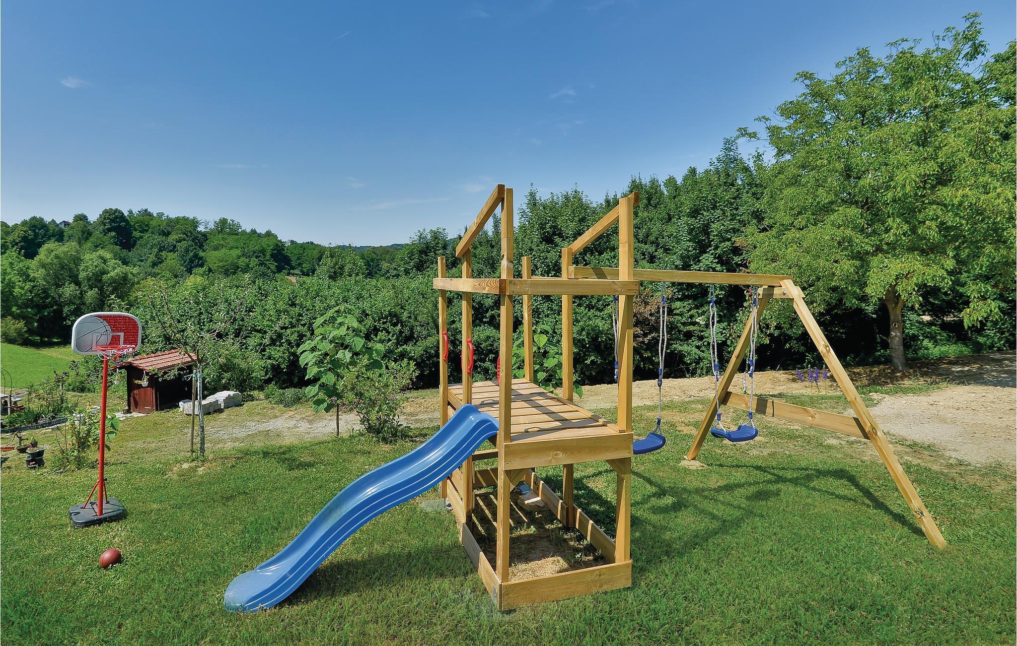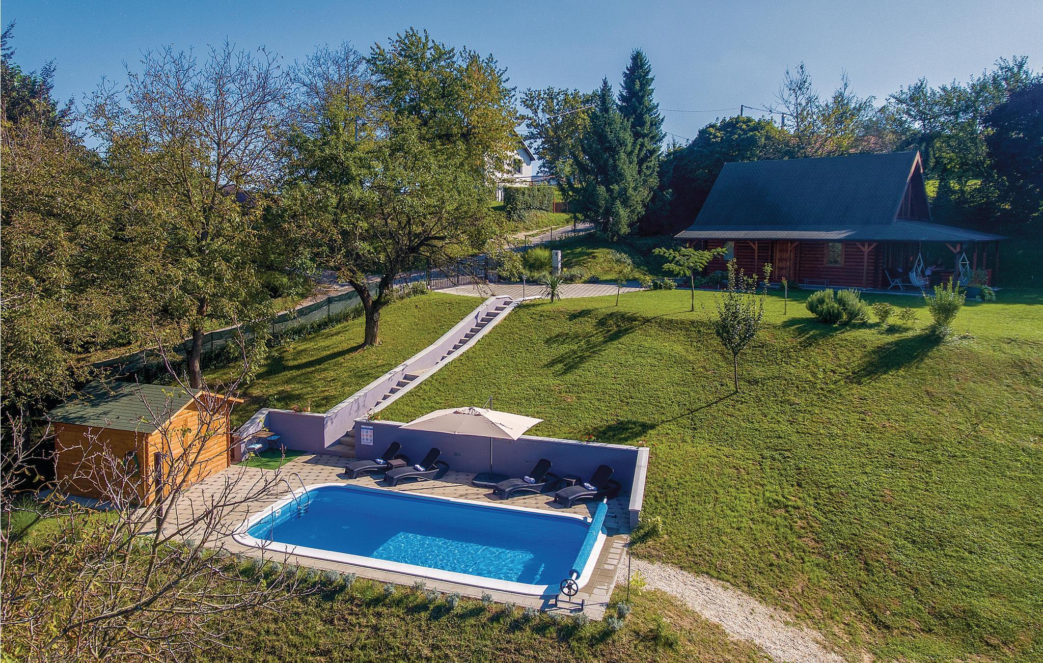 Strax utanför Varazdinske Toplice ligger detta omsorgsfullt inredda semesterhus i trä. På den stora fastigheten hittar du poolen, som har en vattengeysir och UV-vattenbehandling Du hittar massor av lekar för barnen och en terrass där du kan koppla av i skuggan. Husets interiör är vackert och modernt inredd och själva huset är utrustat med alla bekvämligheter som behövs för en bekymmersfri och avkopplande semester. Bottenvåningen består av ett vardagsrum med utsikt över terrassen, kök och matplats samt ett badrum. På första våningen, där den minsta takhöjden är ca 60 cm, finns två sovrum, ett galleri och ett badrum. Endast cirka en kilometer från huset ligger Varazdinske toplice, där du kan njuta av fördelarna med termiskt vatten, wellnessfaciliteter, idrottsanläggningar och promenader i naturen. Under din vistelse rekommenderar vi ett besök i den vackra staden Varazdin, vars monumentala och konstnärliga arv med sin frodiga barockarkitektur samt harmonin på dess torg och unika romantiska gränder kommer att glädja dig. Missa inte ett besök på Änglamuseet.