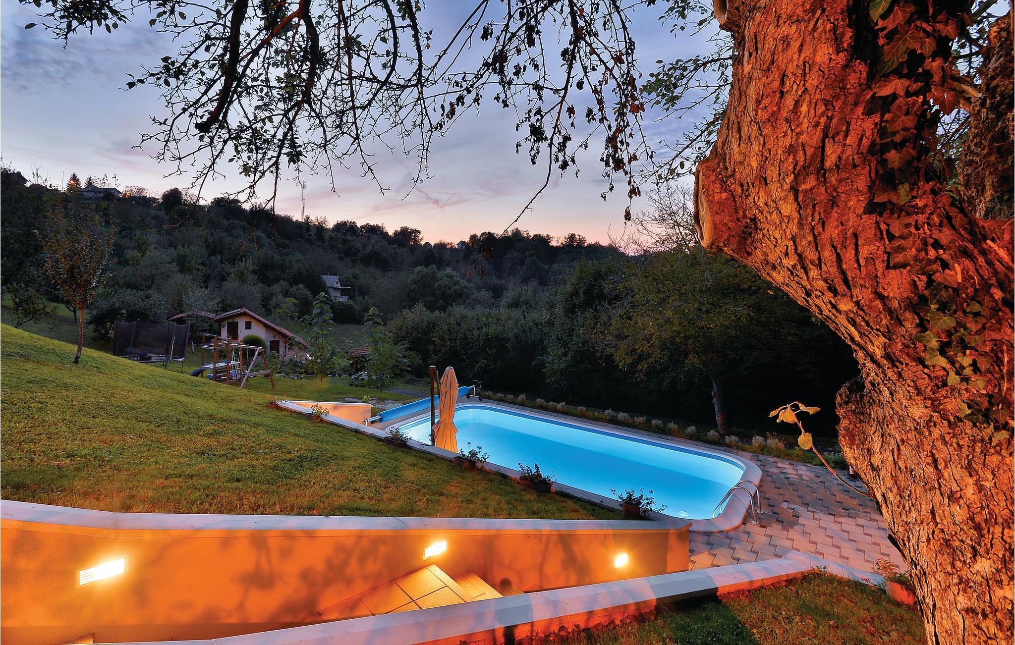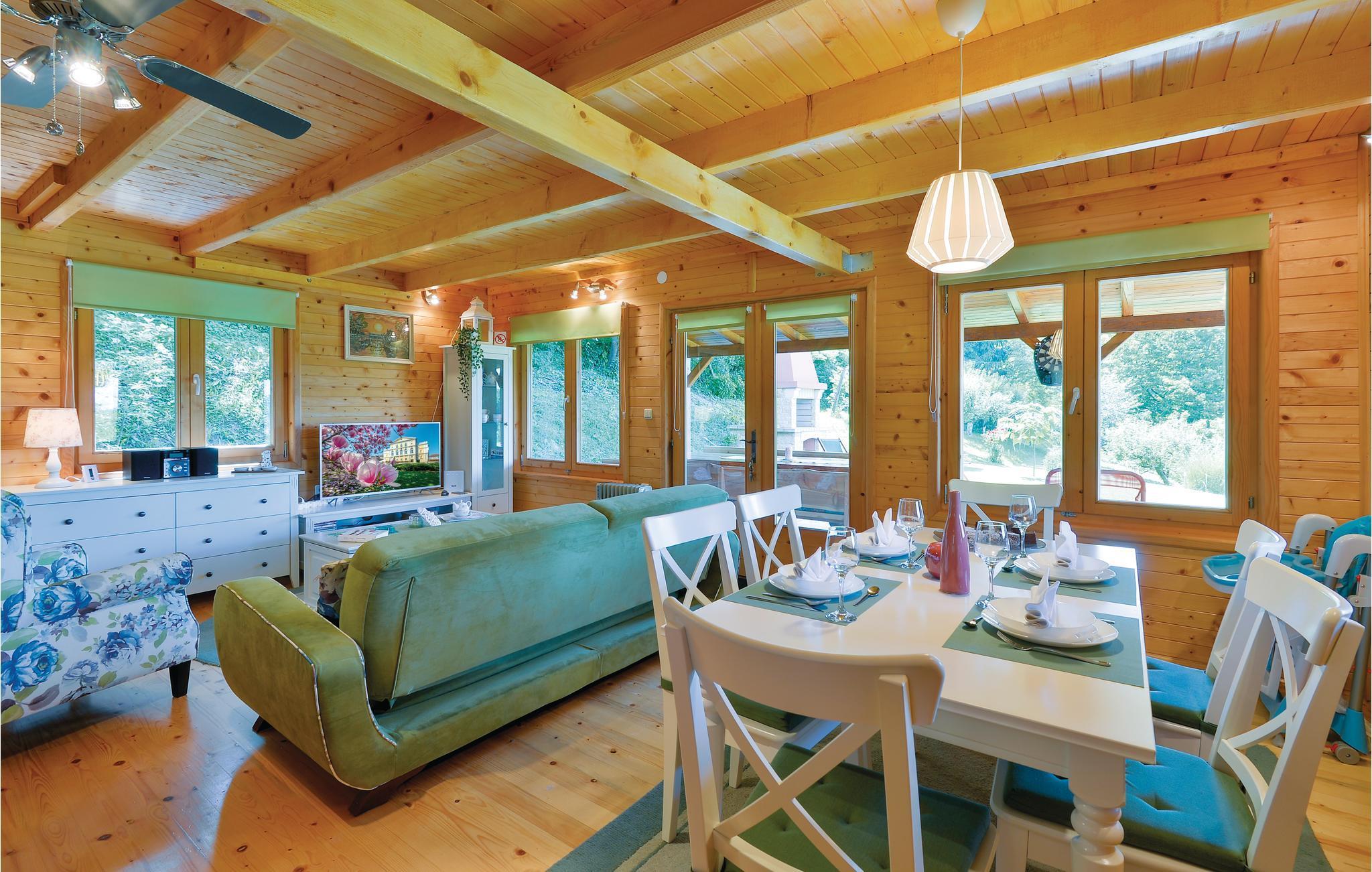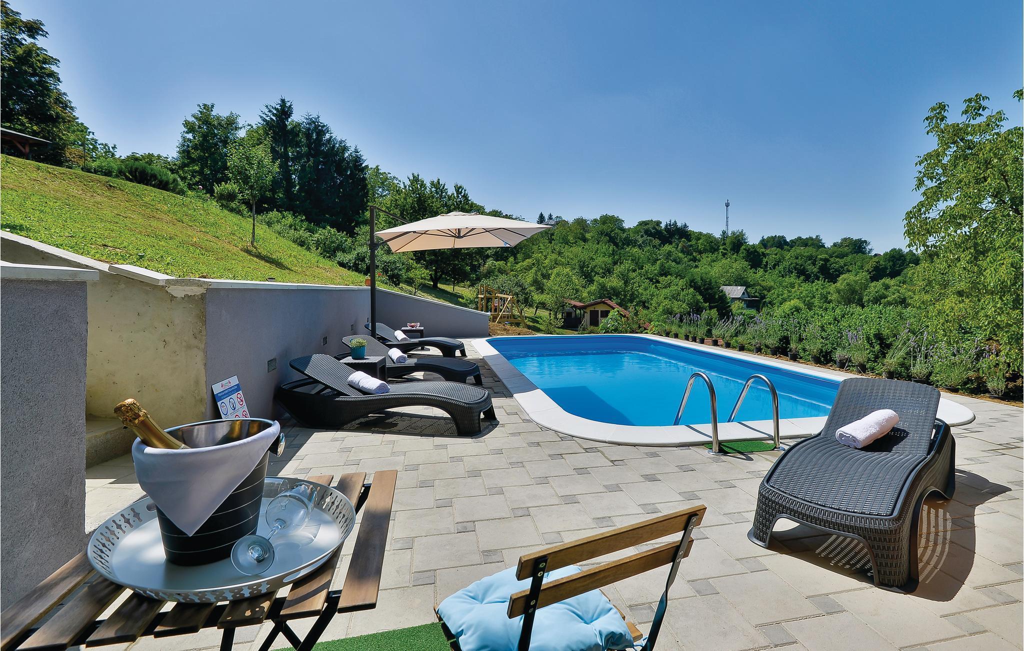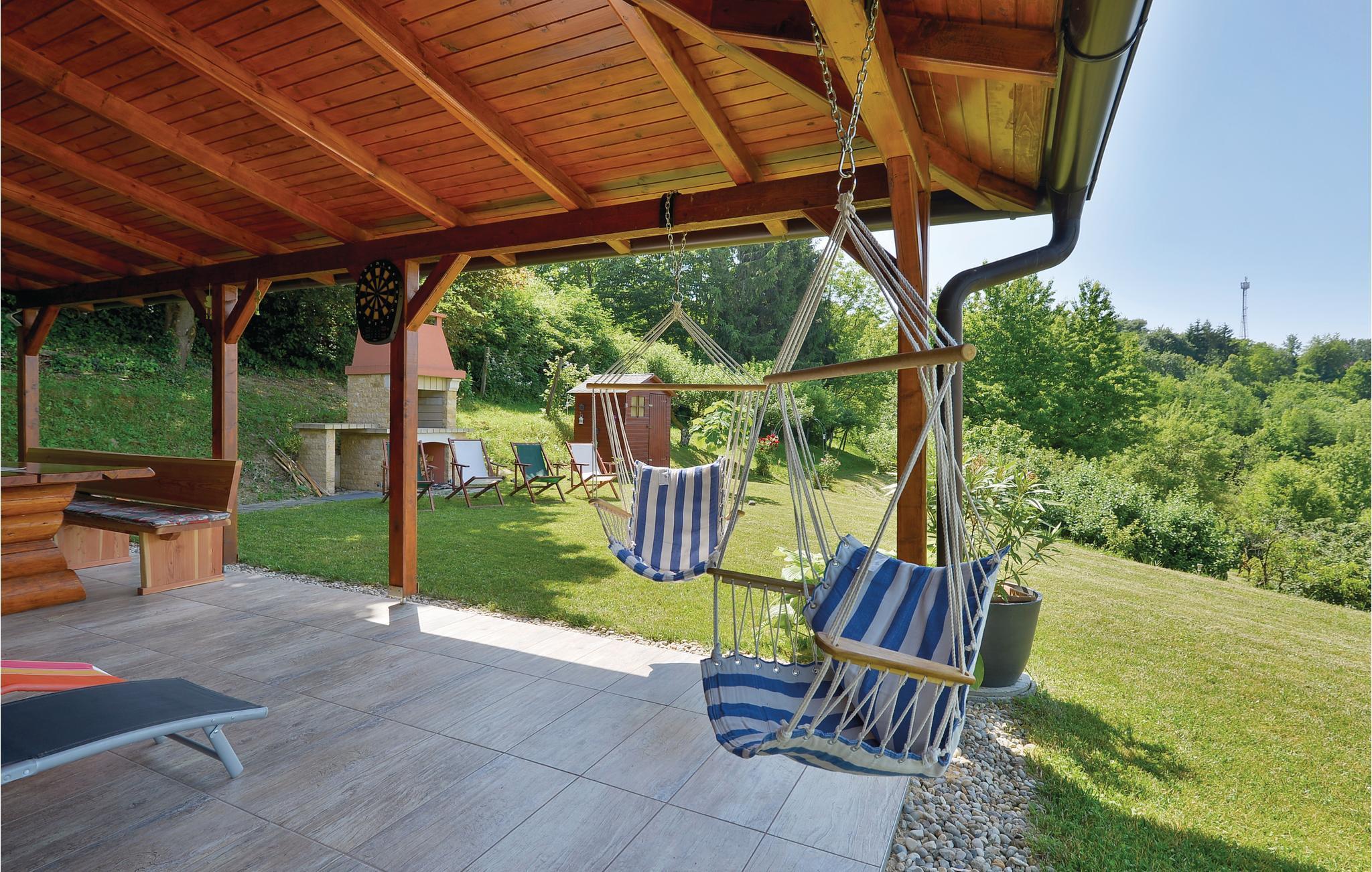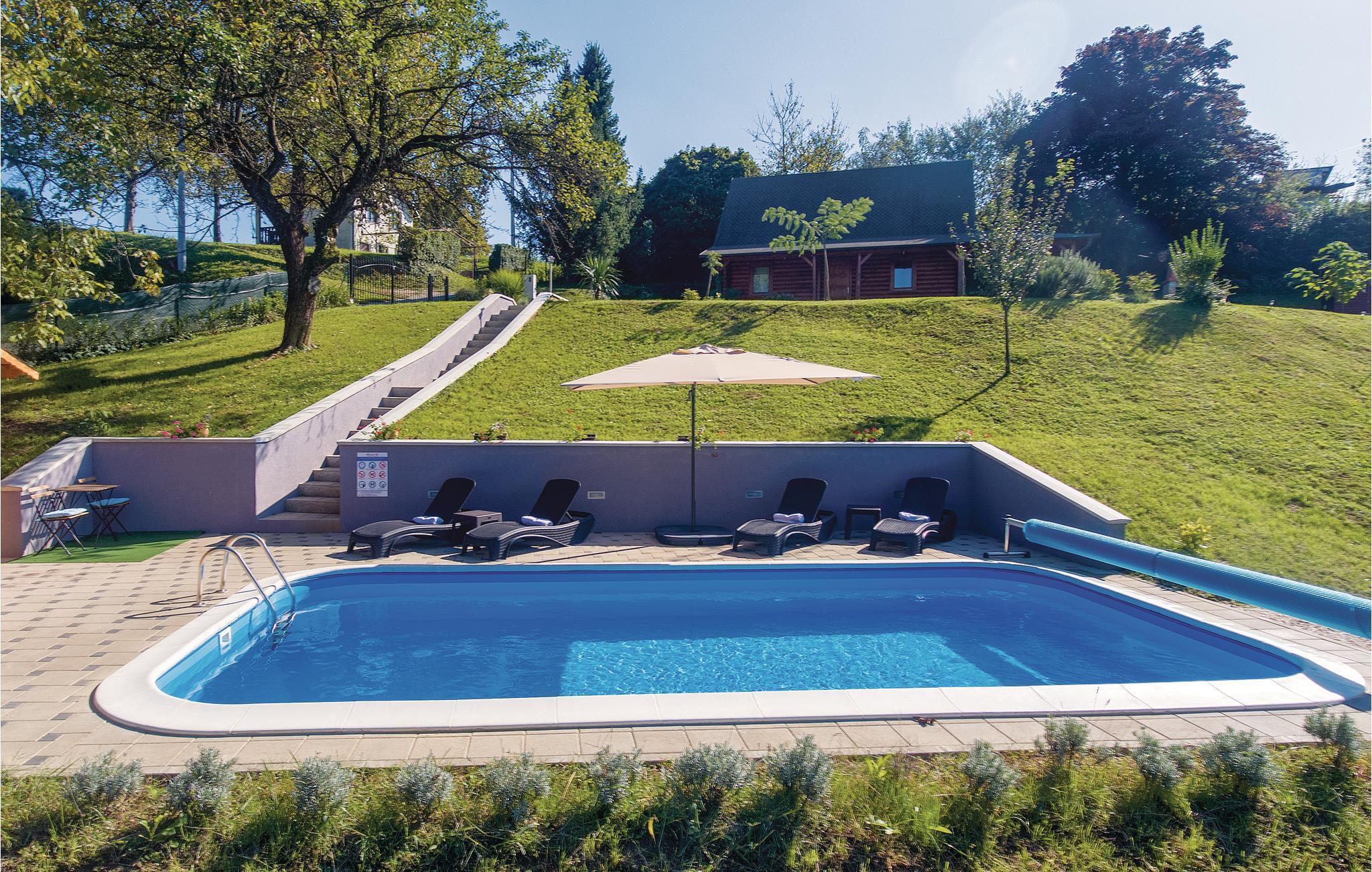 Strax utanför Varazdinske Toplice ligger detta omsorgsfullt inredda semesterhus i trä. På den stora fastigheten hittar du poolen, som har en vattengeysir och UV-vattenbehandling Du hittar massor av lekar för barnen och en terrass där du kan koppla av i skuggan. Husets interiör är vackert och modernt inredd och själva huset är utrustat med alla bekvämligheter som behövs för en bekymmersfri och avkopplande semester. Bottenvåningen består av ett vardagsrum med utsikt över terrassen, kök och matplats samt ett badrum. På första våningen, där den minsta takhöjden är ca 60 cm, finns två sovrum, ett galleri och ett badrum. Endast cirka en kilometer från huset ligger Varazdinske toplice, där du kan njuta av fördelarna med termiskt vatten, wellnessfaciliteter, idrottsanläggningar och promenader i naturen. Under din vistelse rekommenderar vi ett besök i den vackra staden Varazdin, vars monumentala och konstnärliga arv med sin frodiga barockarkitektur samt harmonin på dess torg och unika romantiska gränder kommer att glädja dig. Missa inte ett besök på Änglamuseet.