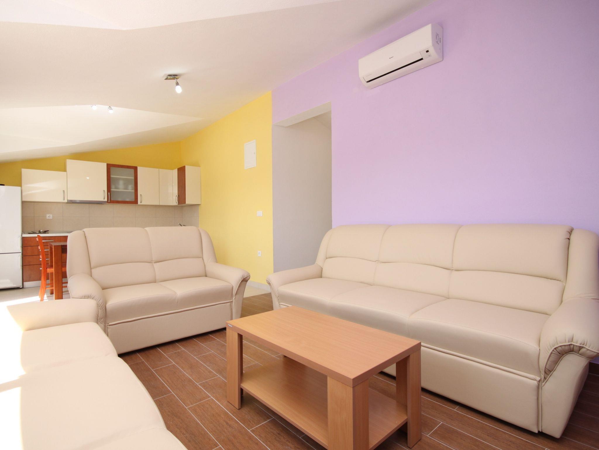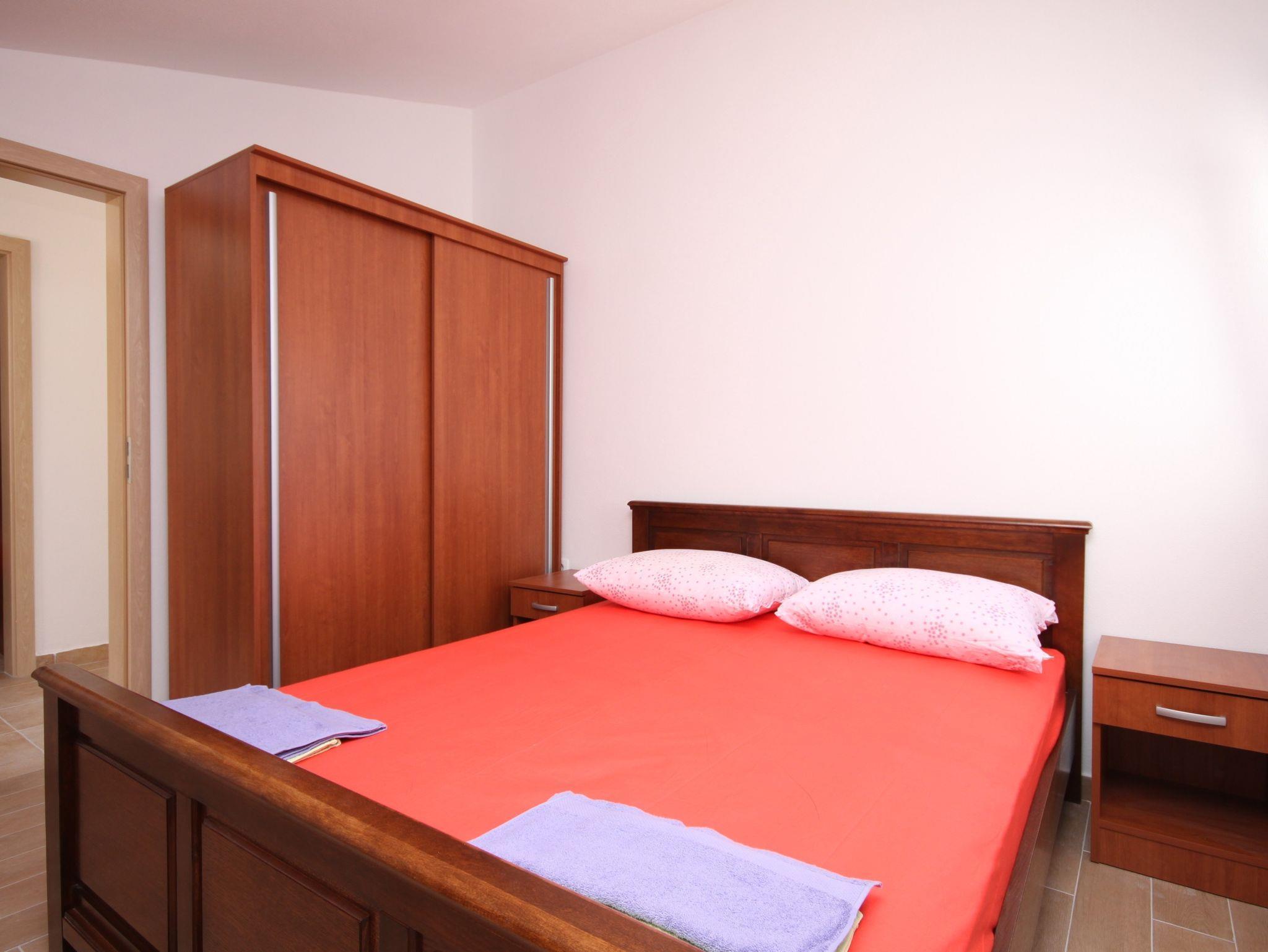 Ferienwohnung bietet Platz für 6 Gäste. Die Betten sind in Schlafzimmern, die es 2 gibt, und in Wohnzimmer, innerhalb einer Gesamtfläche von 59m2, angeordnet. Die Gäste haben eine eigene Terrasse zur Verfügung, auf der sie in warmen Sommernächten genießen können. Das Apartment bietet Meerblick. Es ist erlaubt, Speisen auf dem Gemeinschafts-Grill vorzubereiten. In der Unterkunftseinheit besteht die Möglichkeit des Mitbringens von Haustieren gegen Aufpreis. IM PREIS INBEGRIFFEN: Kurtaxe, Endreinigung, Klimatisierung, Parkplatz, Internet, Bügeleisen, Föhn. VERBINDLICHE ZUSÄTZLICHE KOSTEN: Aufzahlung für Kurzaufenthalte (prozentualer Zuschlag pro Nächtigungsanzahl: 30% - 1, 20% - 2, 10% - 3). UNVERBINDLICHE ZUSÄTZLICHE KOSTEN: Wäschewaschen (5,00 € Waschen), Bootsanlegeplatz (5,00 € pro Nacht), Haustiere (7,00 € pro Nacht), Zusatzbett (10,00 € pro Nacht). Die Verfügbarkeit zusätzlicher Dienstleistungen in Ihrem reservierten Termin und die Preise derselben (falls nicht aufgeführt) müssen im Voraus überprüft werden. Zusätzliche Dienstleistungen die in der Zahlungsaufforderung nicht aufgeführt sind werden direkt beim Vermieter bezahlt, angenommen der Gast nutzt auch diese.