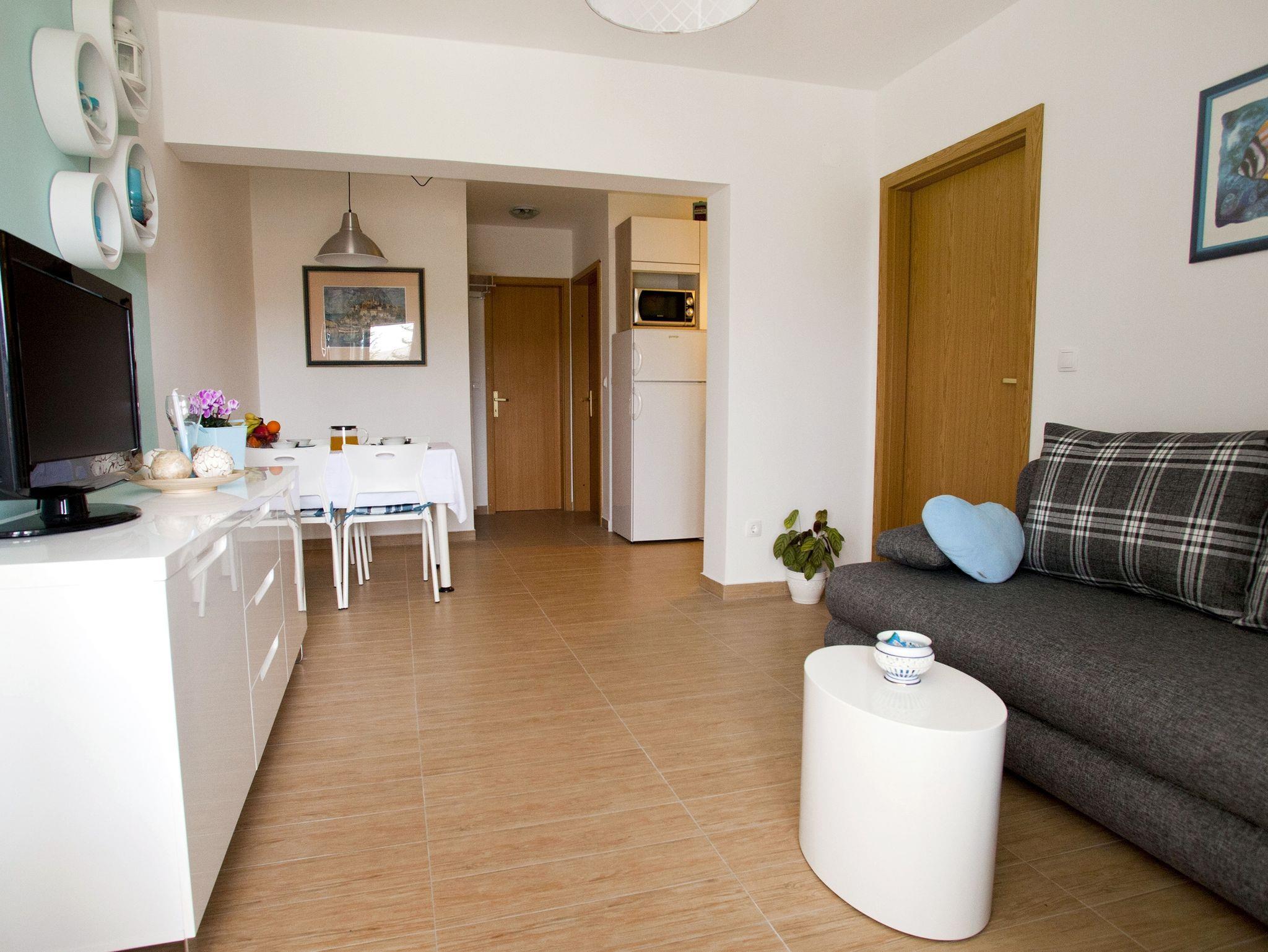 Ferienwohnung bietet Platz für 6 Gäste. Die Betten sind in Schlafzimmern, die es 2 gibt, und in Wohnzimmer, innerhalb einer Gesamtfläche von 46m2, angeordnet. Die Gäste haben eine eigene Terrasse zur Verfügung, auf der sie in warmen Sommernächten genießen können. Das Apartment bietet Meerblick. Für vollen Genuss und Entspannung gibt es einen privaten Grill für Gäste dieser Unterkunft. IM PREIS INBEGRIFFEN: Kurtaxe, Endreinigung, Klimatisierung, Parkplatz, Internet, Bügeleisen, Bügelbrett, Föhn. VERBINDLICHE ZUSÄTZLICHE KOSTEN: Aufzahlung für Kurzaufenthalte (prozentualer Zuschlag pro Nächtigungsanzahl: 30% - 1, 20% - 2, 10% - 3). UNVERBINDLICHE ZUSÄTZLICHE KOSTEN: Wäschewaschen (7,00 € Waschen). Die Verfügbarkeit zusätzlicher Dienstleistungen in Ihrem reservierten Termin und die Preise derselben (falls nicht aufgeführt) müssen im Voraus überprüft werden. Zusätzliche Dienstleistungen die in der Zahlungsaufforderung nicht aufgeführt sind werden direkt beim Vermieter bezahlt, angenommen der Gast nutzt auch diese.