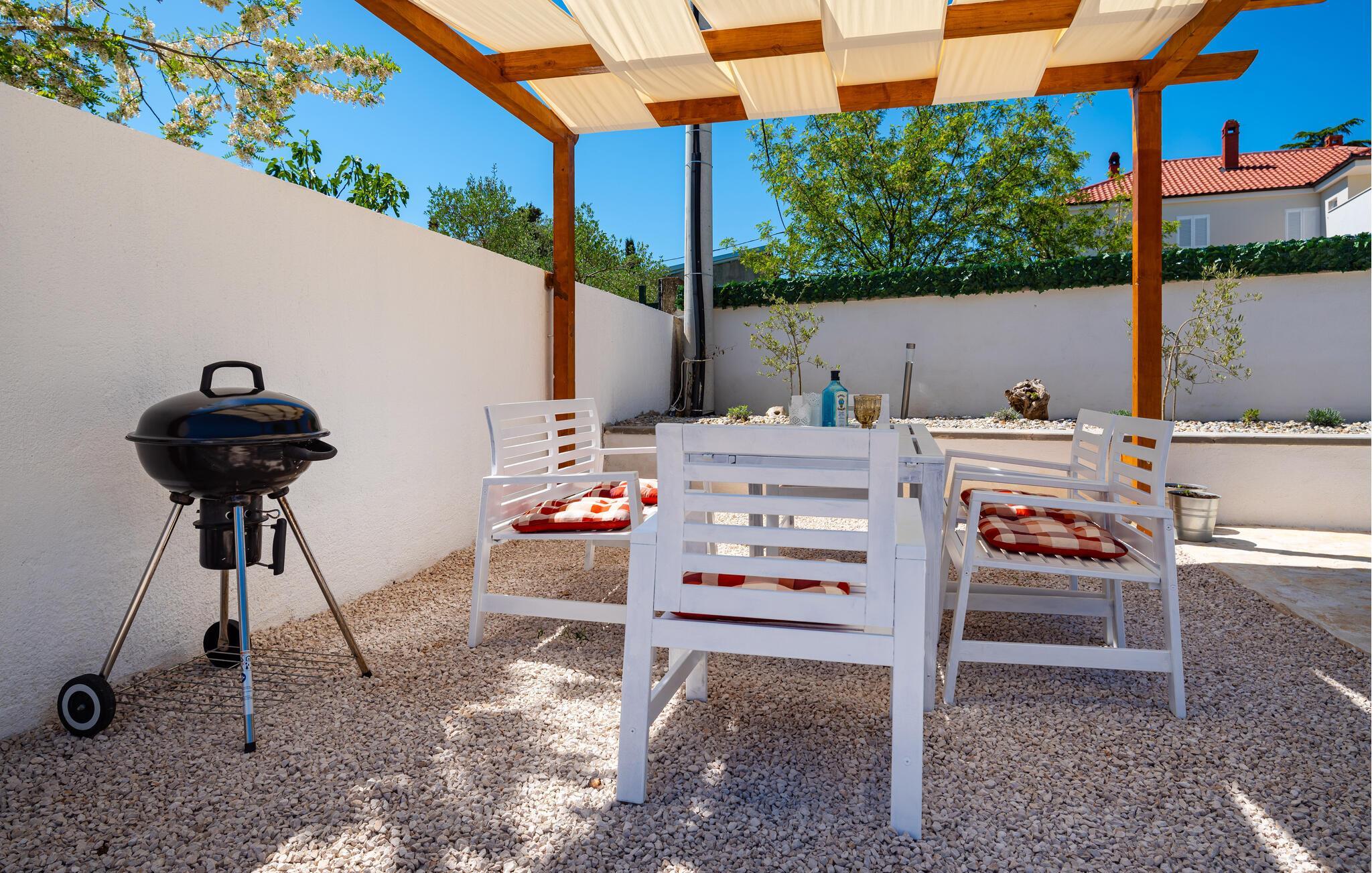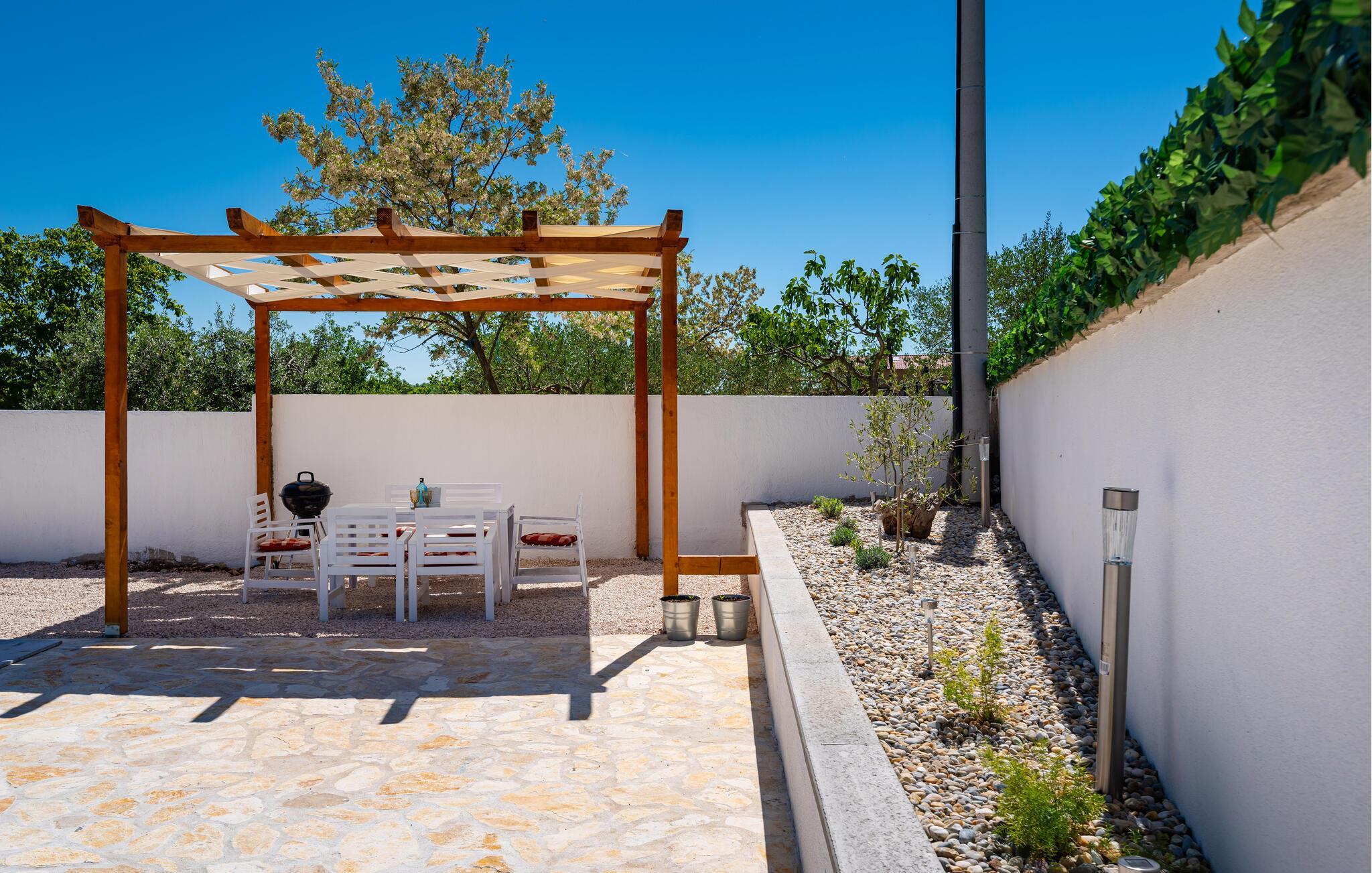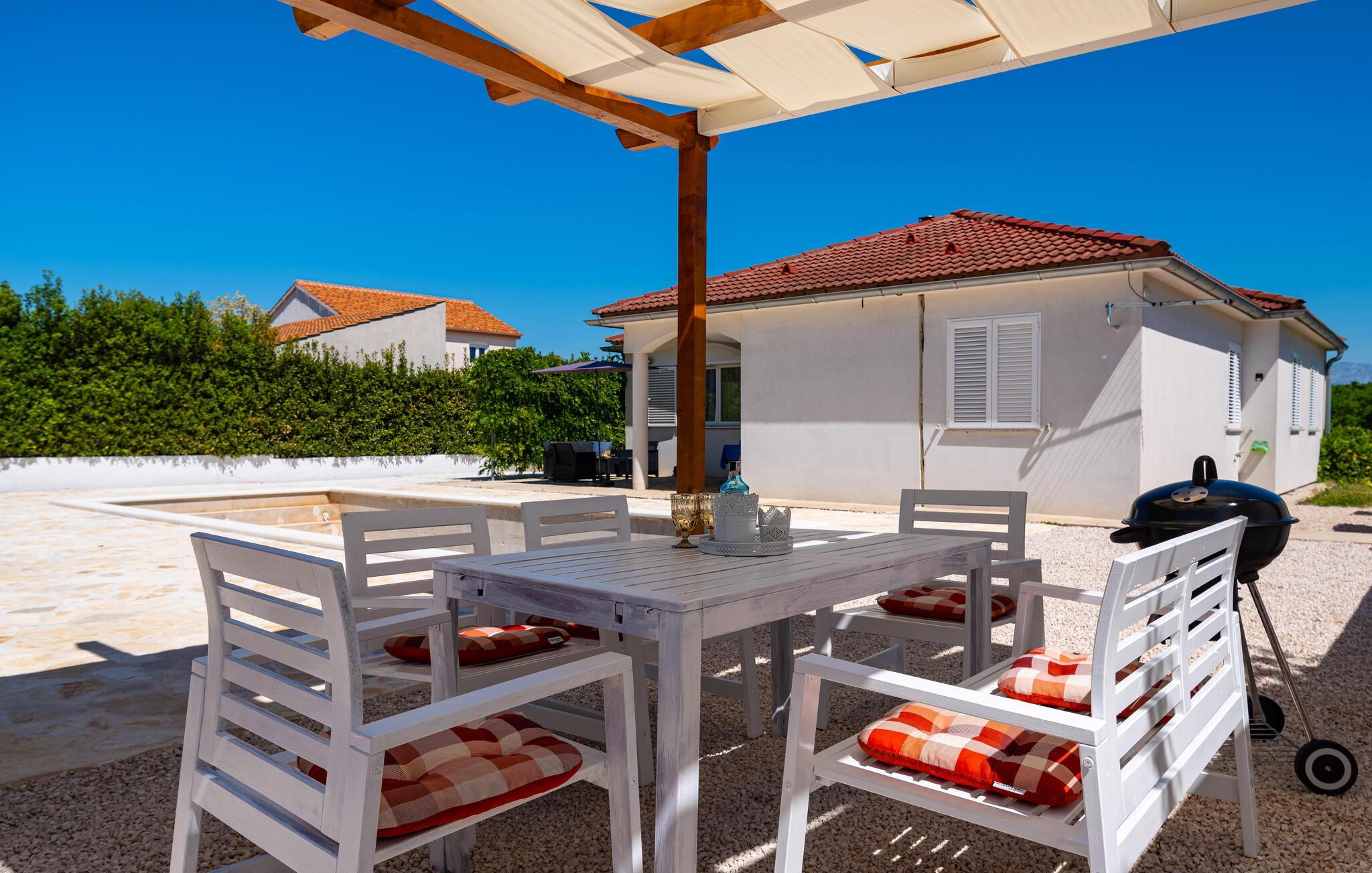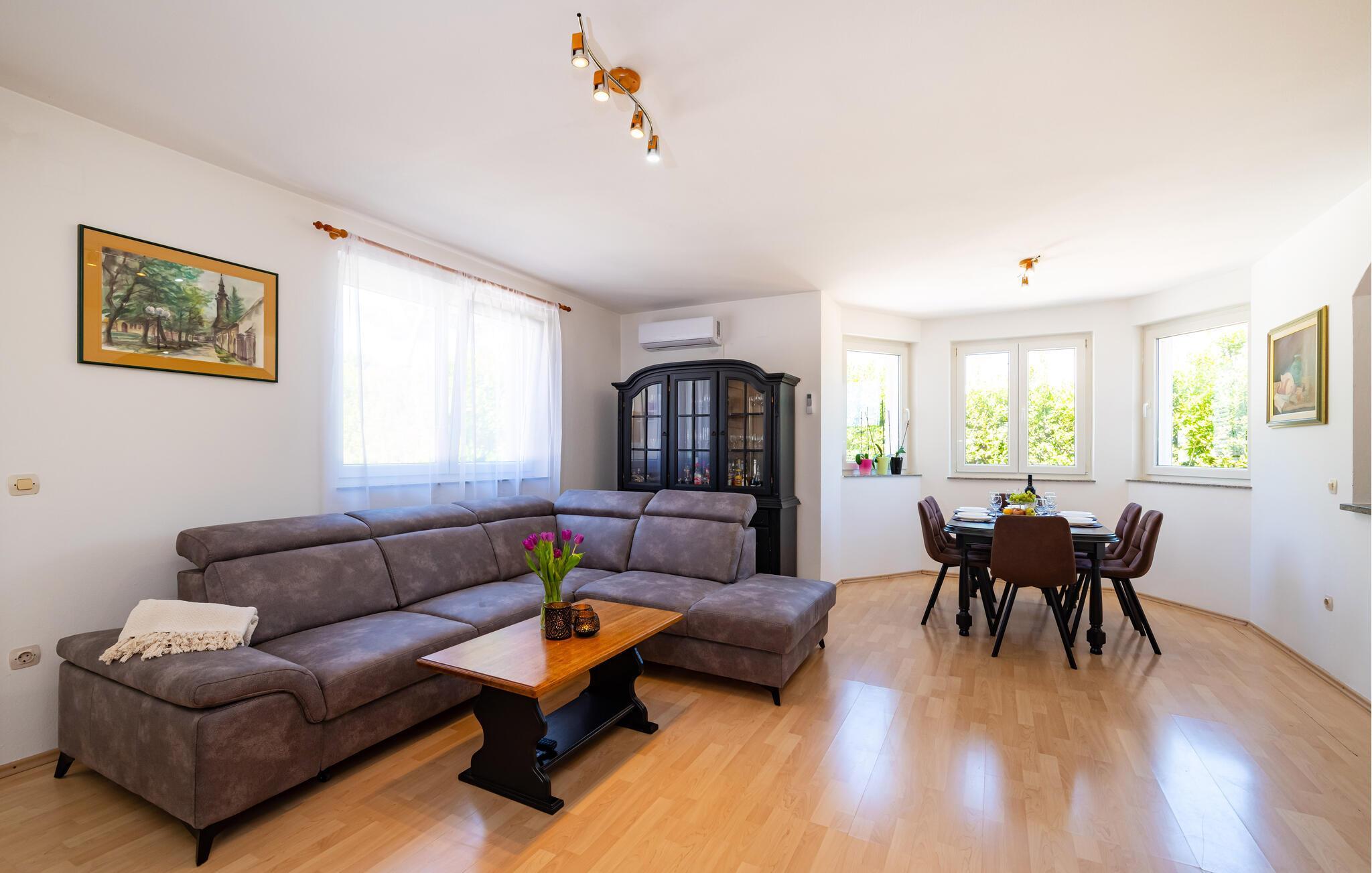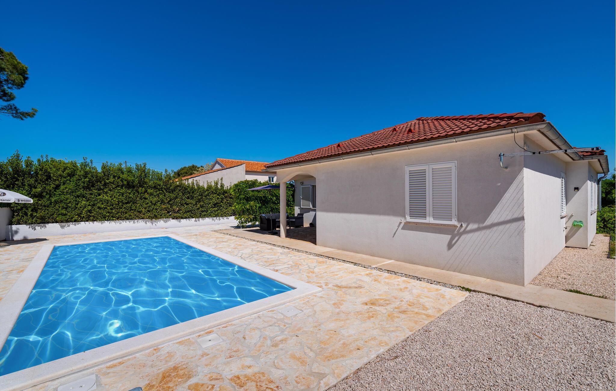 Mitt i den fridfulla Brisevo-landsbygden väntar detta eleganta semesterhus med ett rymligt utomhusområde och en underbar pool. Den moderna interiören kombinerar rena linjer med varma accenter och skapar en mysig atmosfär. Köket i öppen planlösning är fullt utrustat och inbjuder till mysiga kvällar med dina nära och kära. I vardagsrummet kan du njuta av komfort och elegans, medan sovrummen lovar dig vilsamma nätter. Den stora täckta terrassen med utsikt över poolen är särskilt inbjudande och den perfekta platsen att koppla av i slutet av dagen.