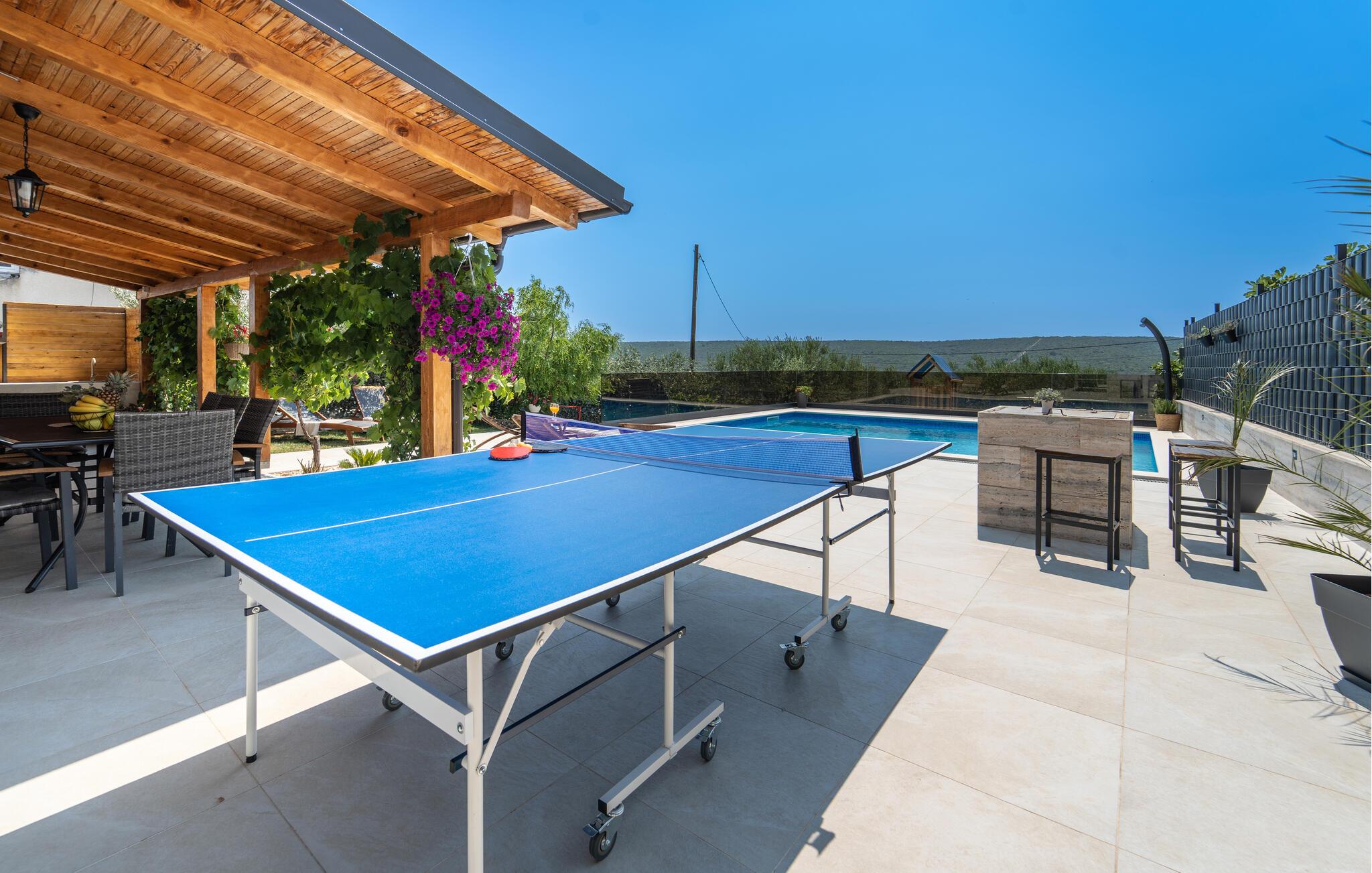 Den rymliga verandan utökar ditt utomhusliv och inbjuder dig att njuta av dina måltider under taket. Här kan du också läsa en bok medan dina barn simmar och leker i poolen eller sola vid poolkanten med utsikt över det omgivande landskapet.