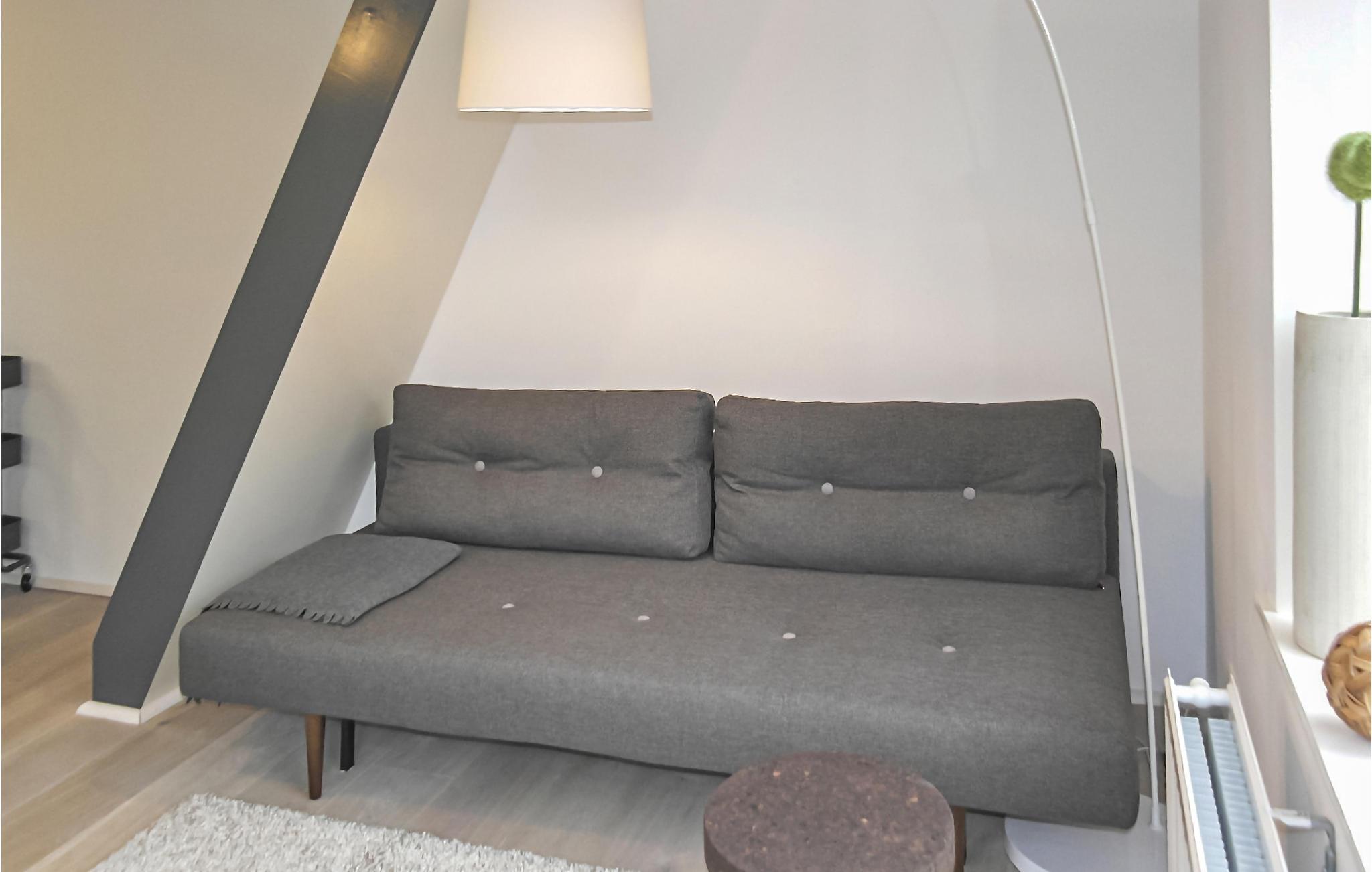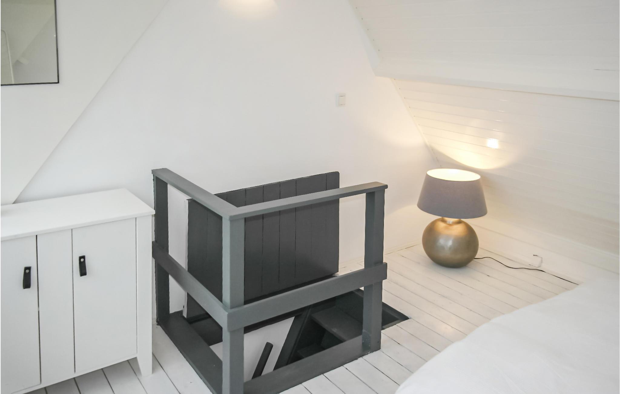 Du har ett trevligt vardagsrum med mycket ljus, matbord med två stolar, tv och ett attraktivt designkylskåp. På bottenvåningen finns det mysiga och välutrustade köket. Perfekt för att laga något i bekvämlighet. Badrummet har en modern regndusch som lovar en uppfriskande start på dagen. Du når övervåningen via en brant trappa (var försiktig). Det ljusa sovrummet har en dubbelsäng med två separata madrasser och täcken och är mycket mysigt med sitt spetsiga tak.
