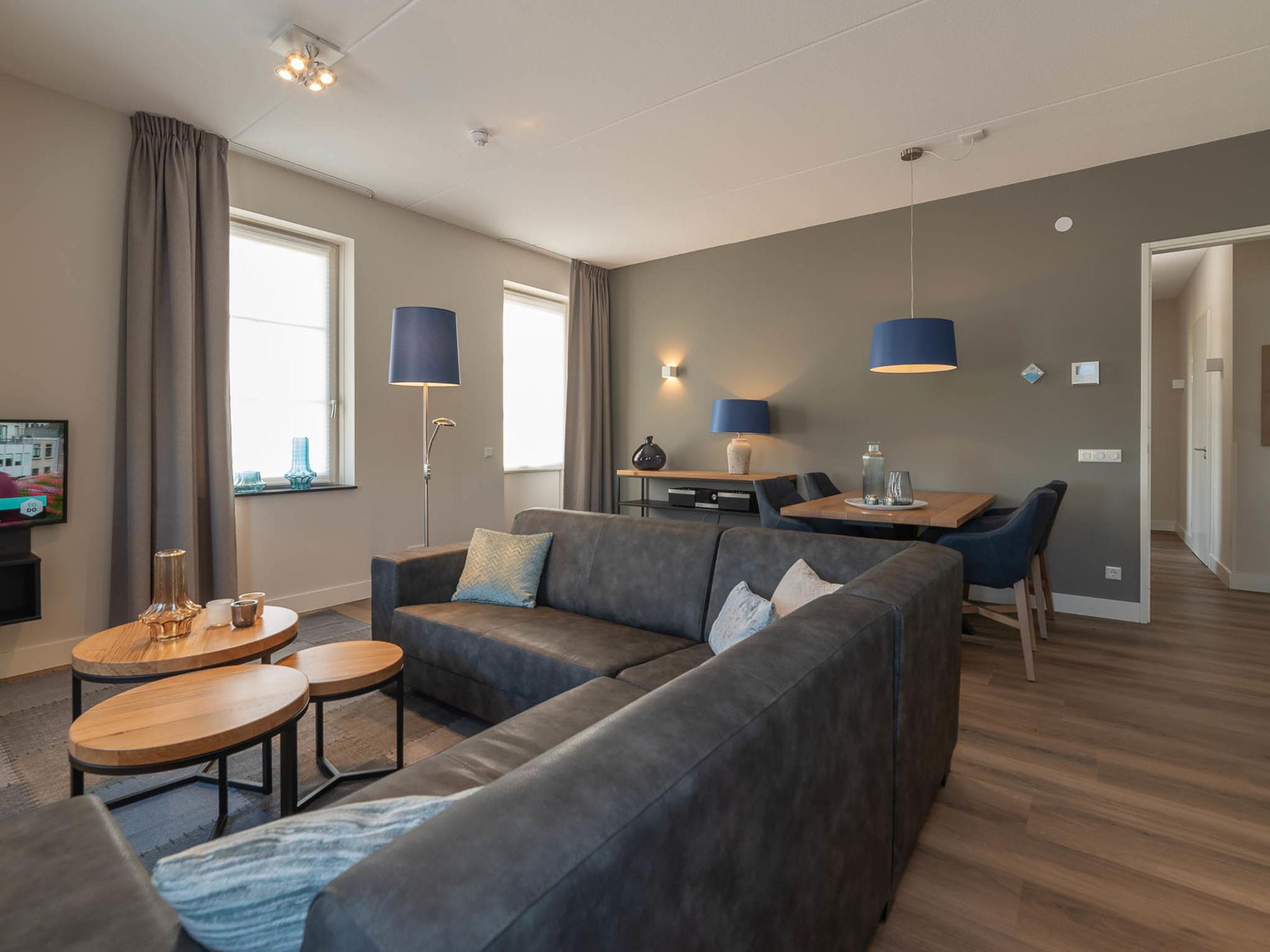 "Raadhuis", 3-room apartment 66 m2. Comfortable furnishings: entrance hall with separate WC. Open living/dining room with dining table and flat screen. Exit to the balcony. 2 double bedrooms, each room with 2 beds (90 cm, length 210 cm), TV (flat screen). Open kitchen (oven, dishwasher, 4 induction hot plates, kettle, microwave, electric coffee machine, Capsules for coffee machine (Nespresso-not incl.)). Shower/WC, hydro massage bath, Sauna. Underfloor heating. Balcony. Balcony furniture, box-room. Facilities: hair dryer. Internet (WiFi, free). Parking (2 cars). Please note: non-smoking house. Smoke alarm. The apartments have underfloor heating. Pet on request.