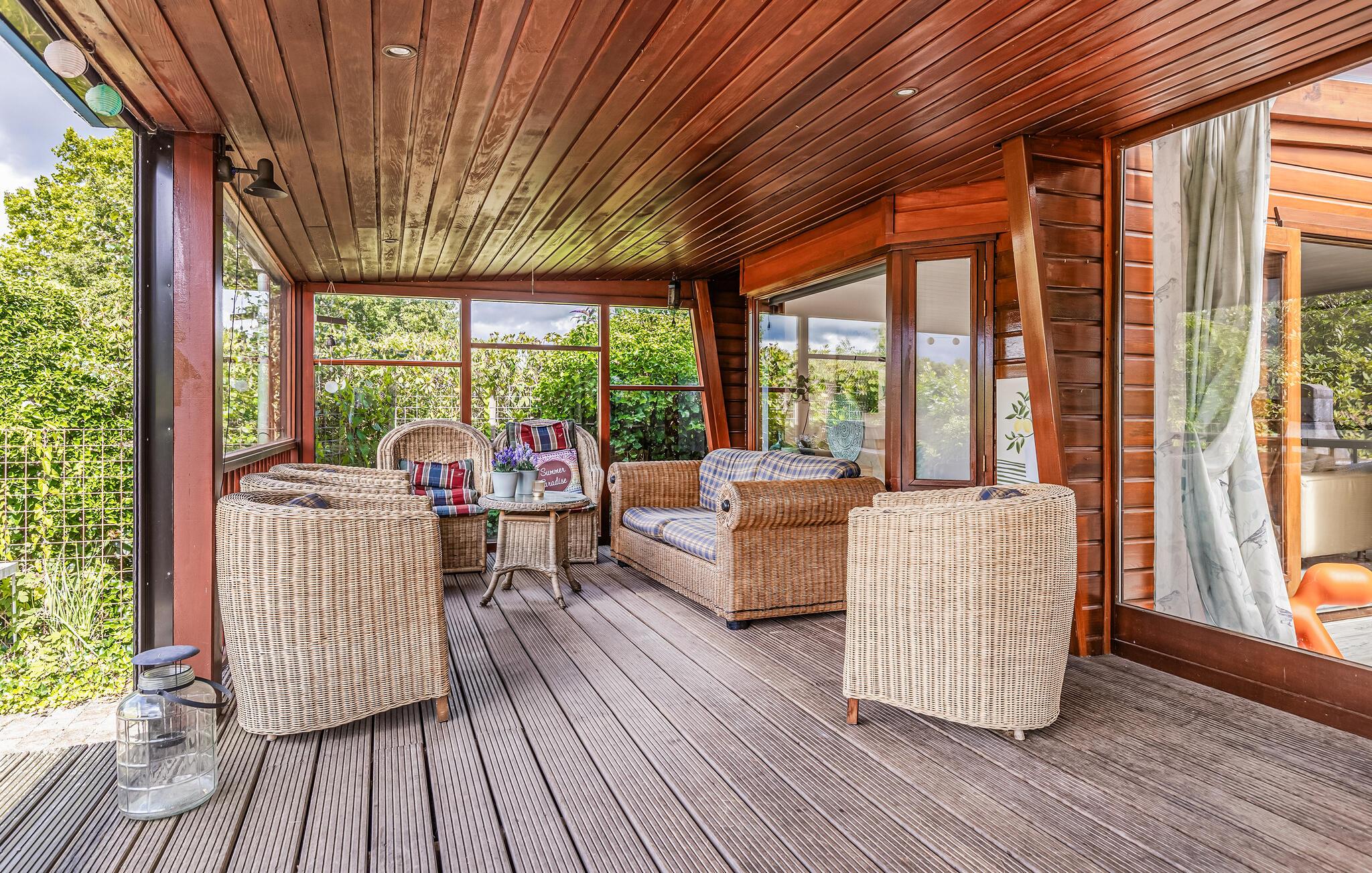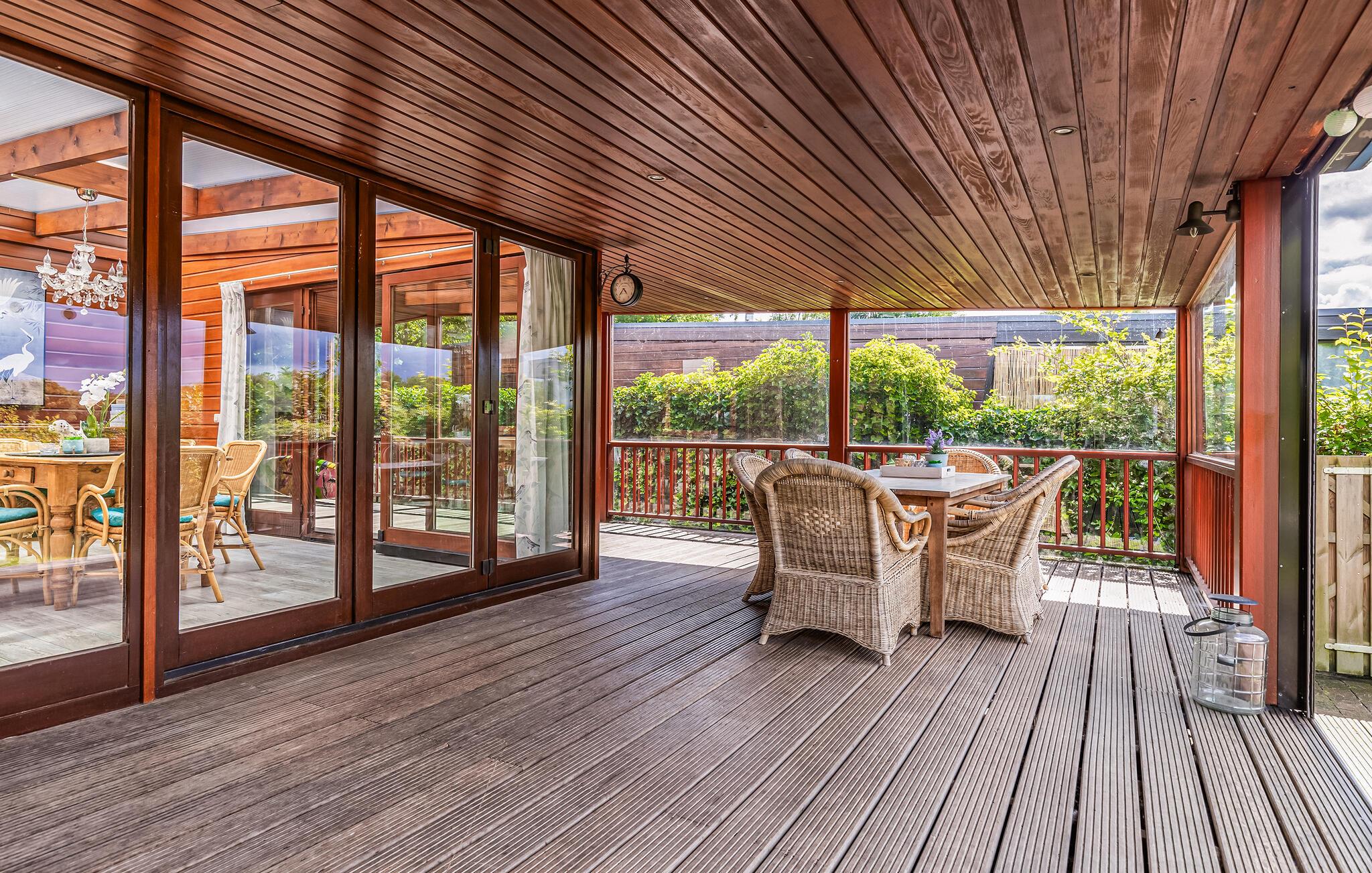 Huset har en stor täckt terrass där du kan göra dig bekväm både på sommaren och vintern. Börja dagen med en frukost utomhus eller använd grillen för mysiga kvällar. Trädgården har anlagts med kärlek och erbjuder gott om avskildhet tack vare häckar och träd.