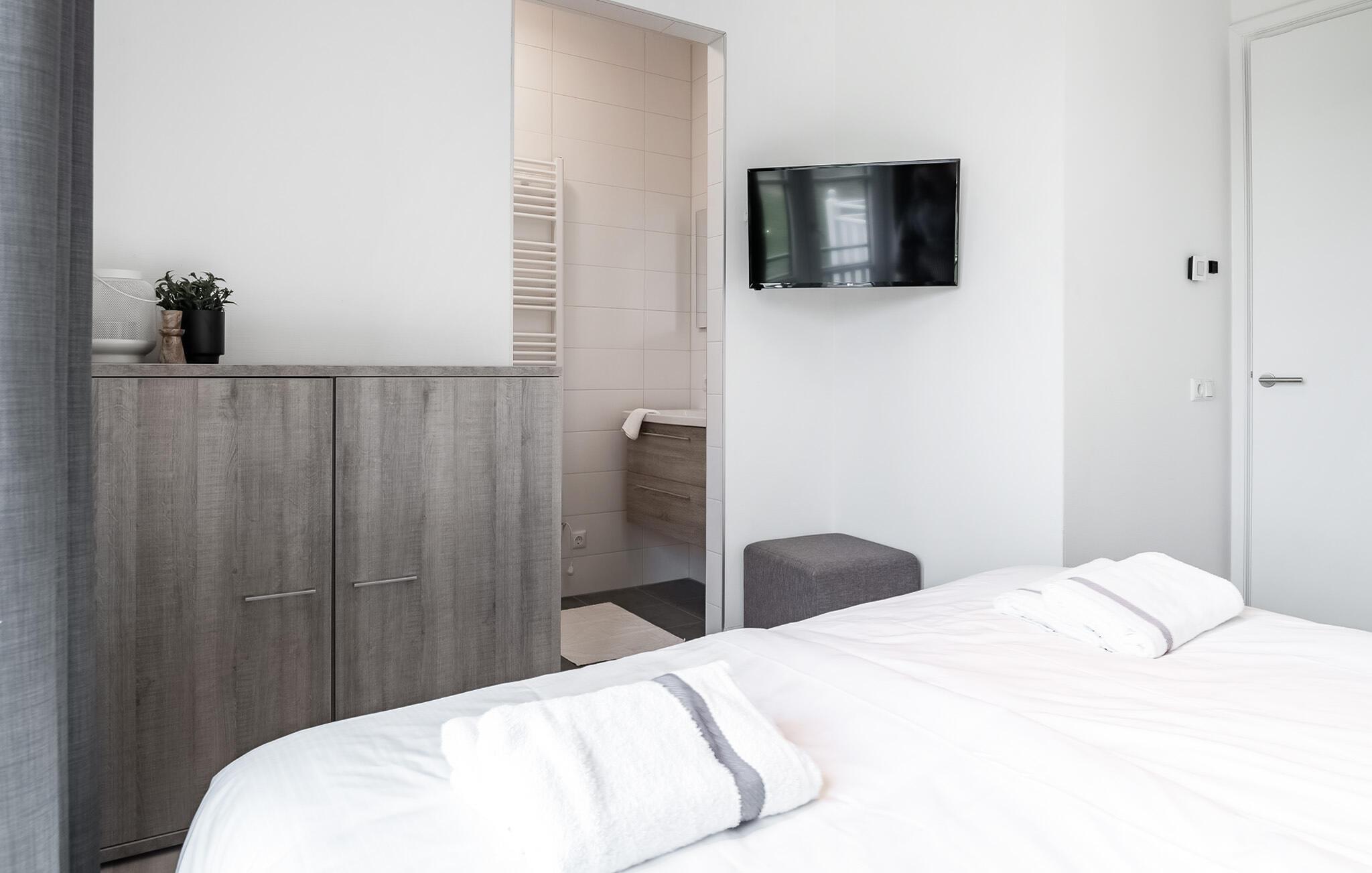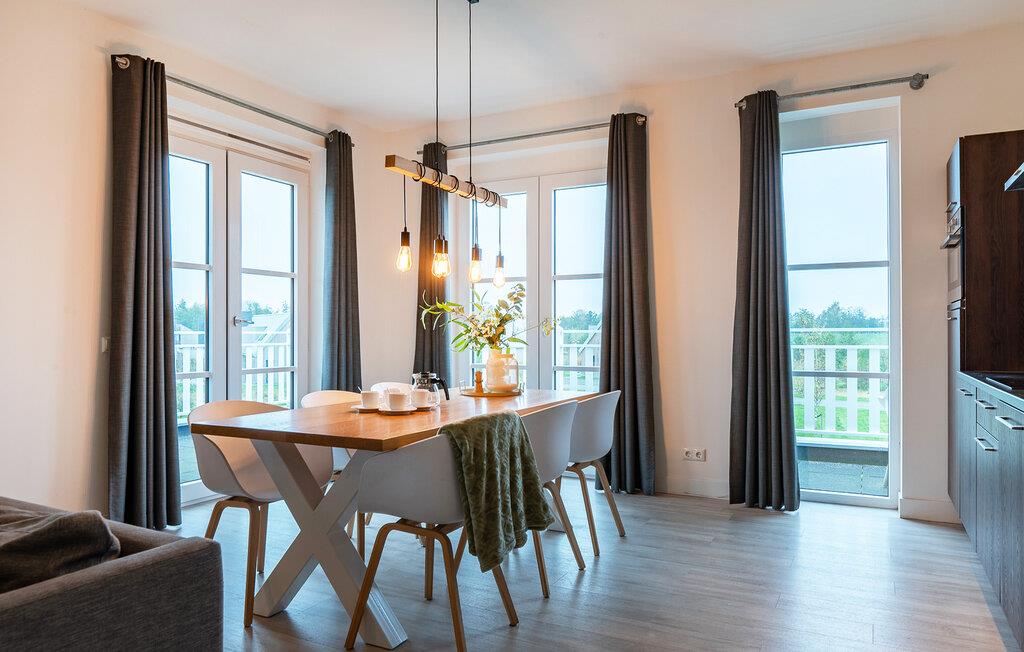Denna moderna och lyxiga semesterlägenhet i en elegant lägenhetsbyggnad erbjuder dig den perfekta platsen att varva ner på. De eleganta möblerna och den ljusa, maritima atmosfären skapar en lugn och inbjudande atmosfär. Här har du gott om utrymme för att känna dig som hemma med din familj eller vänner. Kom samman i det öppna vardagsrummet, som framgångsrikt kombinerar köket, matsalen och vardagsrummet och inbjuder dig att laga mat, äta eller koppla av tillsammans.