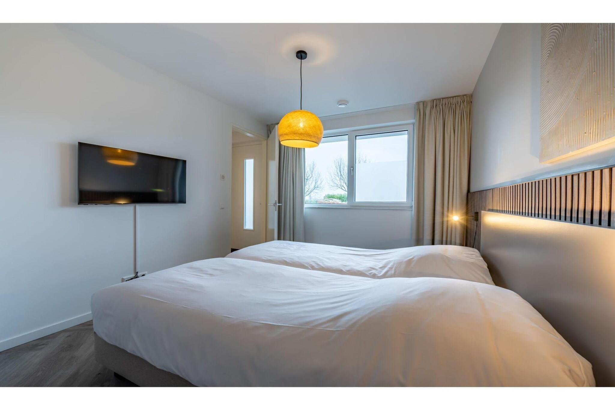 Nytt i uthyrningen av de lyxiga loftlägenheterna i Résidence Marina Kamperland! Lyx och komfort är av största vikt i dessa smakfulla och moderna loftlägenheter. Kombinationen av läget vid marinan, Veerse Meer och Nordsjöstranden gör dessa lägenheter unika. Den livliga småbåtshamnen och den kulinariska oasen brasseriet Blush, som ligger i komplexet, utgör den perfekta basen för en lyxig semester i Zeeland. Denna lägenhet ligger på första våningen och är utrustad för 4 personer. Entrén ger tillgång till två sovrum med två enkelsängar, varav ett med TV. Vid ankomst ser vi till att sängarna är nybäddade åt dig. Det moderna badrummet är utrustat med duschkabin och dubbla handfat. Det finns en separat toalett i korridoren. Det snyggt inredda vardagsrummet har en bekväm sittgrupp och en Smart TV med utländsk kanal. Från vardagsrummet har du tillgång till den rymliga terrassen i söderläge med bekvämt loungeset och mysigt barbord. Här kan du njuta av den vackra utsikten över den livliga småbåtshamnen och Veerse Meer till de sena timmarna. Det rymliga lyxköket är utrustat med komfortutrustning, inklusive induktionshäll, kyl med frysfack och Nespressomaskin. En tvättmaskin och torktumlare finns till ditt förfogande i förrådet, samt en spjälsäng och en barnstol. Det finns plats för dina (el)cyklar i förrådet utanför. Husdjur är inte tillåtna i denna lägenhet. Det finns två Ecotap-laddningsställen för att ladda din elbil på Résidence Marinas parkering och på marinans allmänna parkering. Laddstationen kan användas mot betalning med hjälp av laddkort.