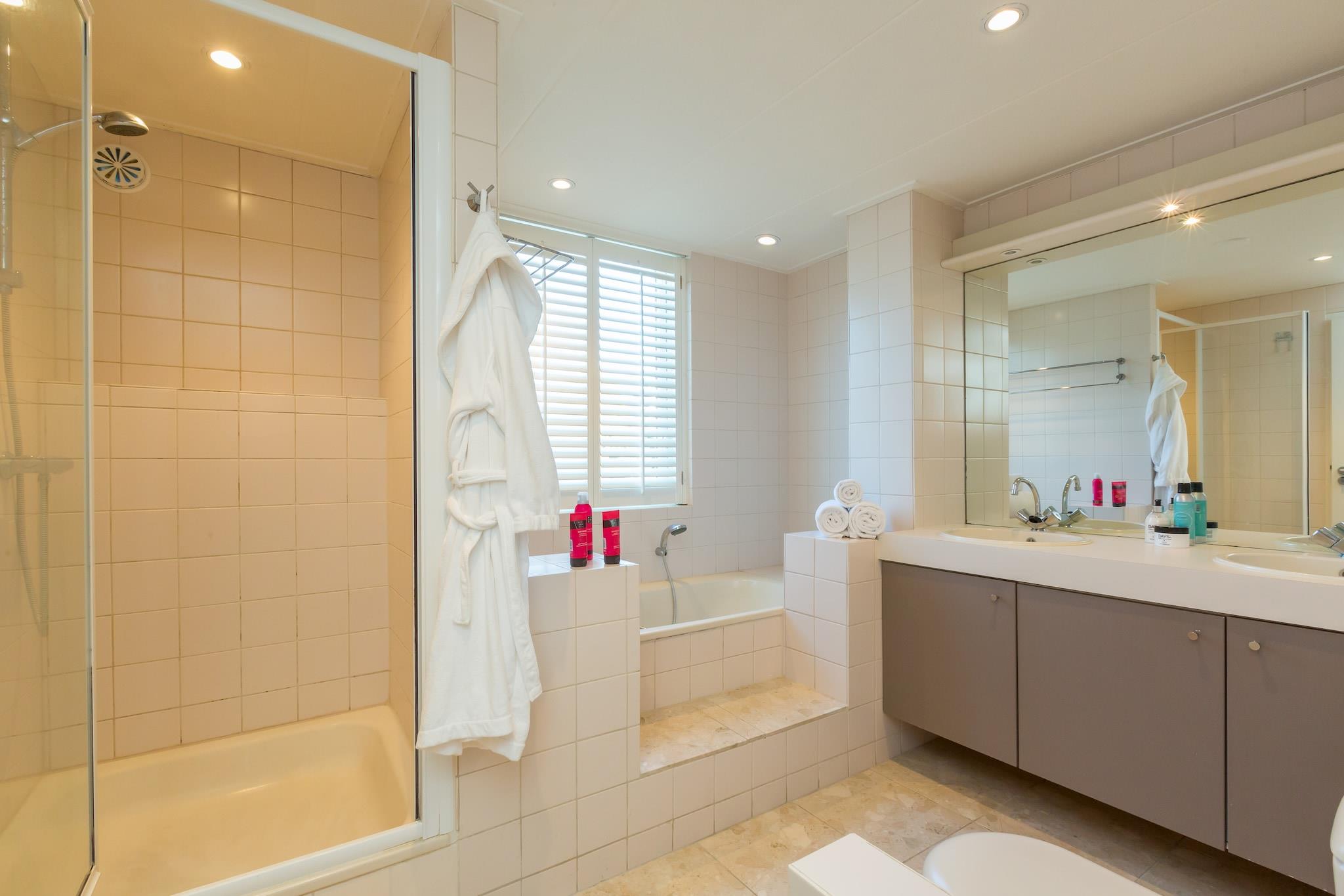 Bottenvåningen: (Hall, sovrum(våningssäng), sovrum(enkelsäng), Bedroom with bathroom(dubbelsäng, badkar, dusch, handfat, handfat, toalett ), Bedroom with bathroom(enkelsäng, enkelsäng, dusch, handfat), förråd(kyl och frys, torktumlare, tvättmaskin)) På våning 1: (Vardagsrum(TV(platt-tv, Holländska TV-kanaler, Tyska TV-kanaler, Internationella TV-kanaler), öppen spis, sitthörna), öppet kök(matbord, Kokplattor(induktion), vattenkokare, Fläkt, kaffebryggare(koppar), kombi ugn/mikro, diskmaskin, kylskåp), toalett ) fransk balkong, balkong, trädgård(privat, inhägnad), cykelförvaring, trädgårdsmöbler, parkering