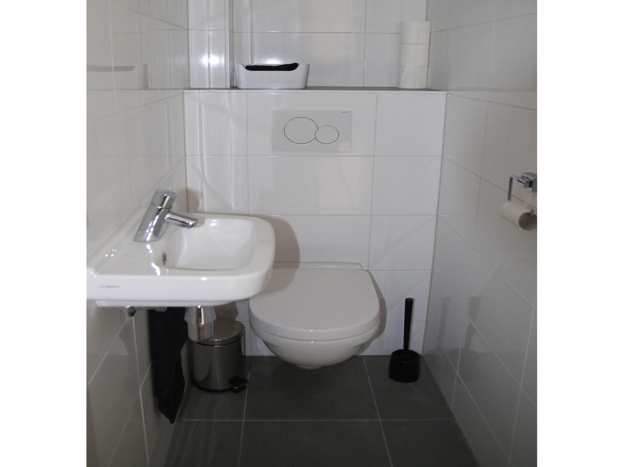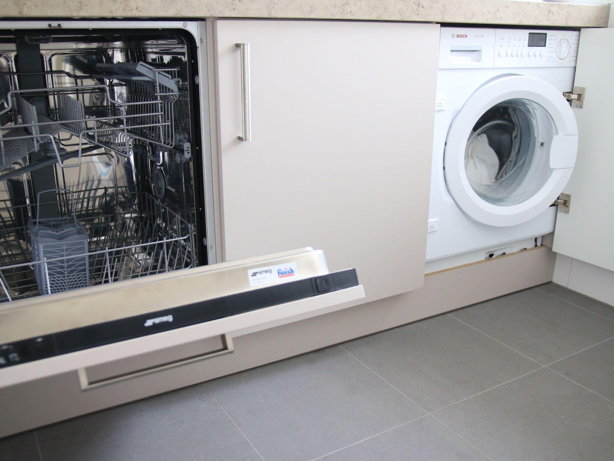 There are two bedrooms, one with a double bed and a wardrobe and the other with two comfortable single beds. There is a bathroom with shower and washbasin and a separate toilet. The kitchen is fully equipped and has a dishwasher and there is also a washing machine.