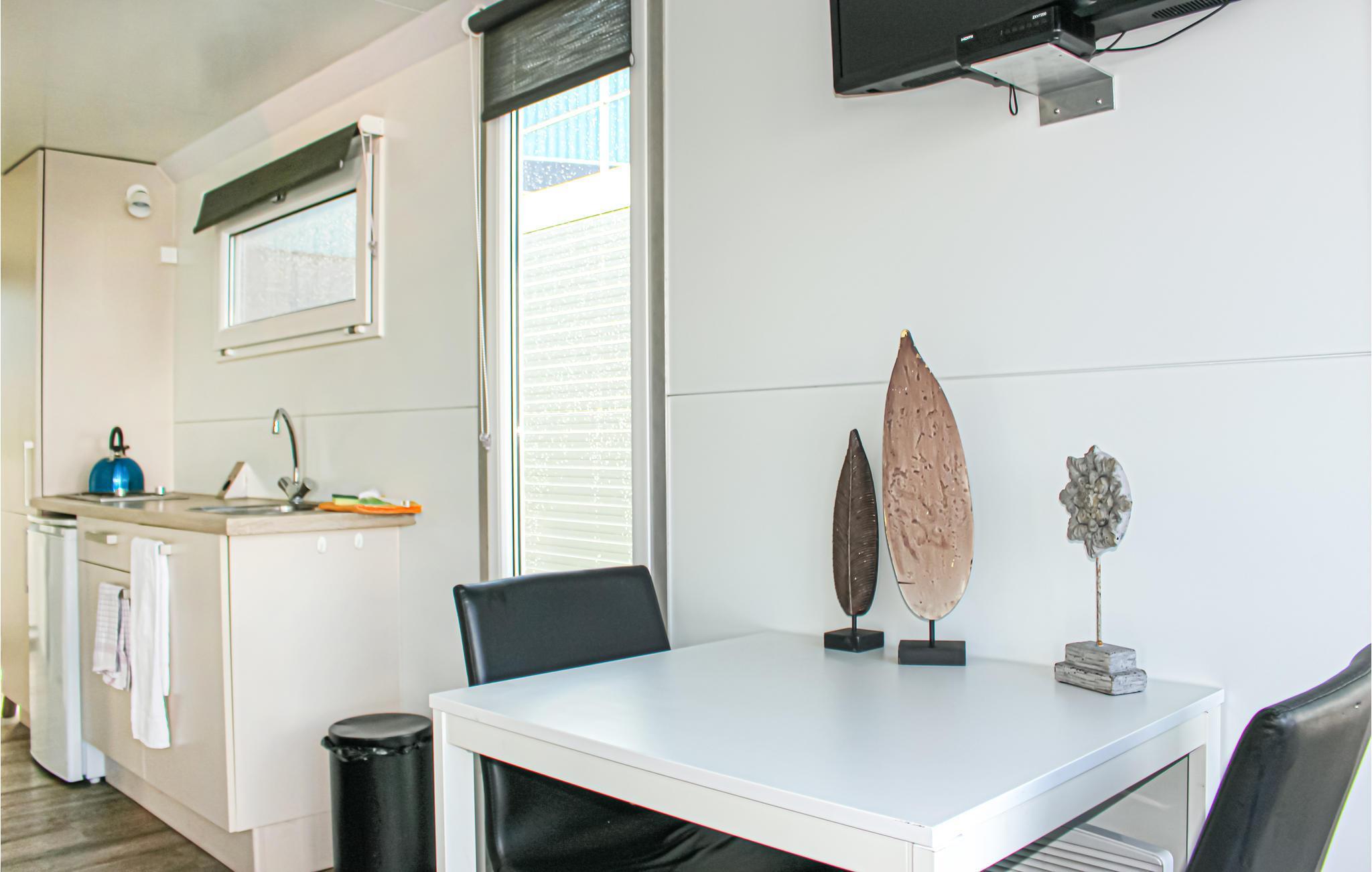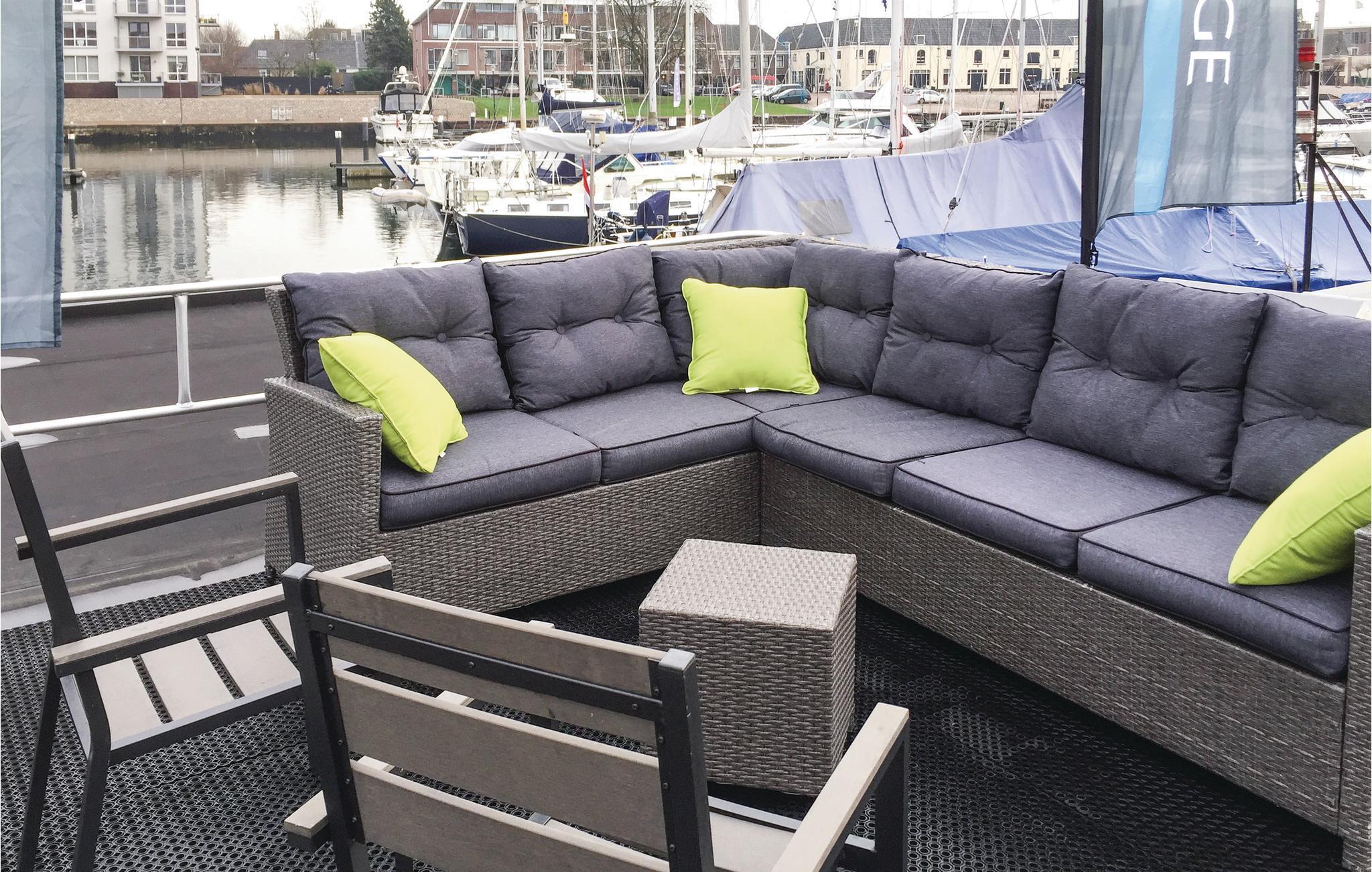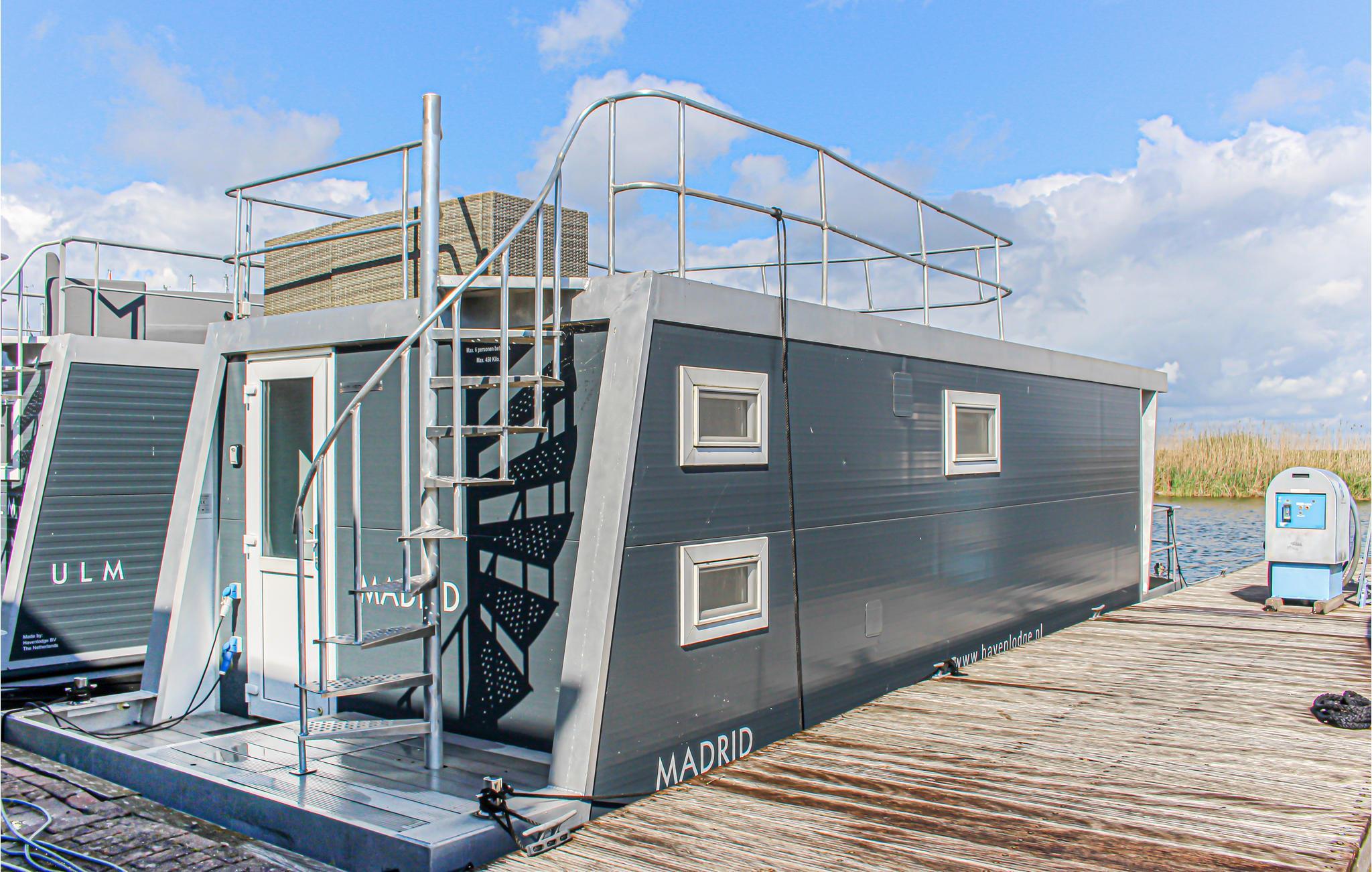 Njut av Flevolands polder i din husbåt. Köket är utrustat med en elektrisk spis, ett kylskåp med frysfack och en Dolce Gusto-kaffemaskin. Njut av den nedåtgående solen på takterrassen.