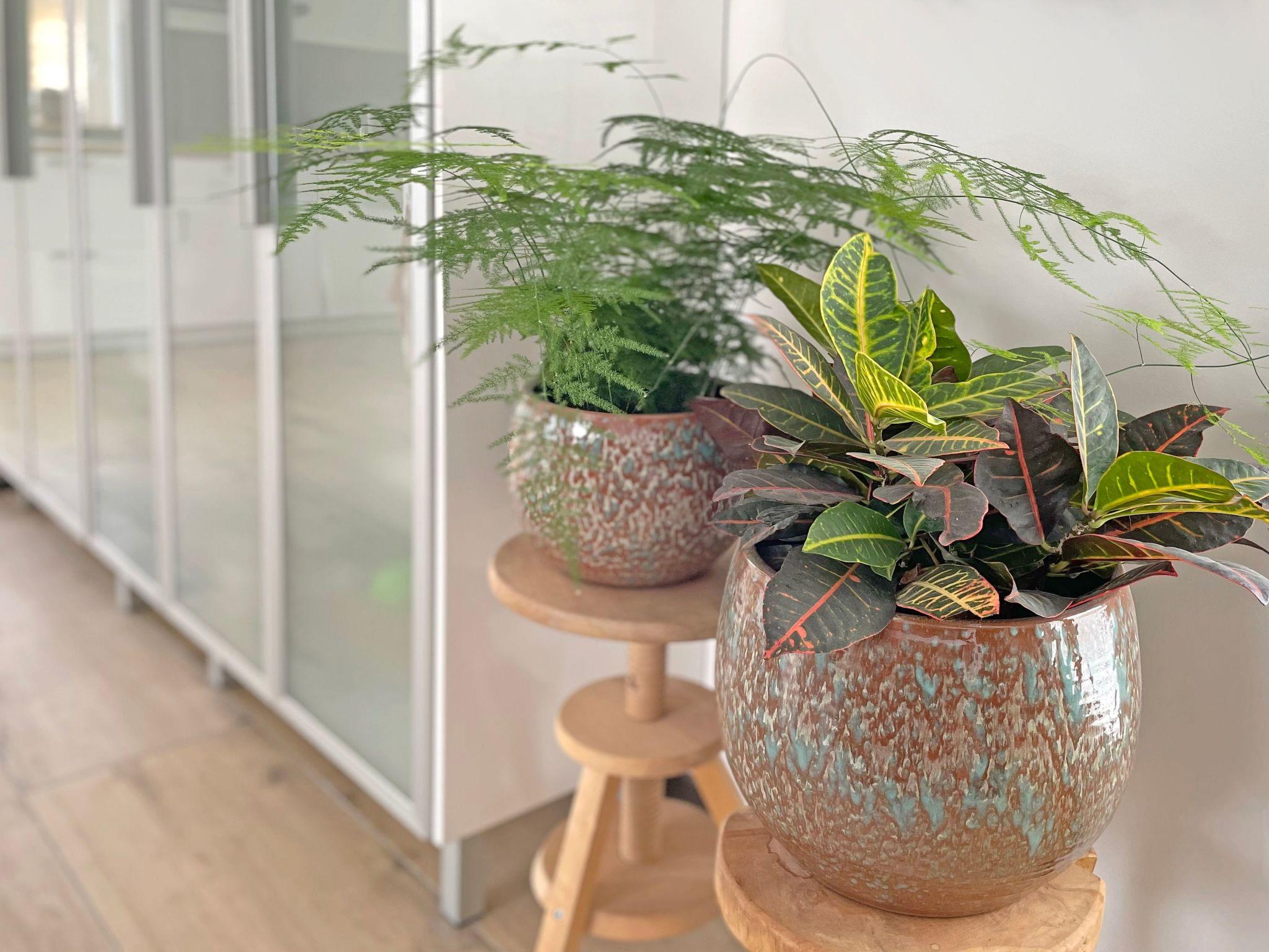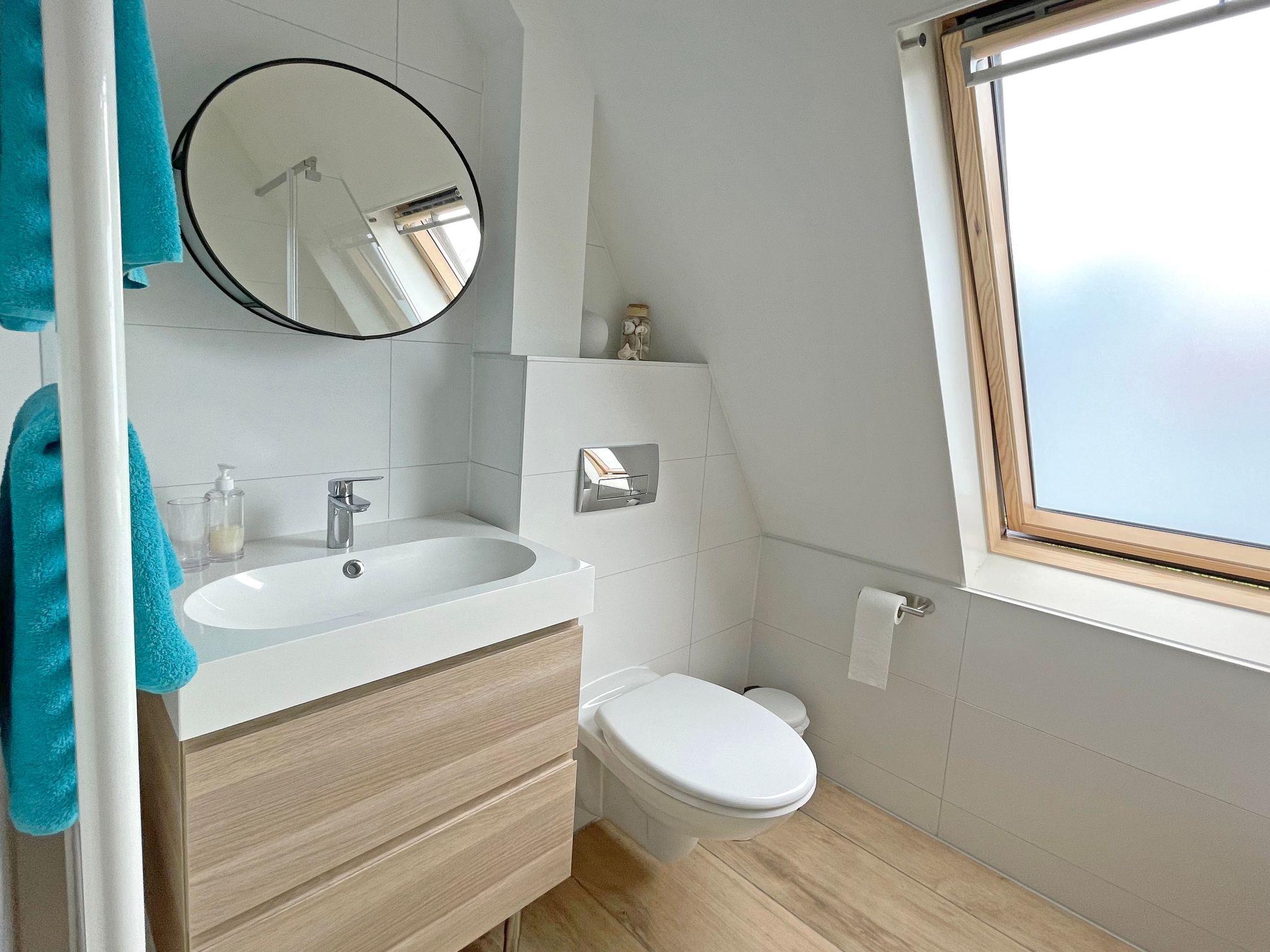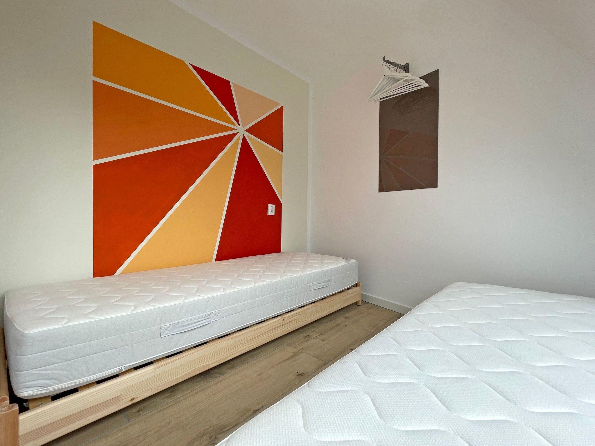 The staircase leads to the upper floor, where there are two bedrooms, both with tasteful walls. The first bedroom is furnished with a double bed and the second bedroom with two single beds. The bathroom has a washbasin, a shower and a toilet.