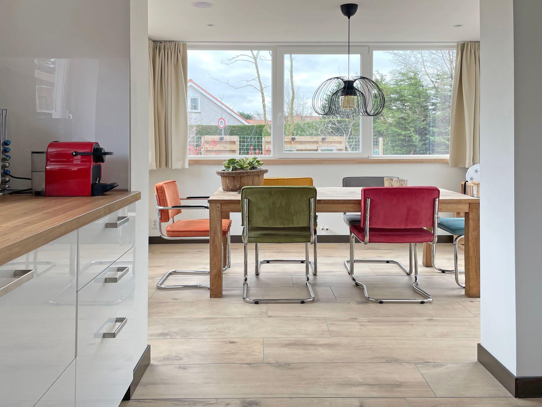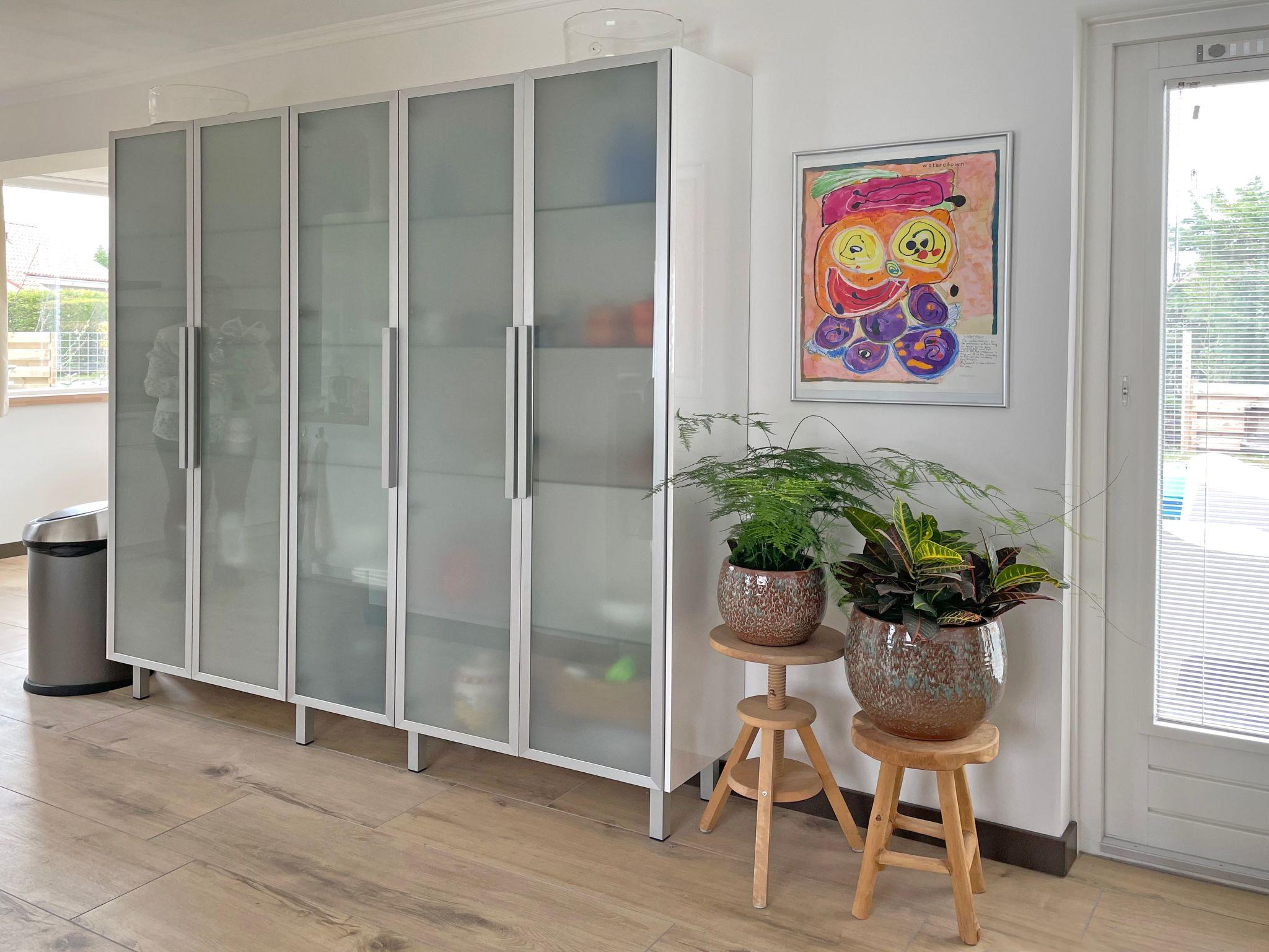 The holiday home is flooded with natural light through the many large windows and brings the feeling of being outdoors. The living room is comfortably furnished with a sofa and two armchairs. The dining table is located in the extension built in 2022 with windows all around and the best view outside.