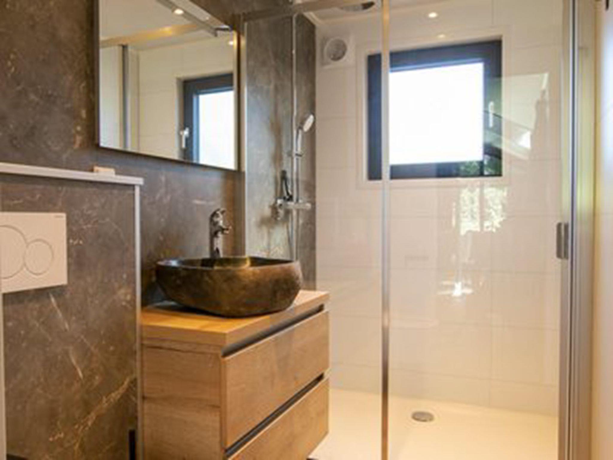 "Pool Lodge", 4-room villa 70 m2. Comfortable furnishings: living/dining room with dining table and flat screen. Exit to the terrace, to the swimming pool. 1 room with 1 double bed. 2 rooms, each room with 2 beds. Open kitchen (4 hot plates, dishwasher, kettle, electric coffee machine, combination microwave). Shower/WC, sep. WC. Heating, underfloor heating. Terrace. Terrace furniture, deck chairs. Facilities: washing machine, dryer. Internet (WiFi, free). Parking at the house. E-charging station. Please note: non-smoking house. Smoke alarm.